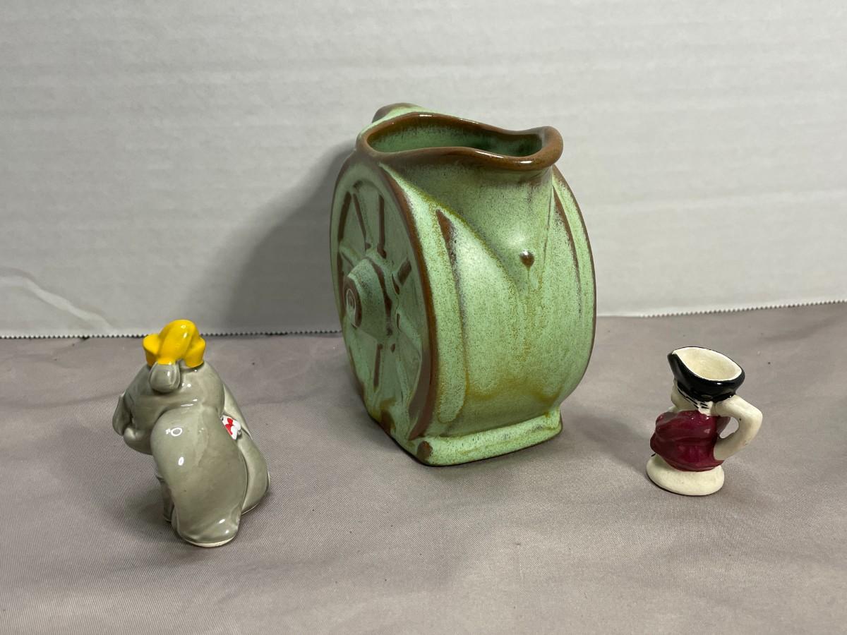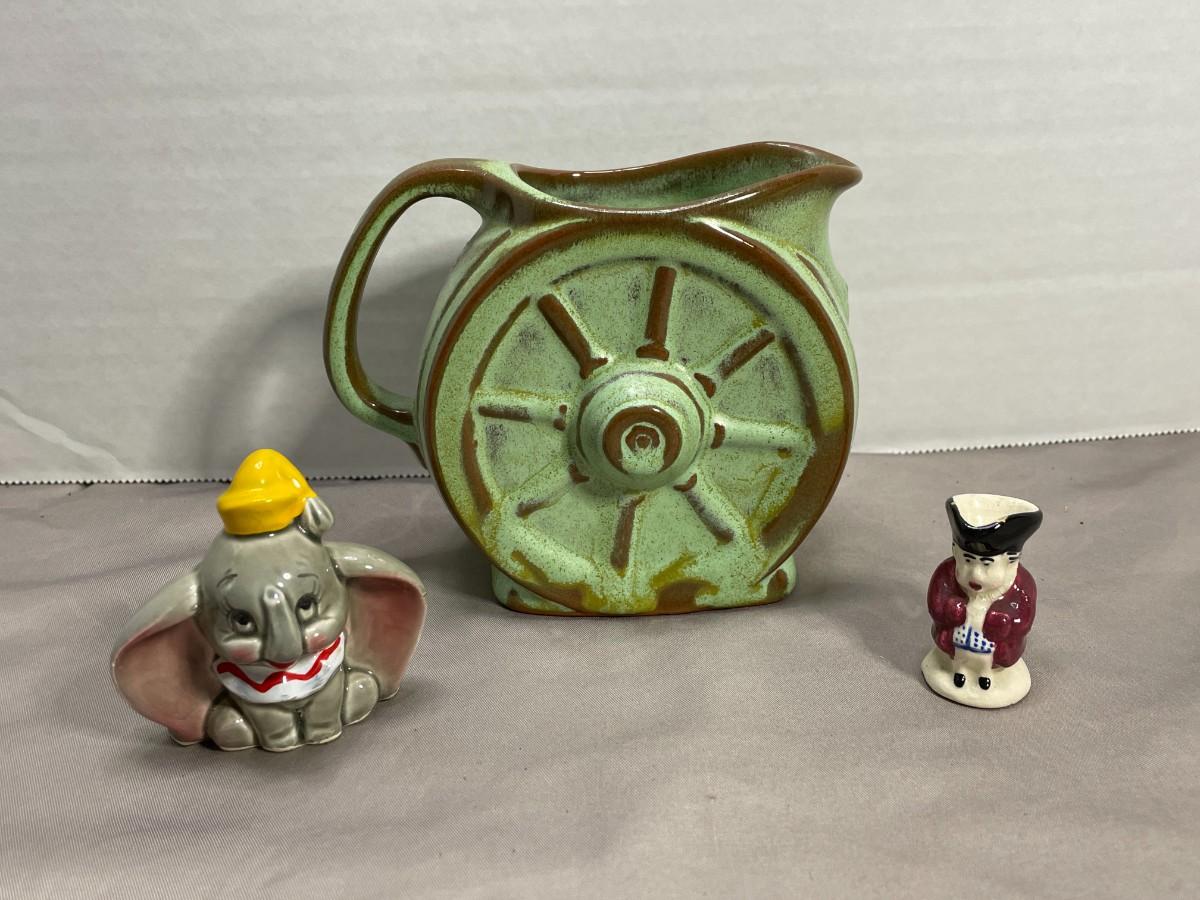 Dumbo Figurine, Mini Toby Pitcher, and Frankoma Wheel Creamer