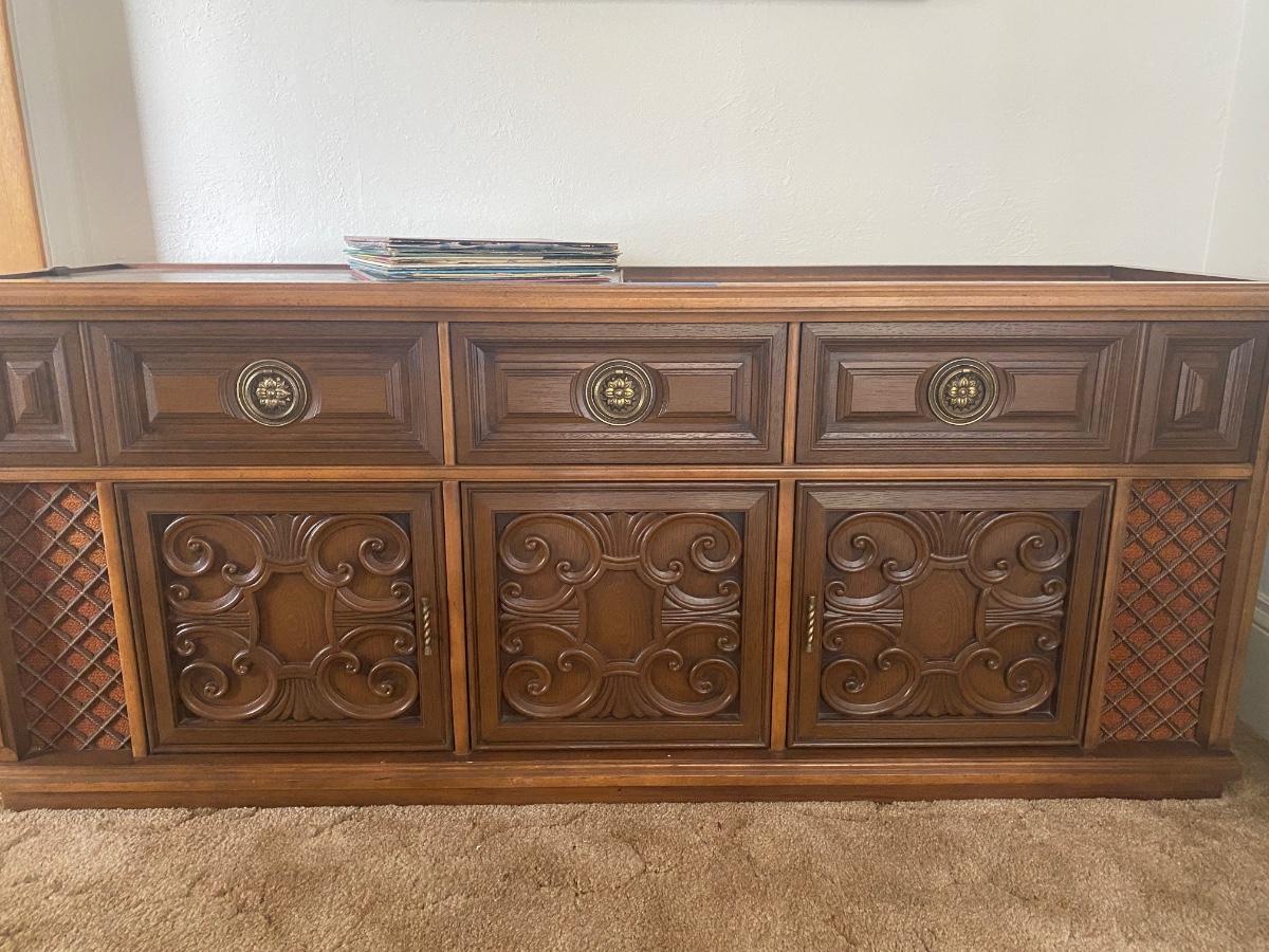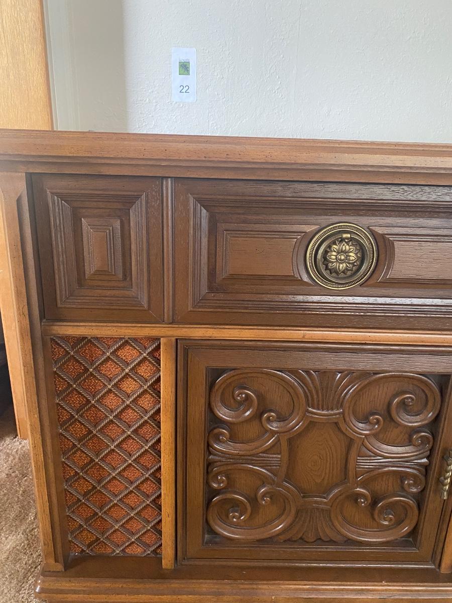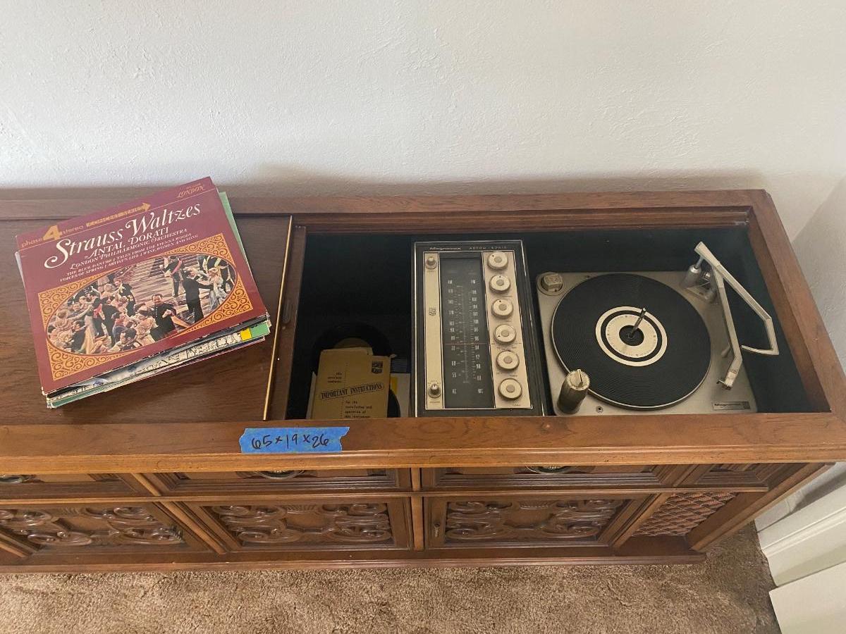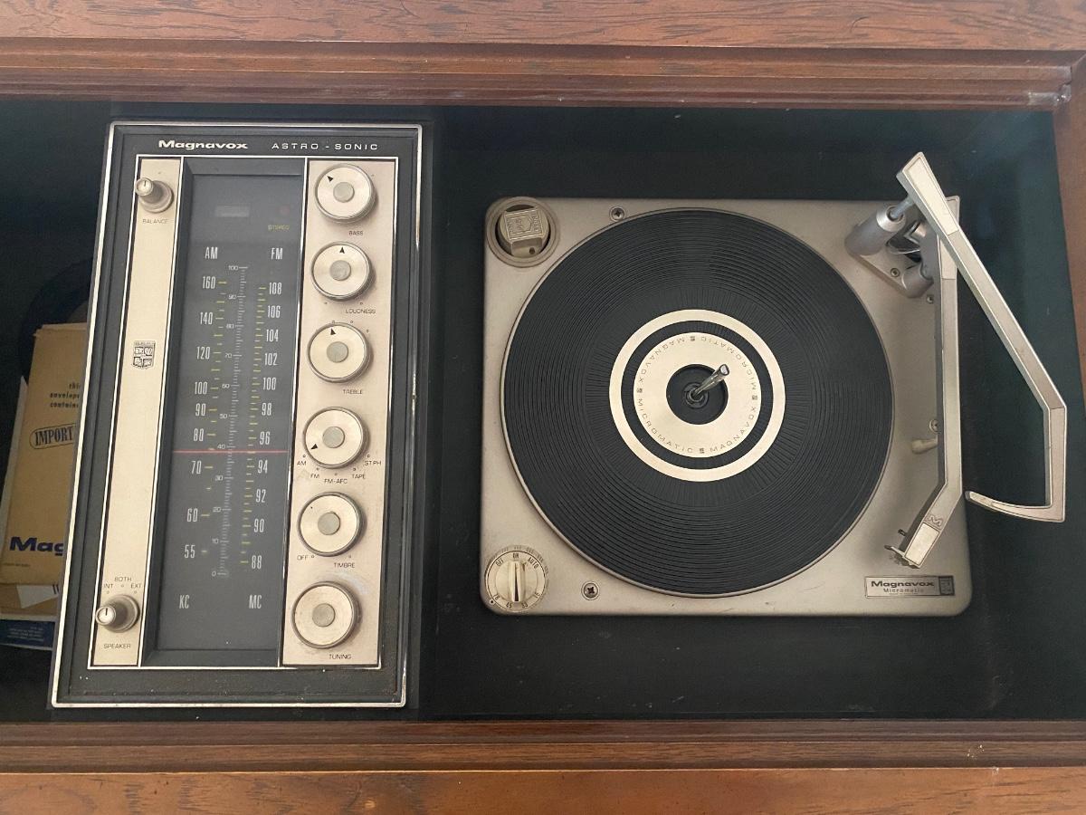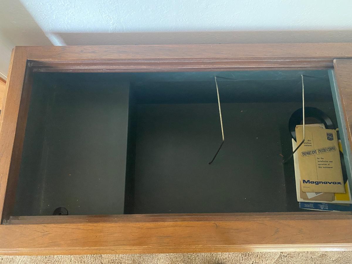 Top slides open on either side. Record player on one side. Stroke age on the other. Has not been tested. 65x19x26. Comes with a stack of records