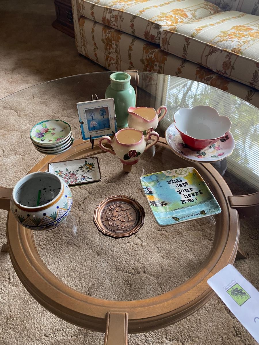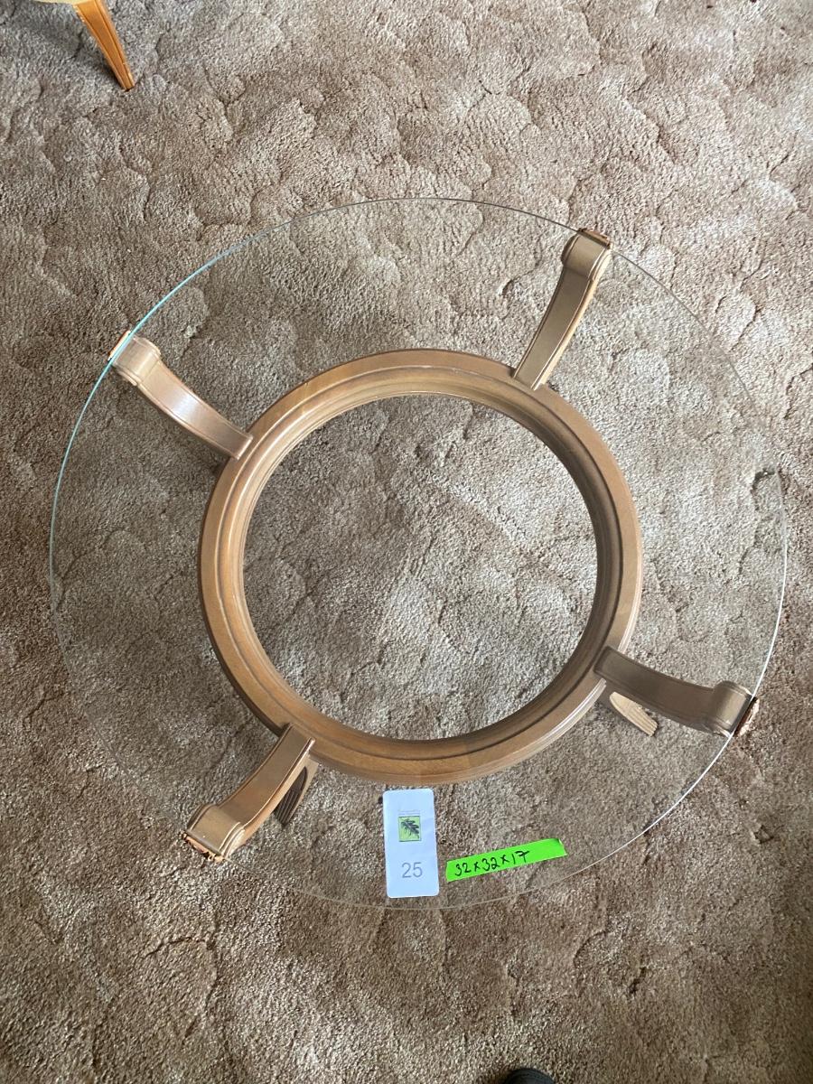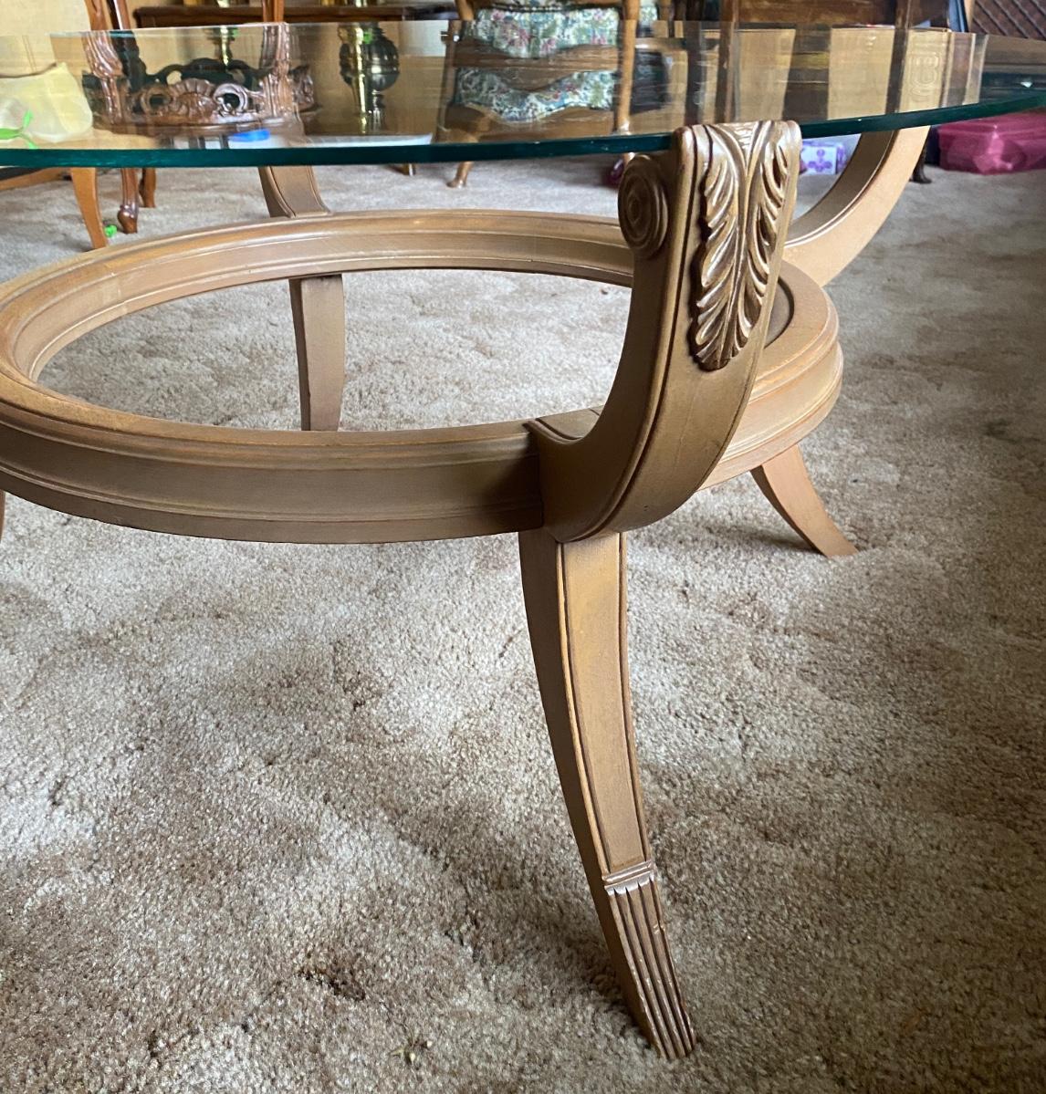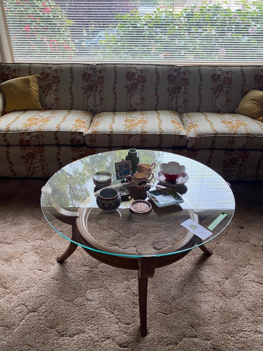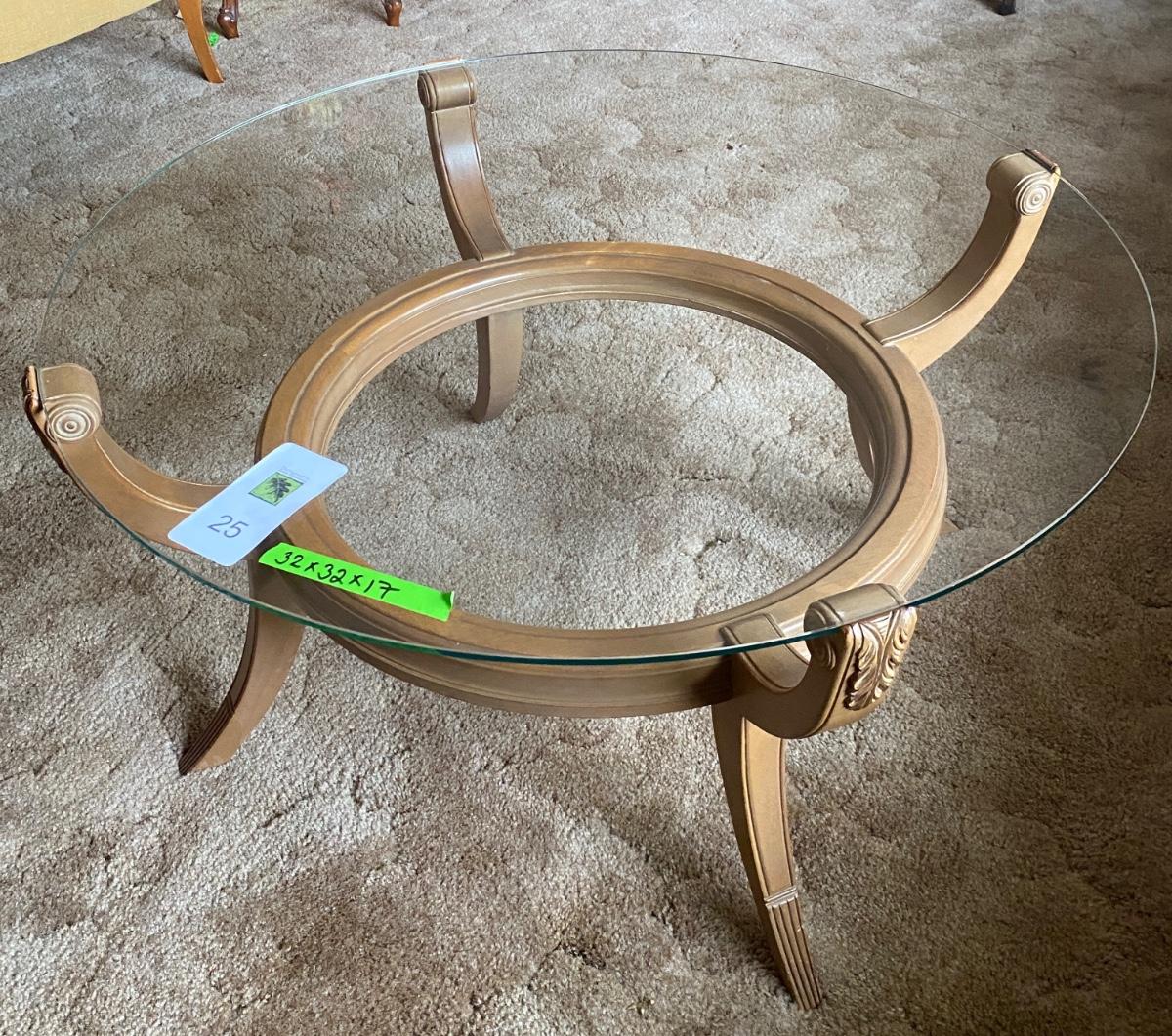 Round MCM coffee table (32x32x17). Legs have carved detail. Also comes with lot of various accents