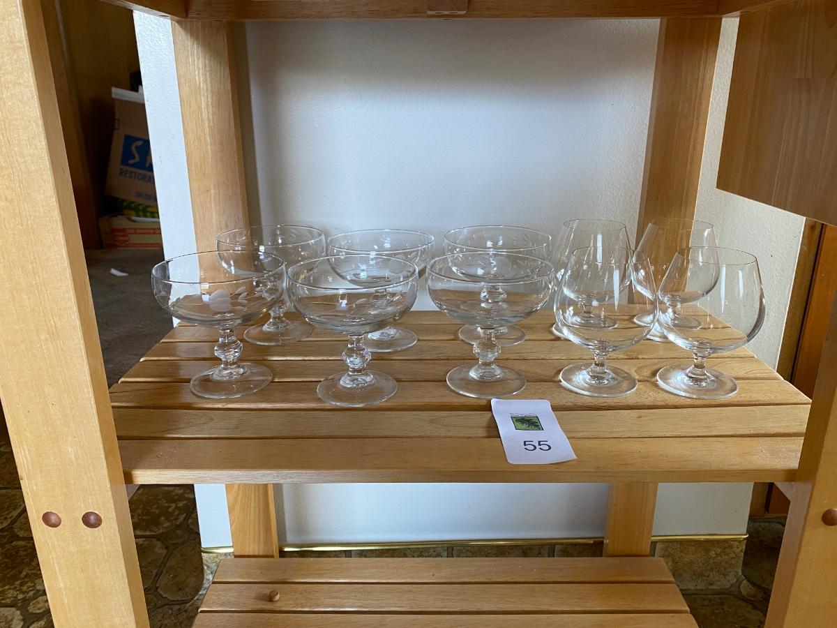 Dessert cups have pretty etched design. There are 6. Also includes some brandy snifters. No damage.