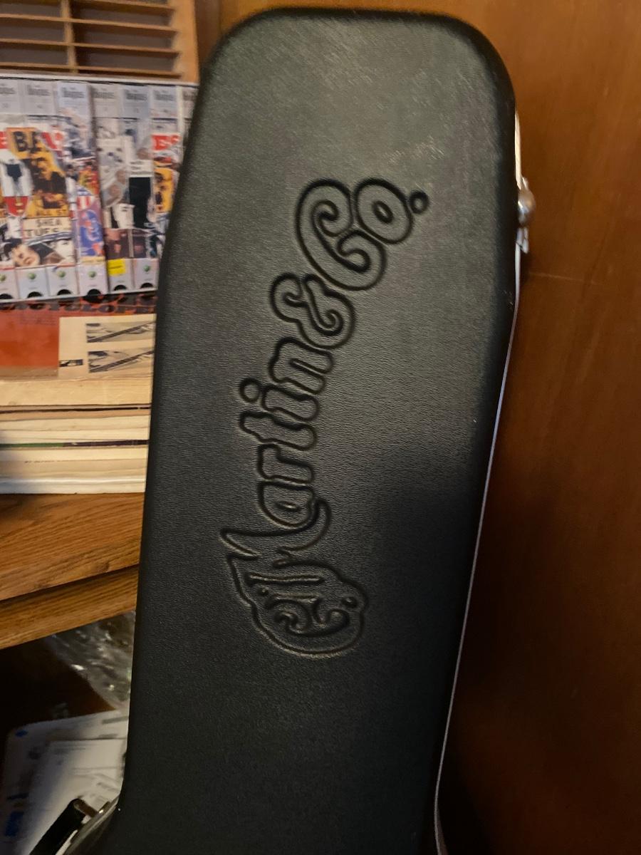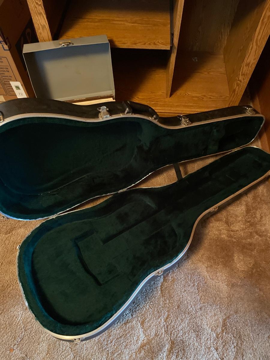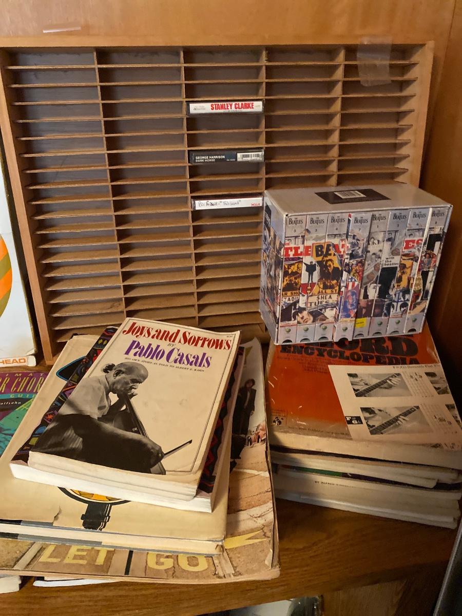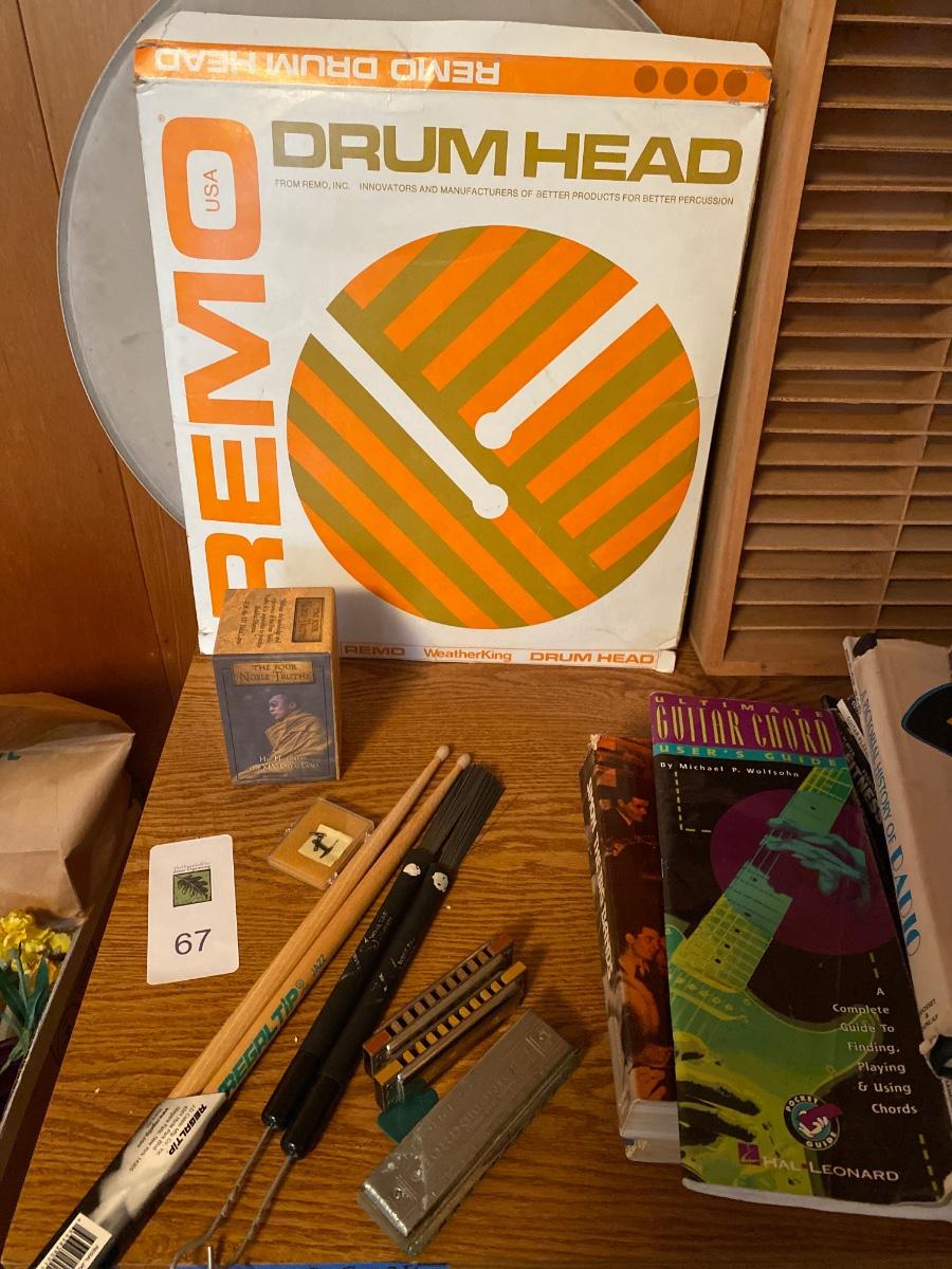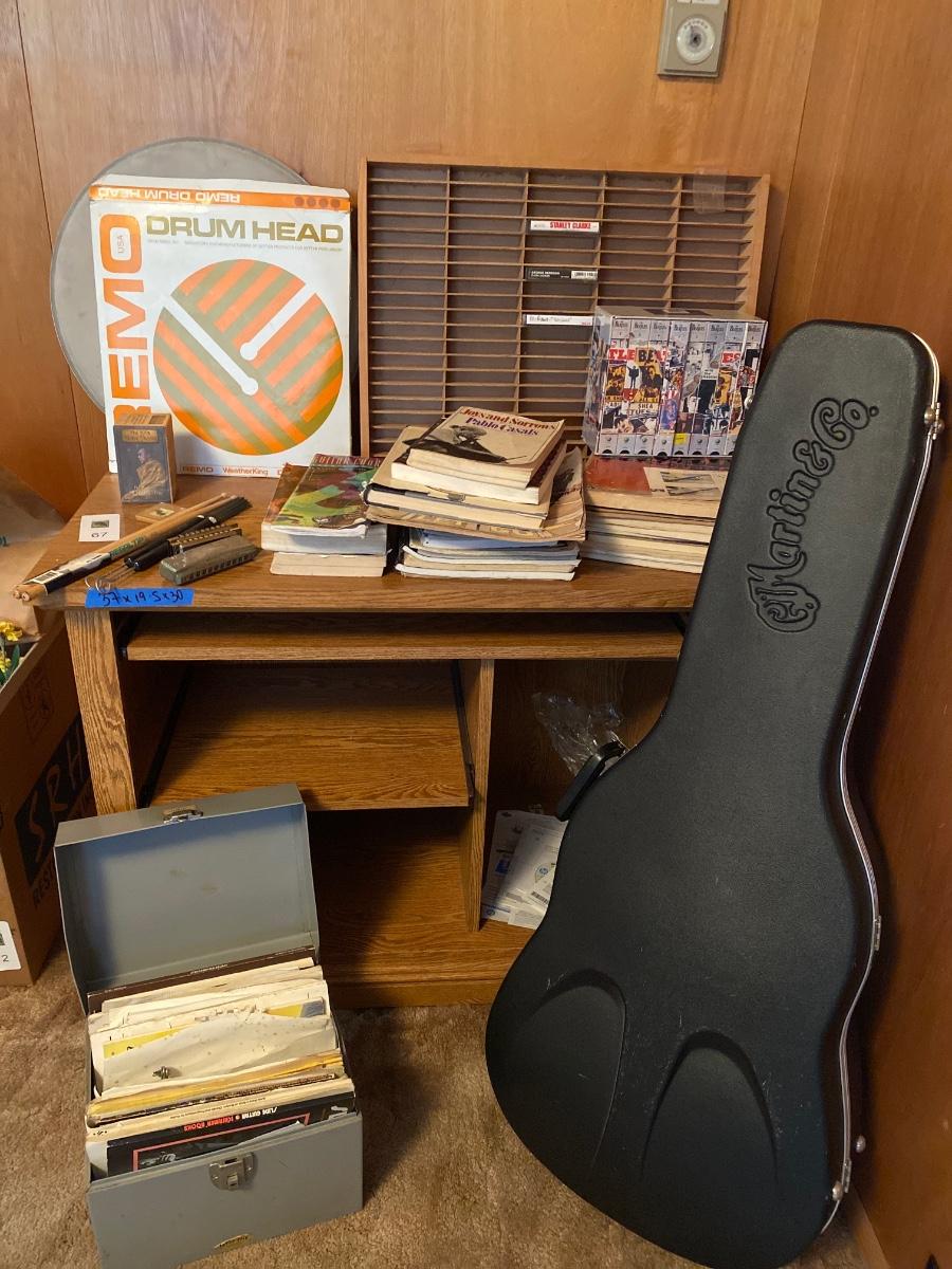 Martin and Co. guitar case (no guitar) drum sticks, harmonicas, drum head, various music books, wooden cassette holder, set of Beatles DVD, and desk.