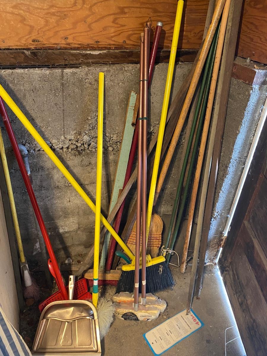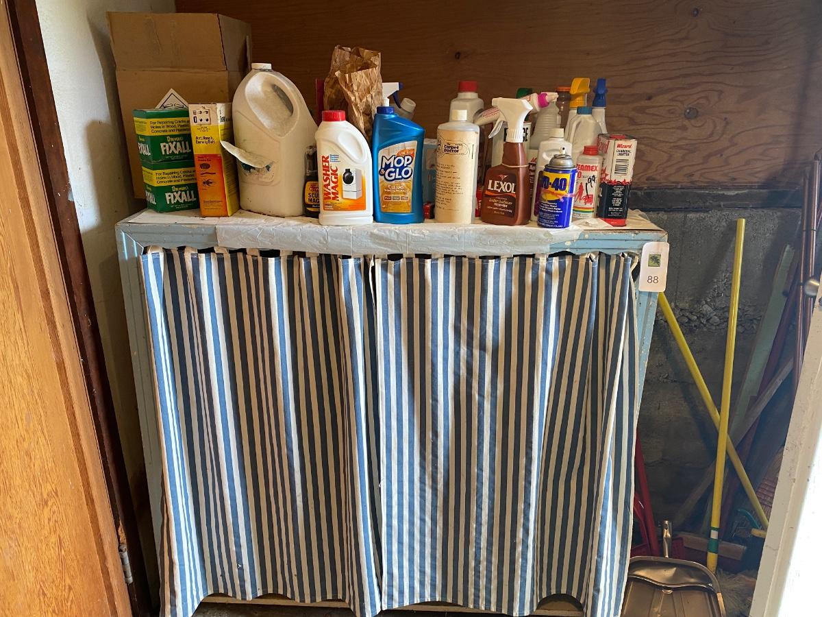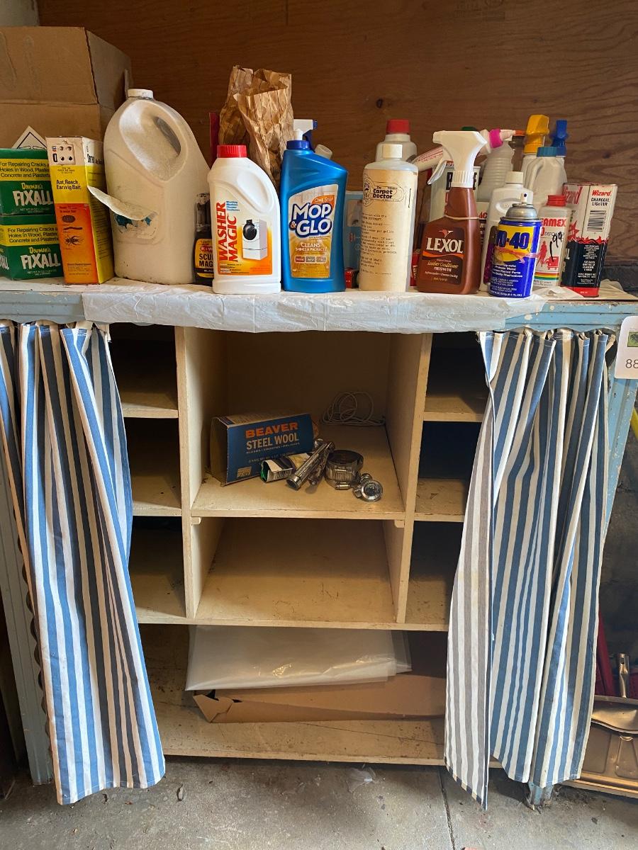 Vintage wooden cabinet with curtains. Cabinet has shelves. Cabinet is 44x21x42. Included in lot are household supplies such as Mop&Glo, Wd“”40, Lime Away plus more. Comes with mops and brooms.