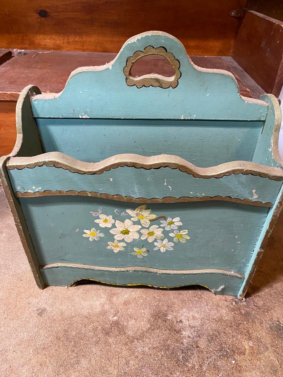 Wooden toy cheat is 36x18x18. Magazine rack is hand painted and is 16x10x15