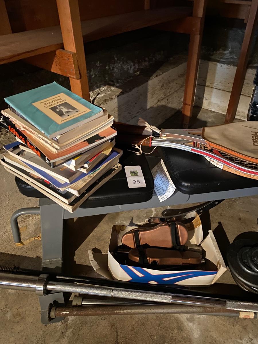 Large lot of exercise equipment. Includes weight bench (48x16x19) with bar and barbells, hand weights, weight lifting belt, vintage tennis rackets, exercise books and a vintage Schwinn Exerciser (44x44).