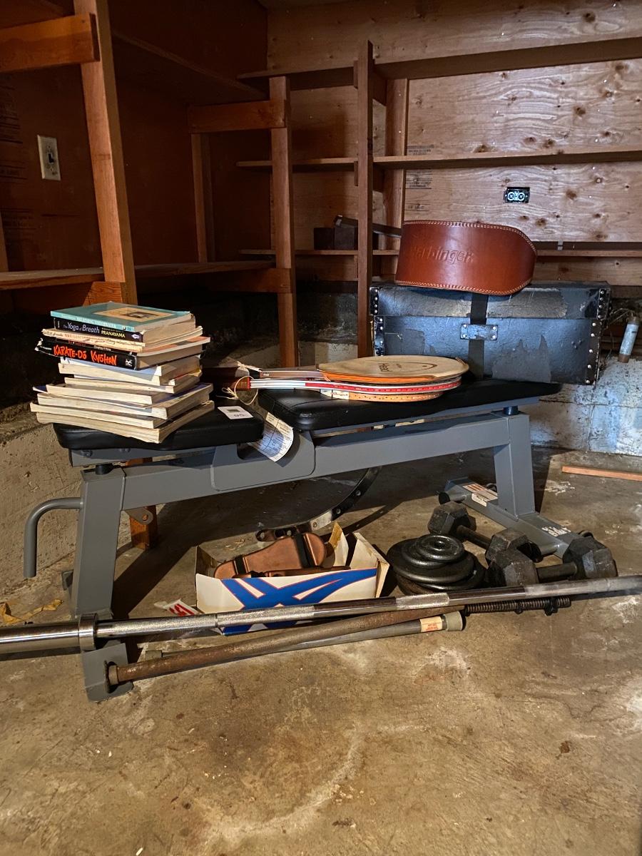 Weightlifting bench, vintage Schwinn Exerciser, and  more
