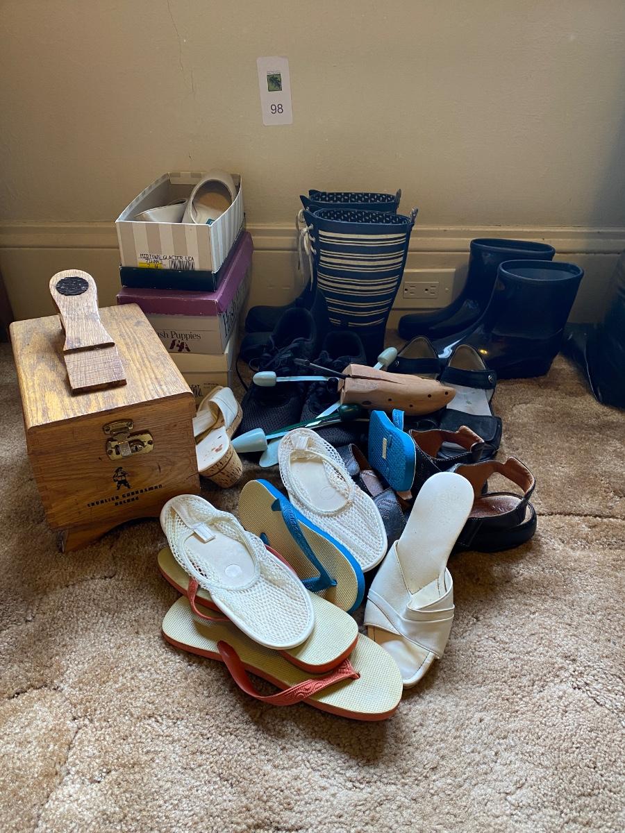 Collection of shoes and vintage shoe shining kit