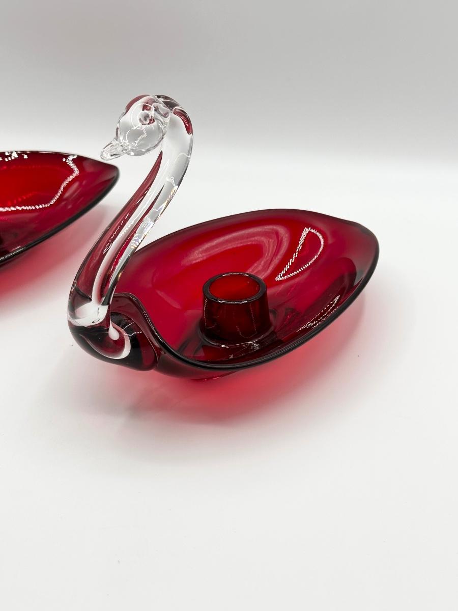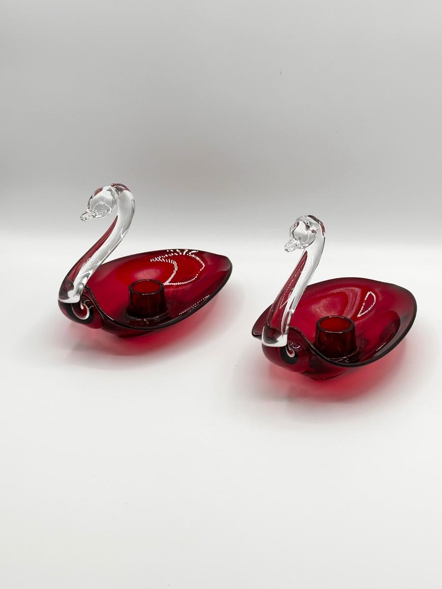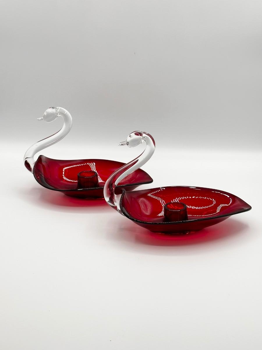 DUNCAN & MILLER ~ Pair (2) Ruby Open Swan Candlesticks