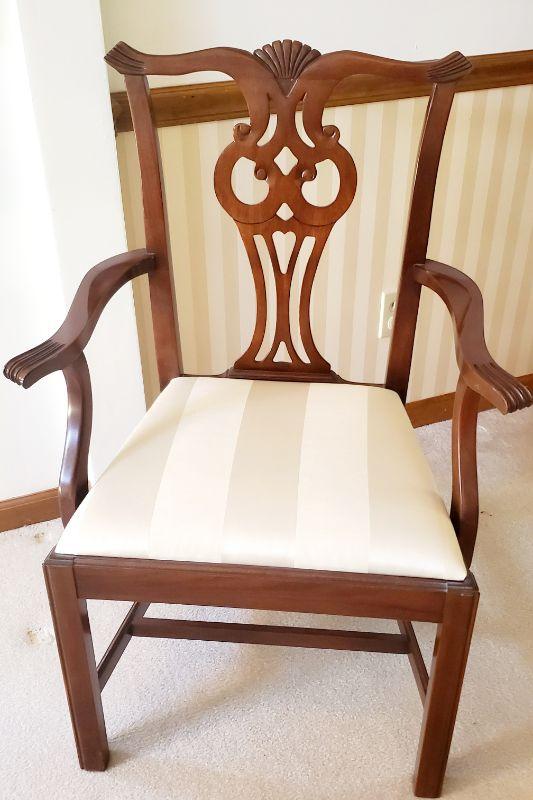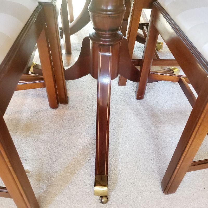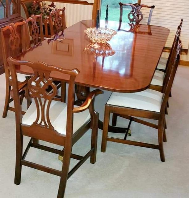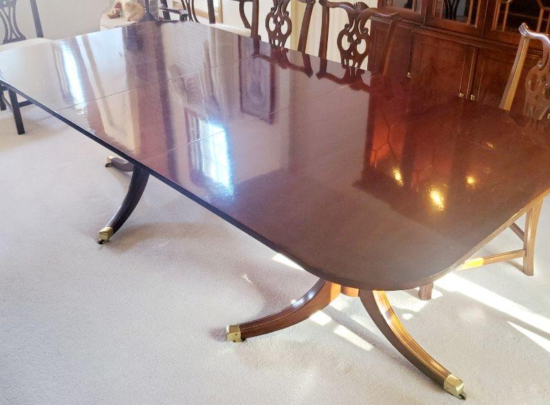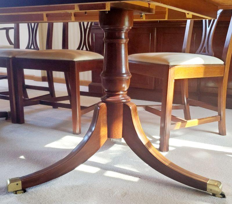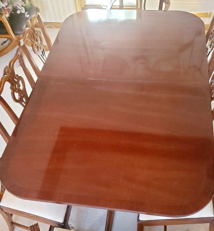 mahogany double pedestal federal style w/ chippendale chairs Includes 2 beautiful leaves and a table cover.