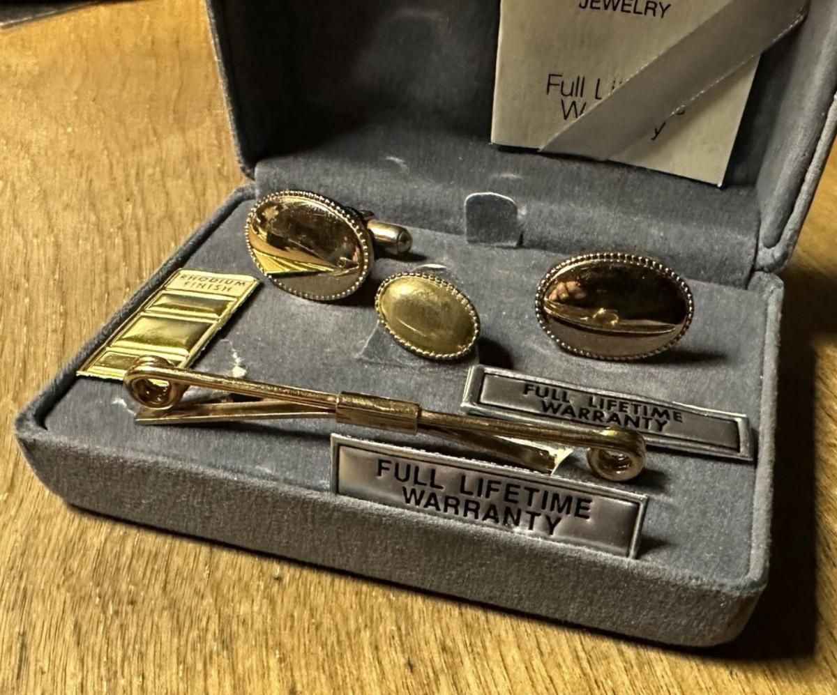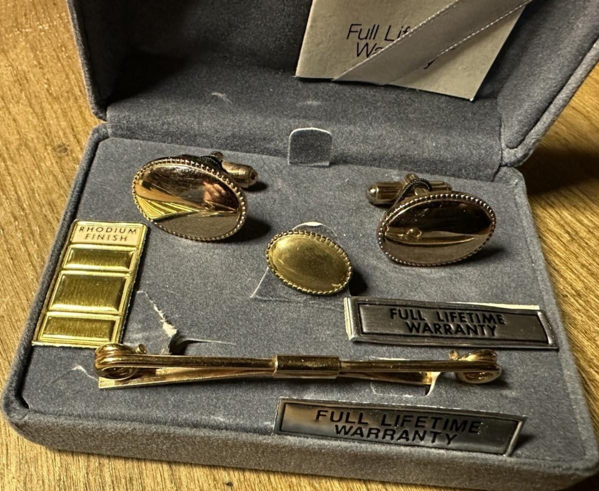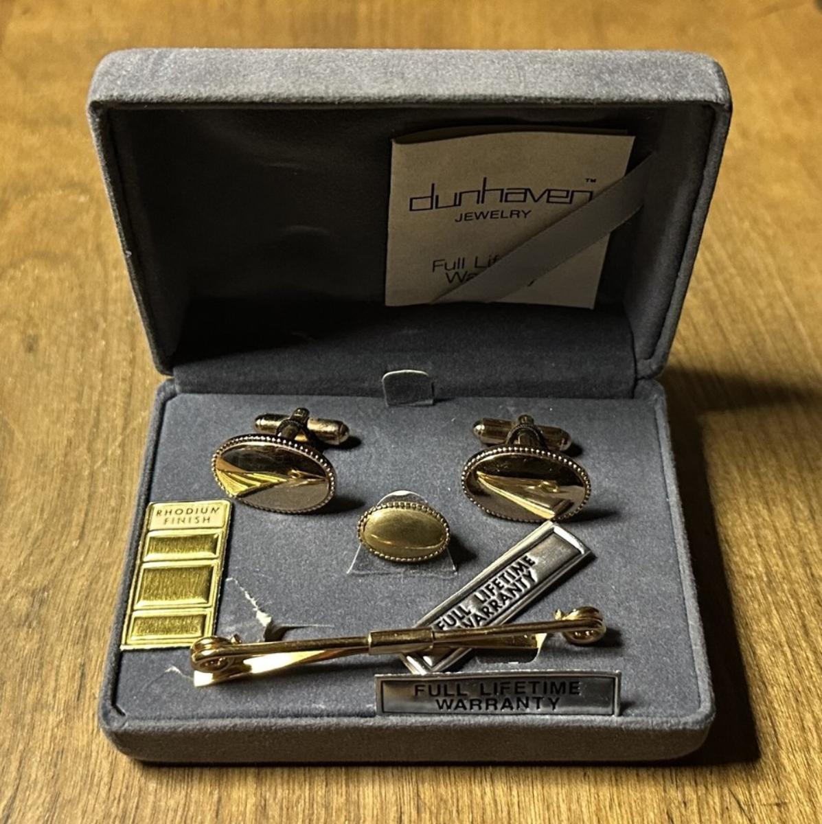 vintage set of men's furnishings from Dunhaven Jewelry..Gold-tone..Rhodium finish..Slightest use...Cufflinks..Tie tack and collar stays...in original felt covered display box.
