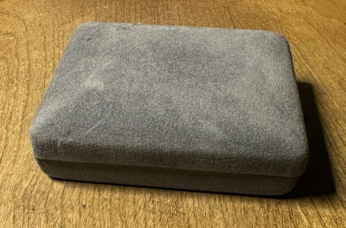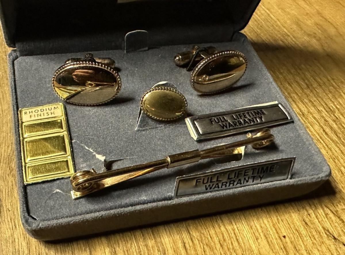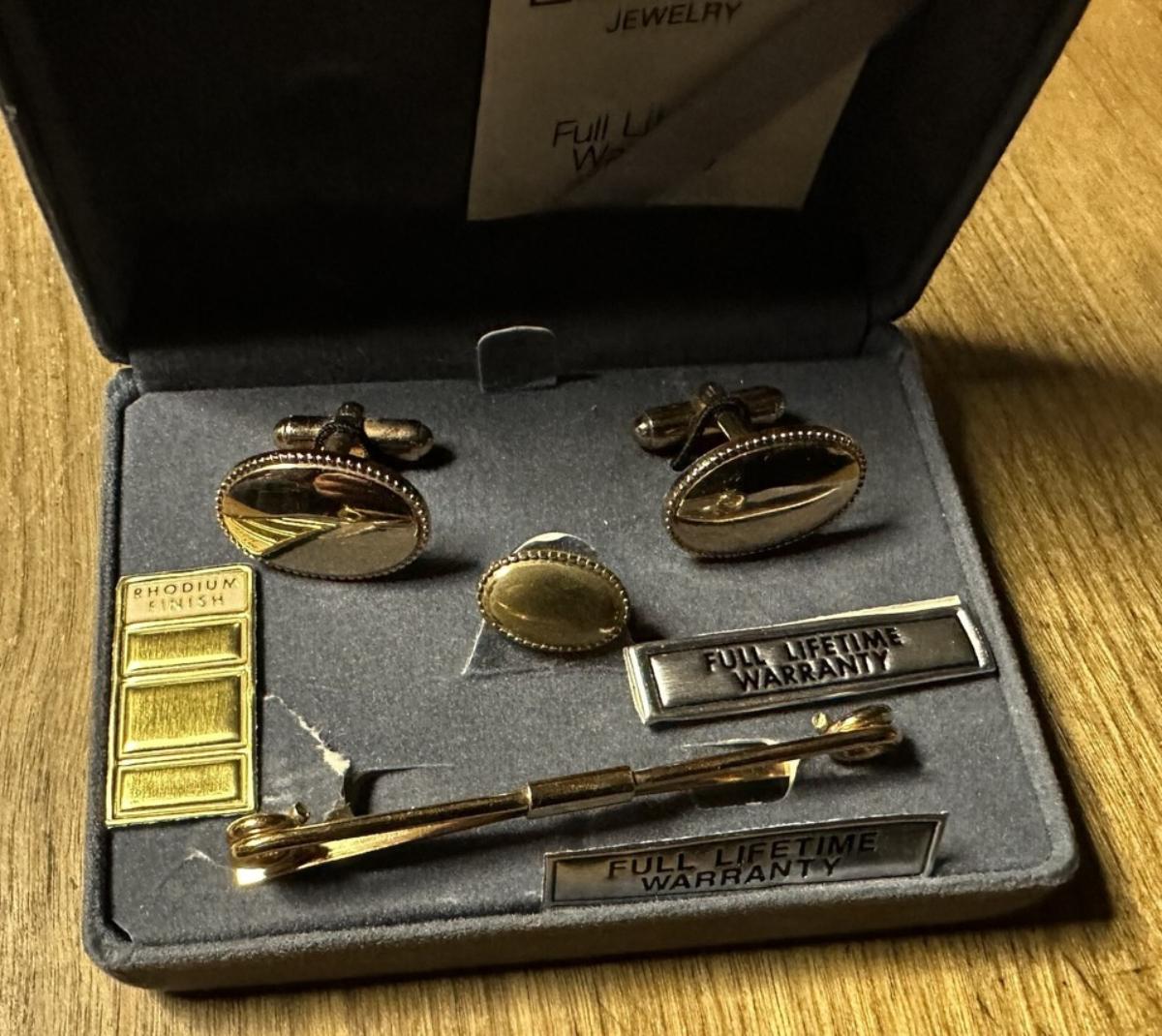 vintage set of men's furnishings from Dunhaven Jewelry..Gold-tone..Rhodium finish..Slightest use...Cufflinks..Tie tack and collar stays...in original felt covered display box.