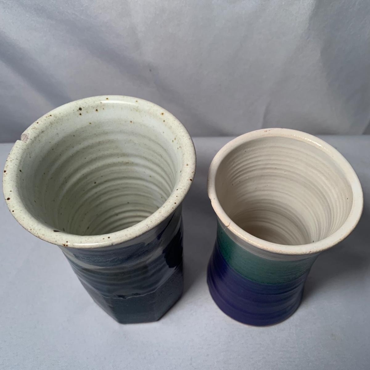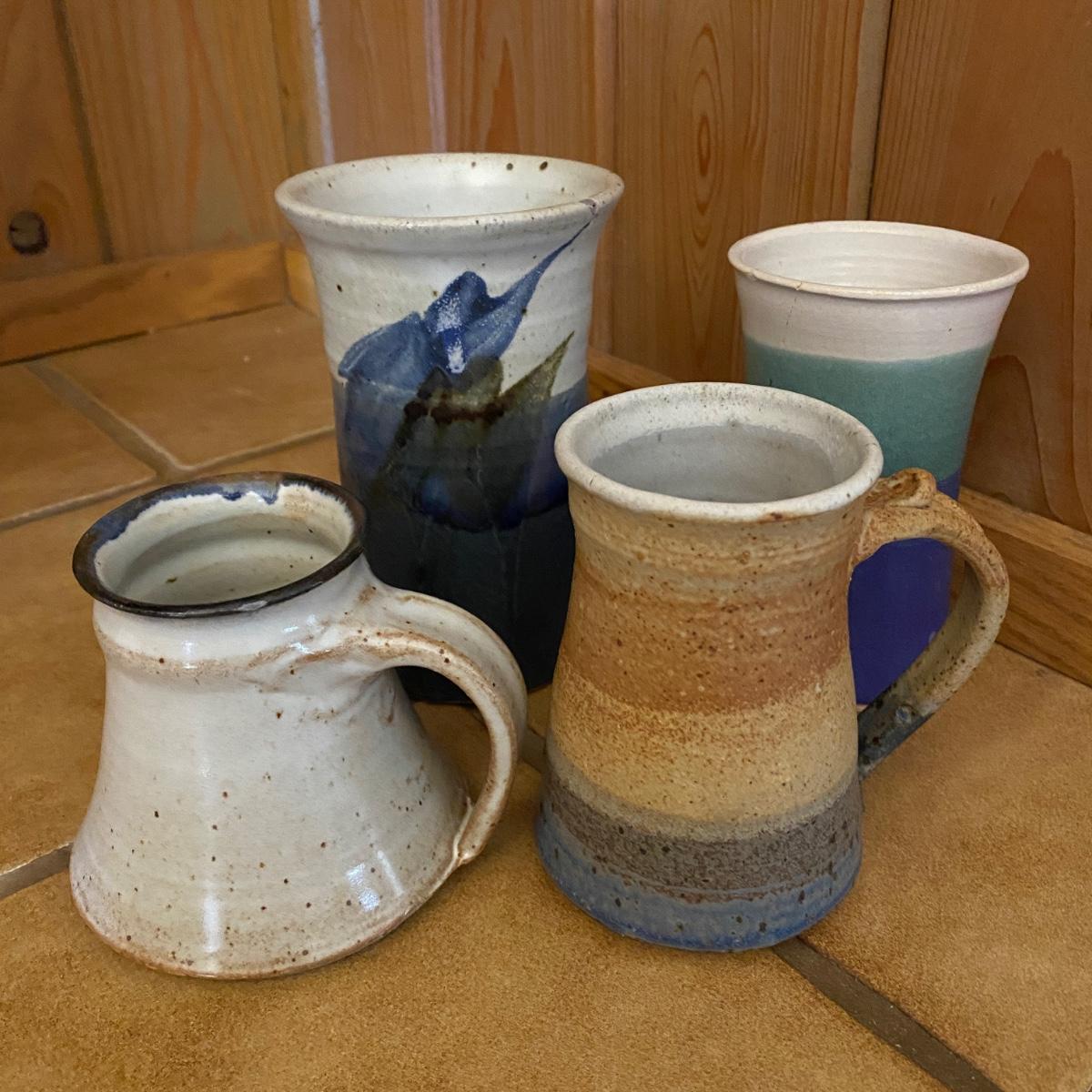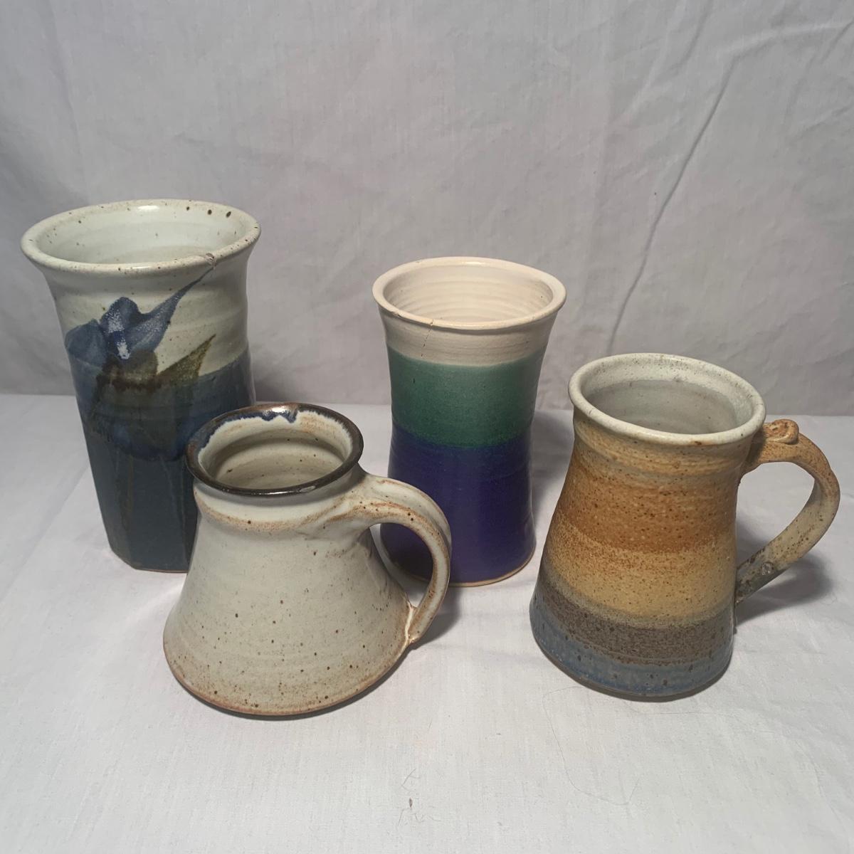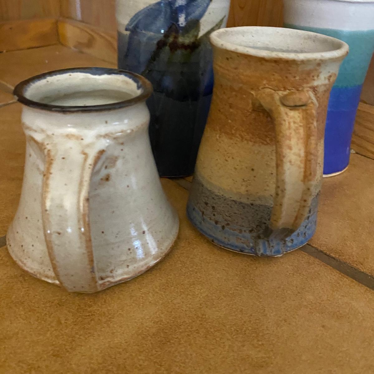 Lot includes four unsigned pieces of pottery. Use them as cups or flower holders! Larger piece measures 3.5”D x 6”H and has a small chip on the rim. Otherwise all items are in good condition. Please see photos for details. Lot also includes two mugs. One unsigned and one has a stamp. See photos for details.