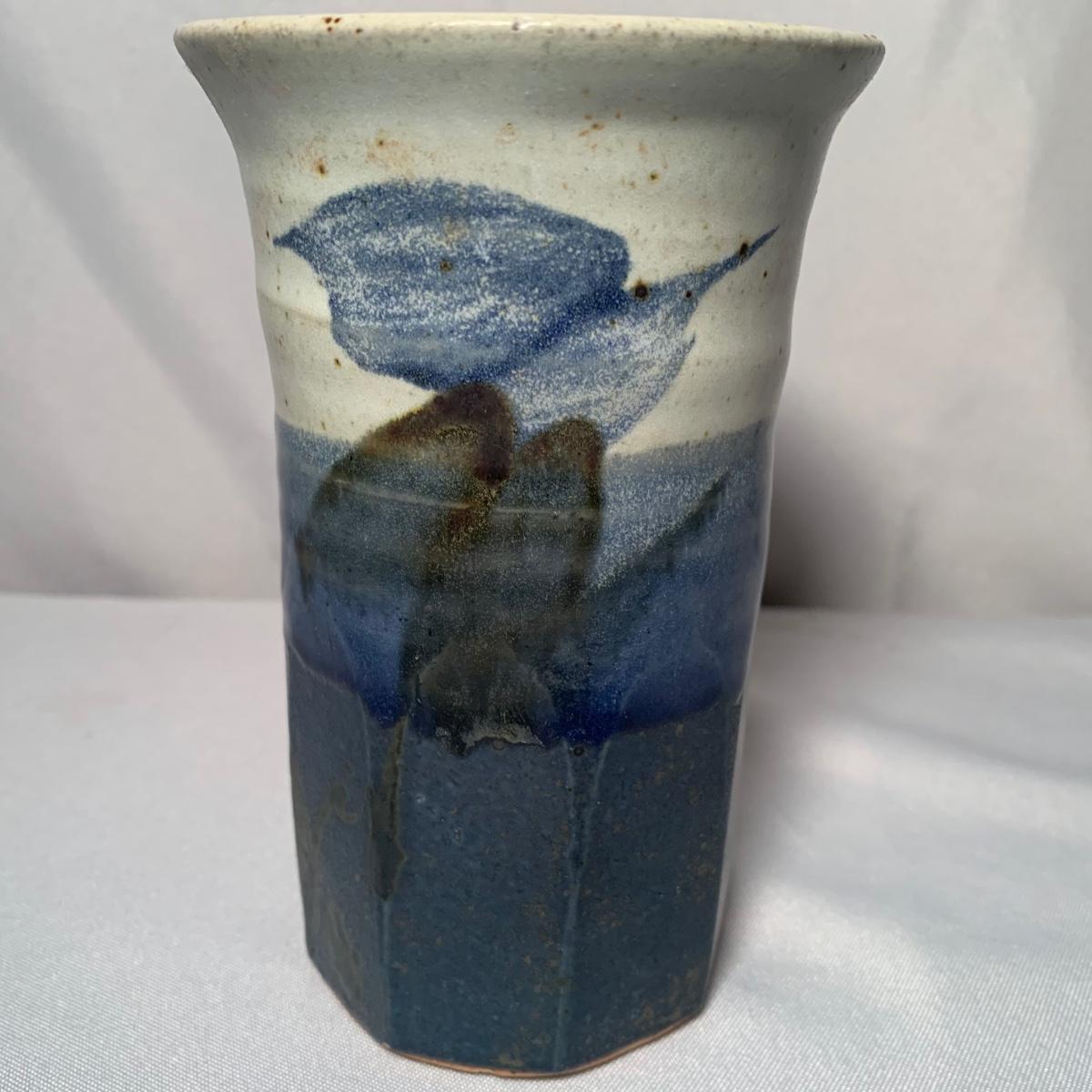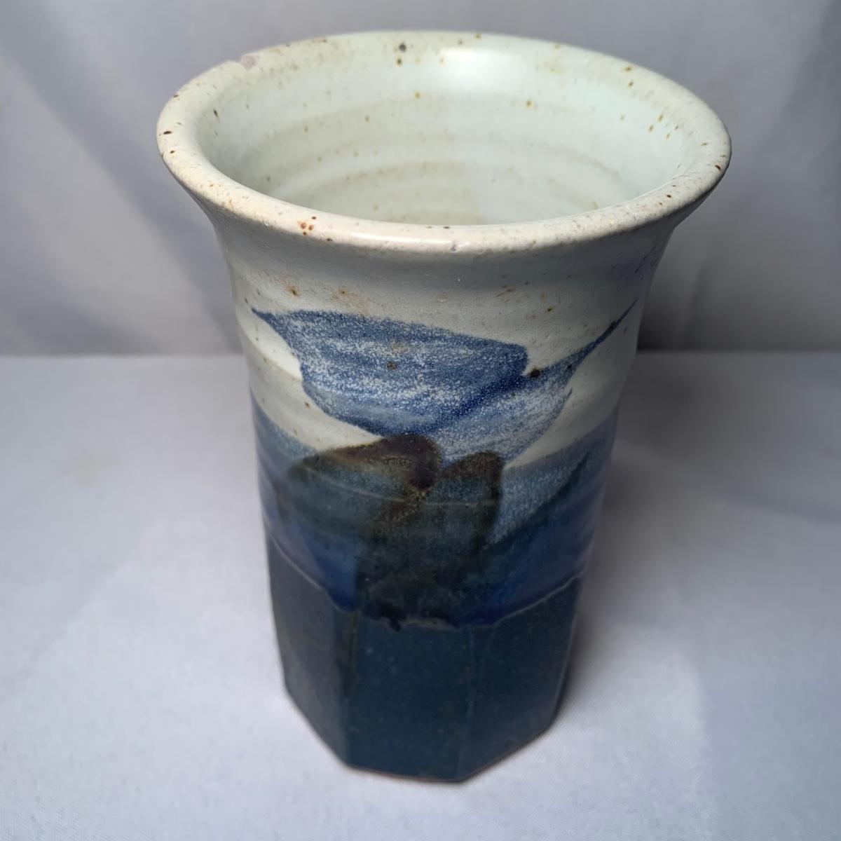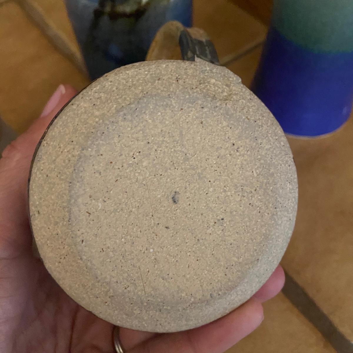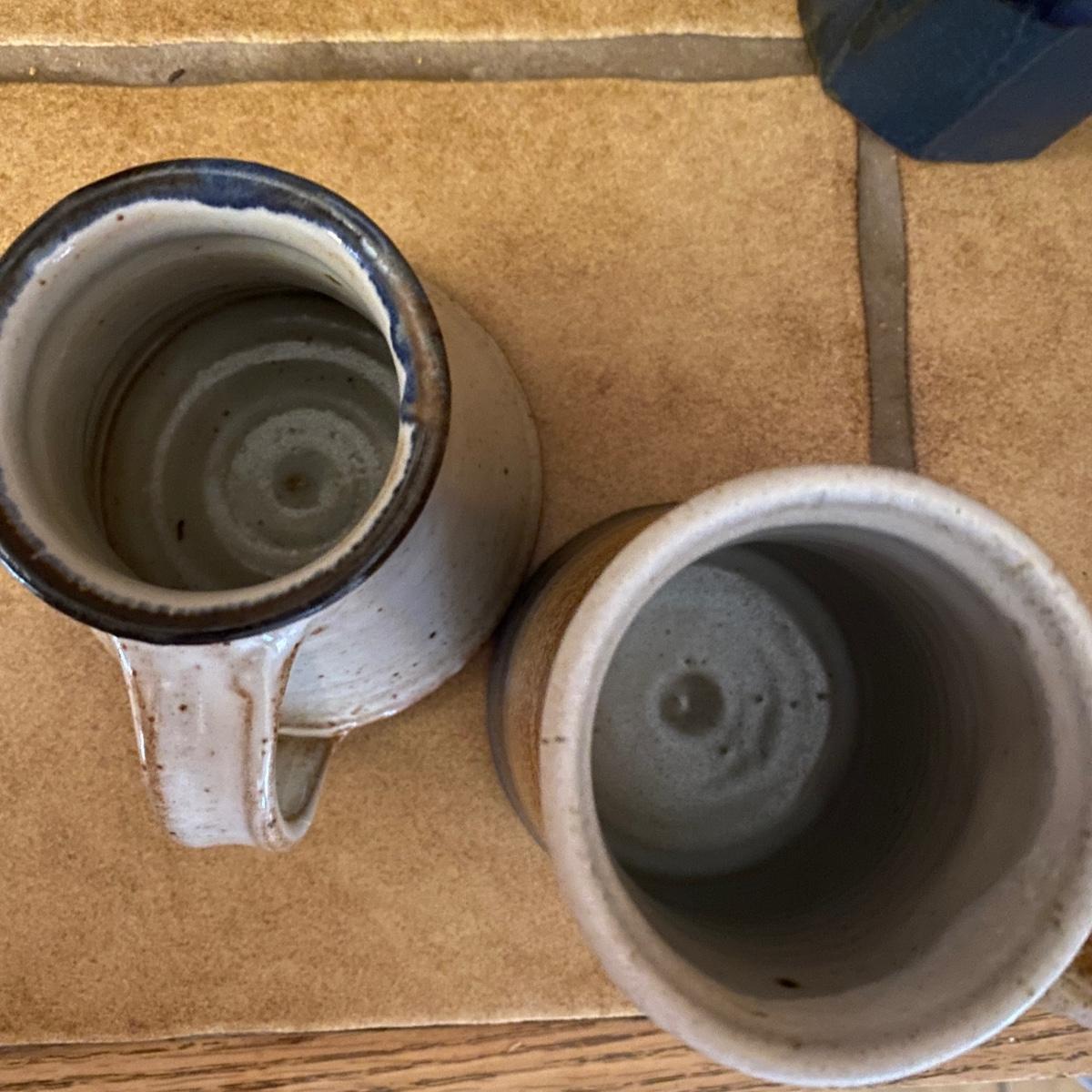 Lot includes four unsigned pieces of pottery. Use them as cups or flower holders! Larger piece measures 3.5”D x 6”H and has a small chip on the rim. Otherwise all items are in good condition. Please see photos for details. Lot also includes two mugs. One unsigned and one has a stamp. See photos for details.