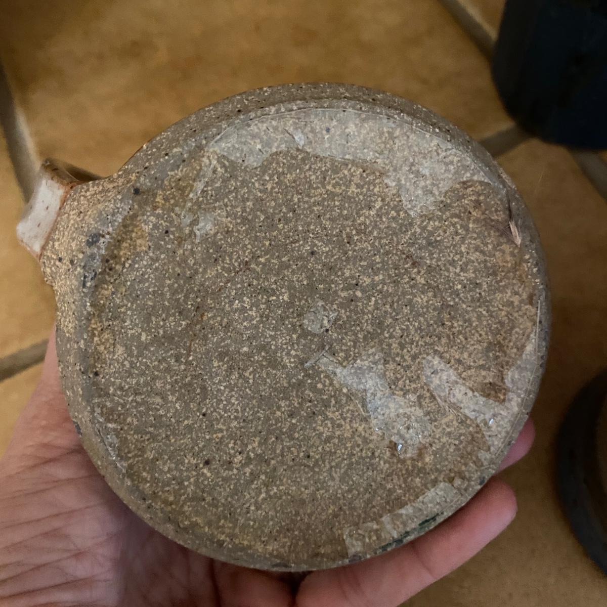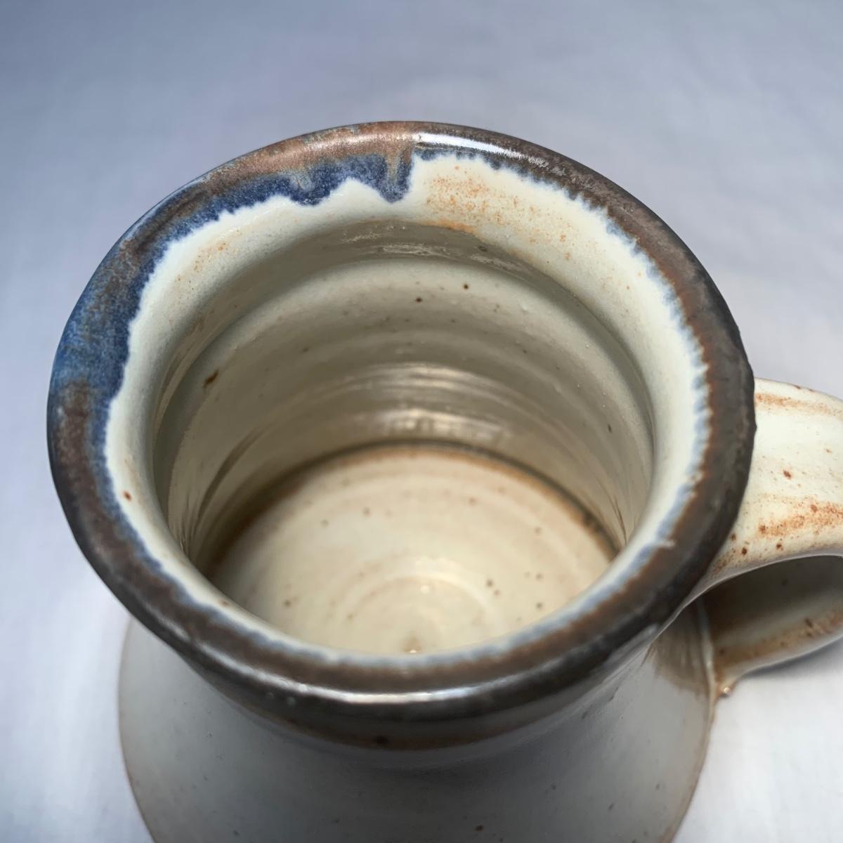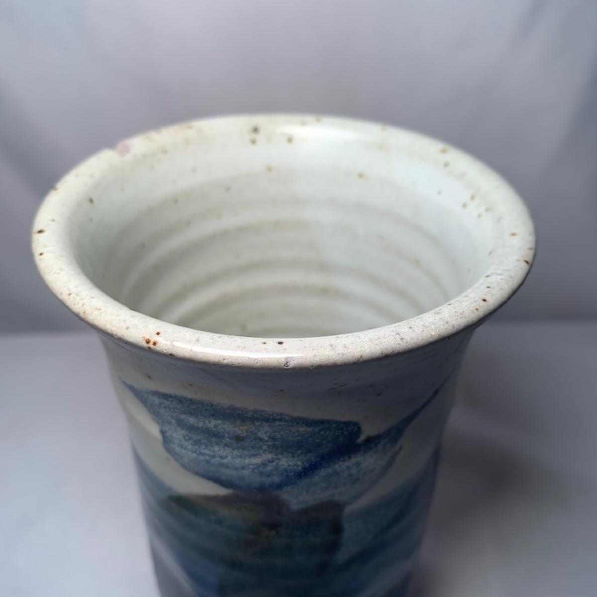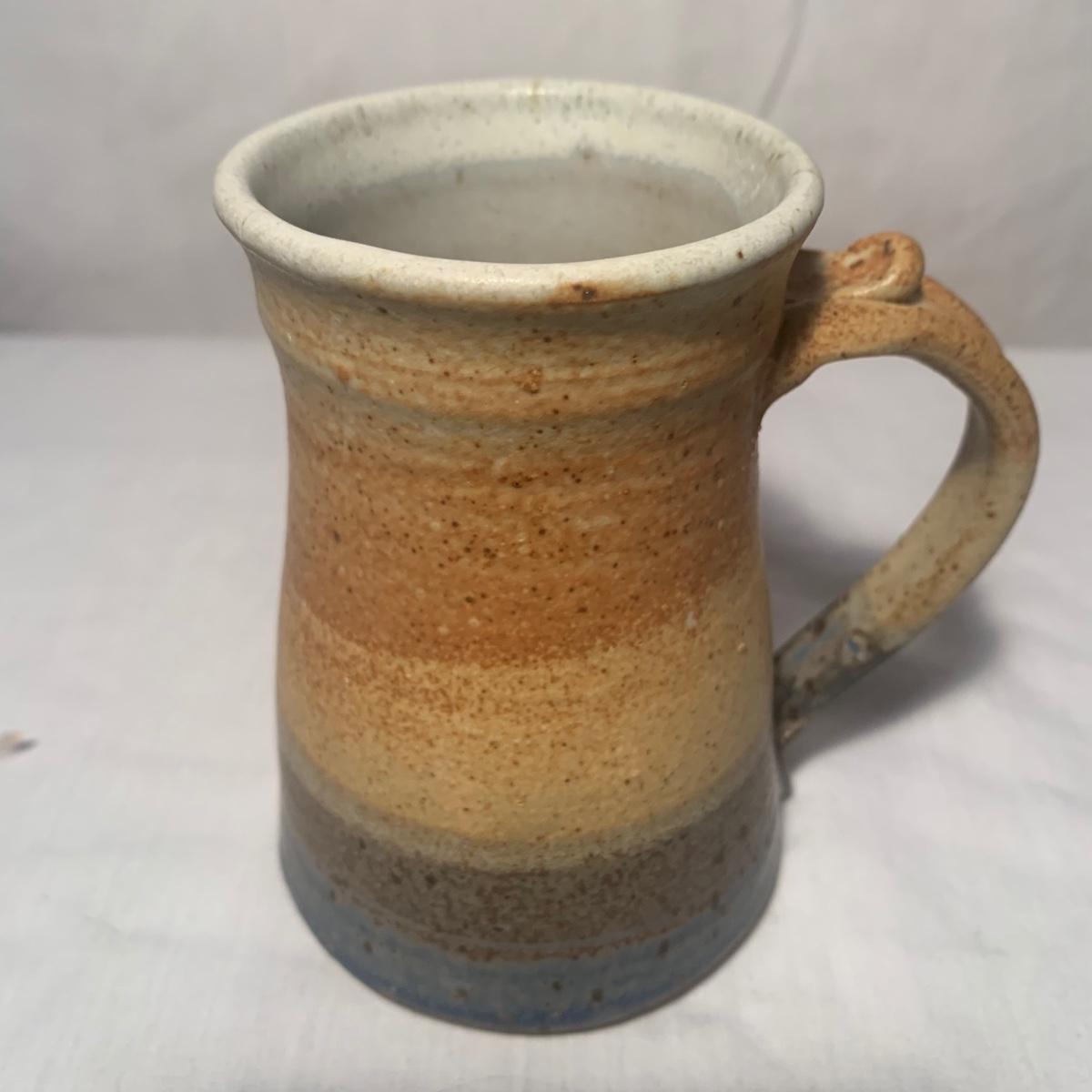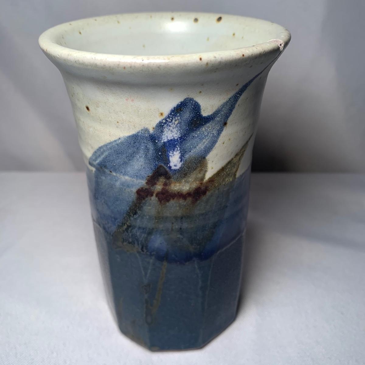 Lot includes four unsigned pieces of pottery. Use them as cups or flower holders! Larger piece measures 3.5”D x 6”H and has a small chip on the rim. Otherwise all items are in good condition. Please see photos for details. Lot also includes two mugs. One unsigned and one has a stamp. See photos for details.