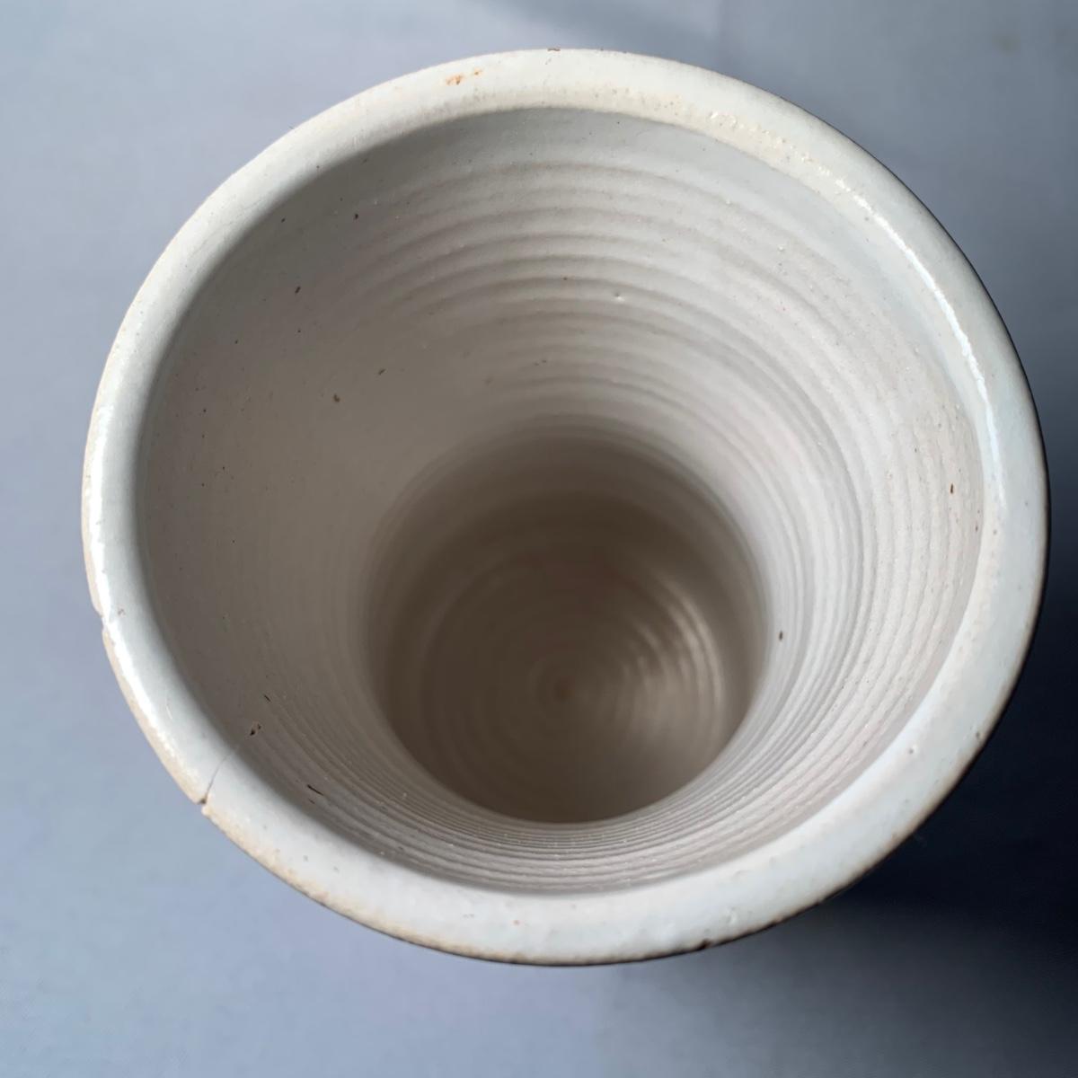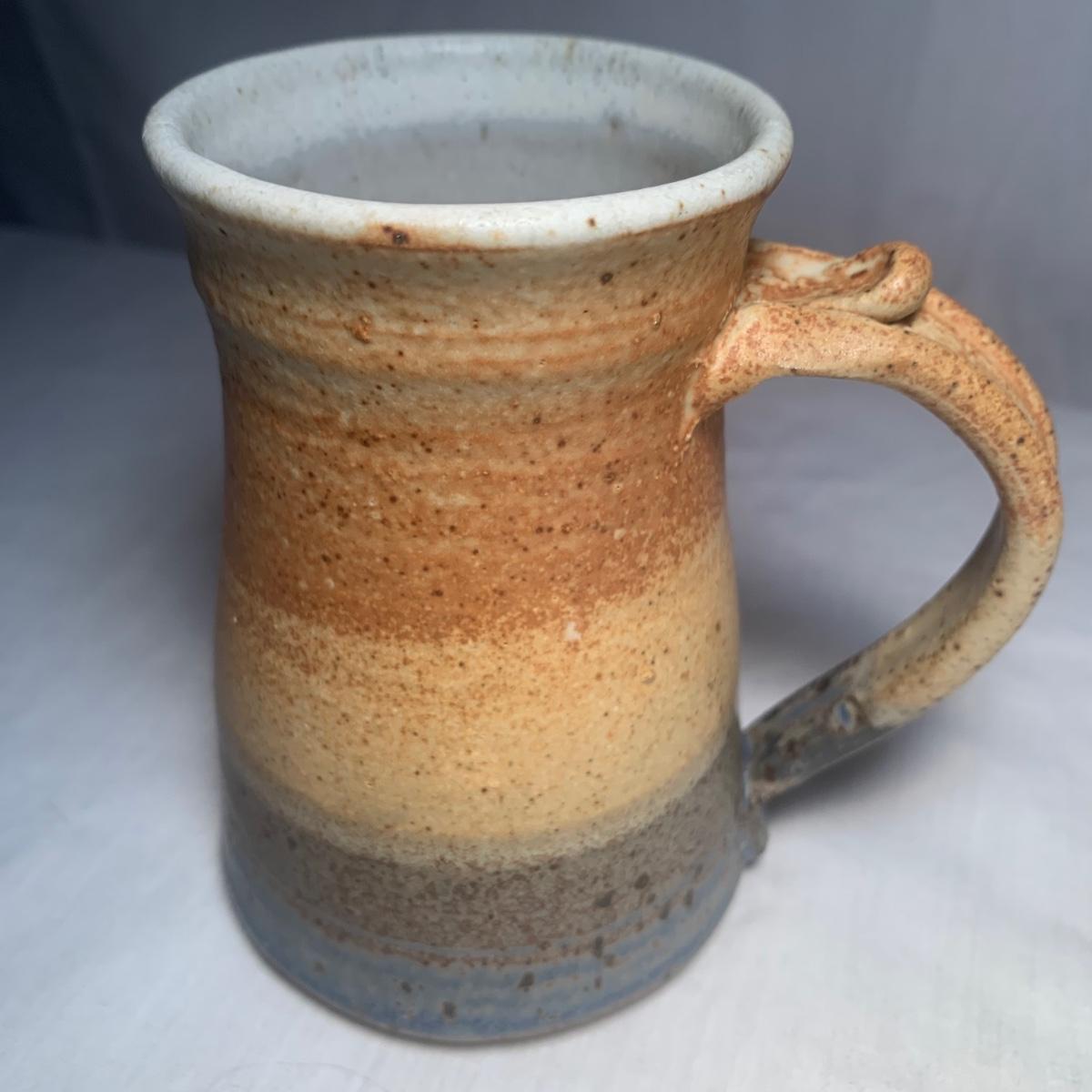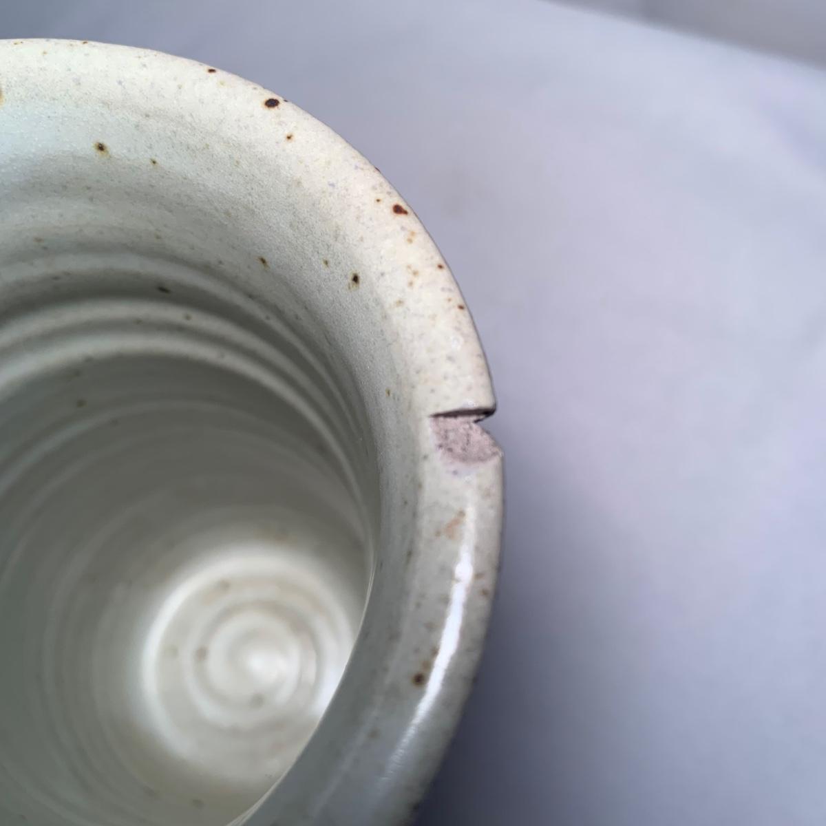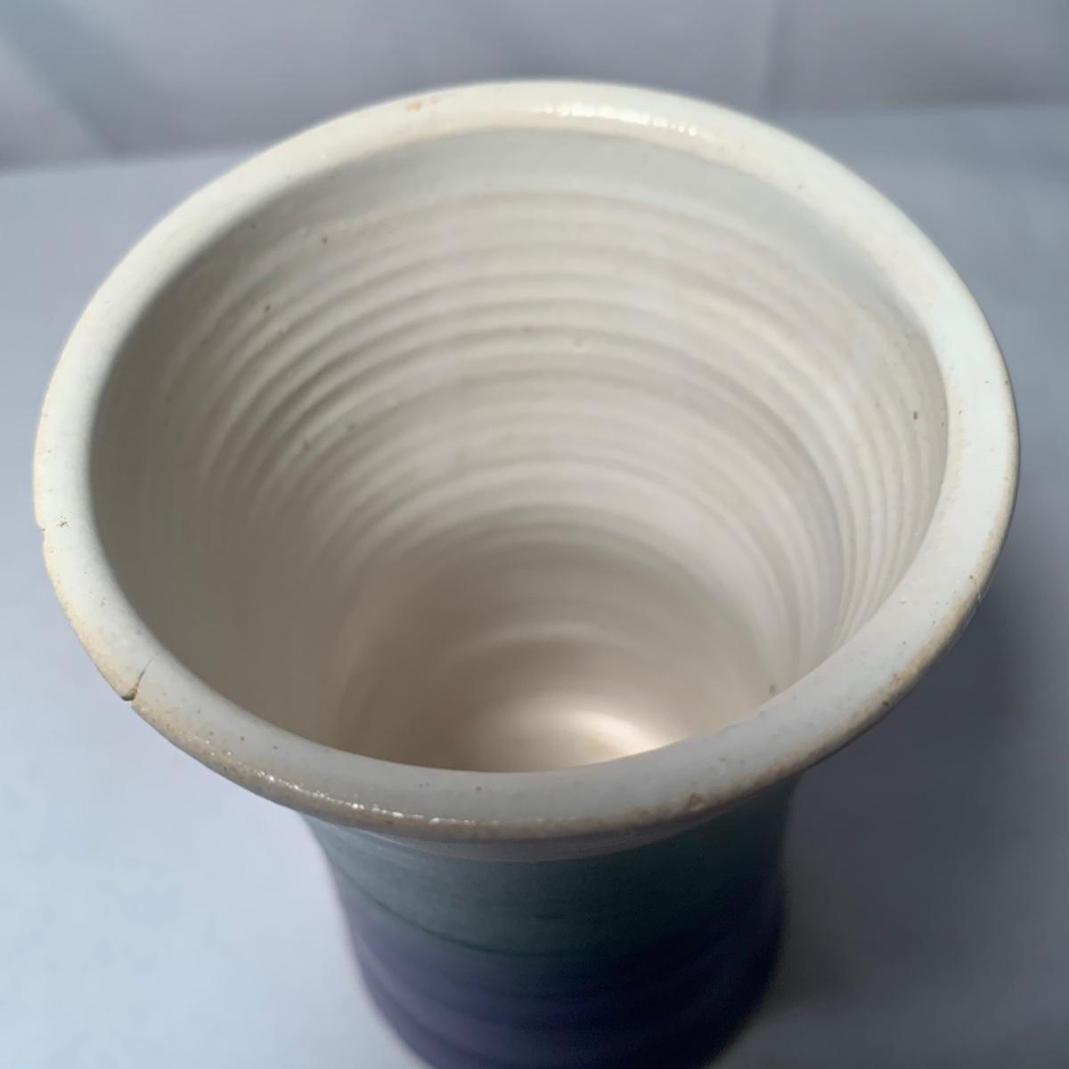 Lot includes four unsigned pieces of pottery. Use them as cups or flower holders! Larger piece measures 3.5”D x 6”H and has a small chip on the rim. Otherwise all items are in good condition. Please see photos for details. Lot also includes two mugs. One unsigned and one has a stamp. See photos for details.