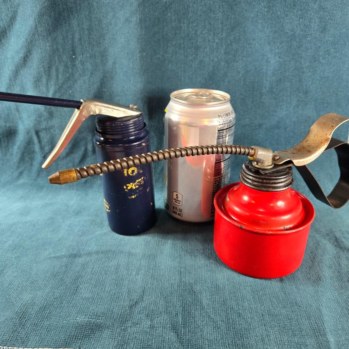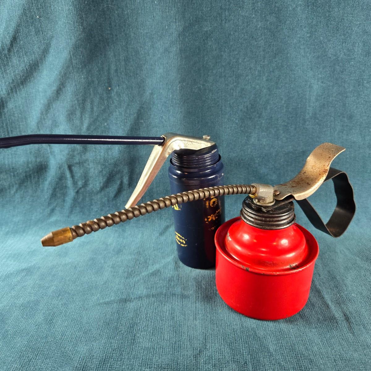 This auction lot is for a Duo of Oil Cans. The blue can is for Plews Manual Automotive Grease - pistol grip. It measures about 2-inches deep x 4-1/2 -tall x 2-1/2-inches wide. The Red Can is unmarked. It is about 3-inches in diameter with a 3-inch spout. These cans sport long squirting necks to reach those hard places. Both have no contents. Add them to your collection or use them for most any purpose you decide.