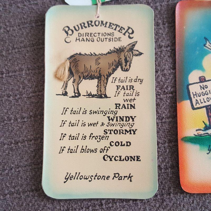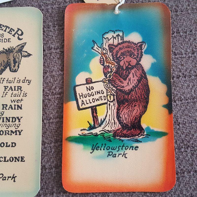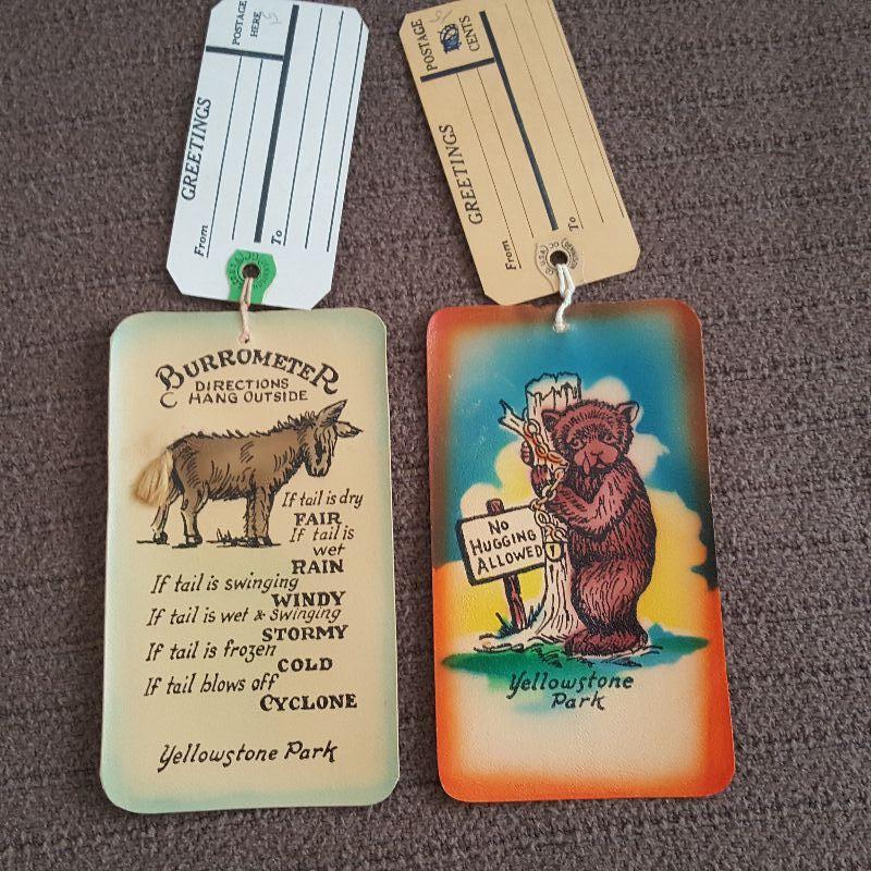 This auction lot is for a Duo of Yellowstone Souvenir Leather Postcards. The leather of these cards has been hardened and are quite stiff. Neither card has been used. See photo of the burro card - it is designed to be a true barometer. Both come with the mailing tag intact. Quite a find for the Yellowstone enthusiast, the postcard lover and the collector of the unusual.