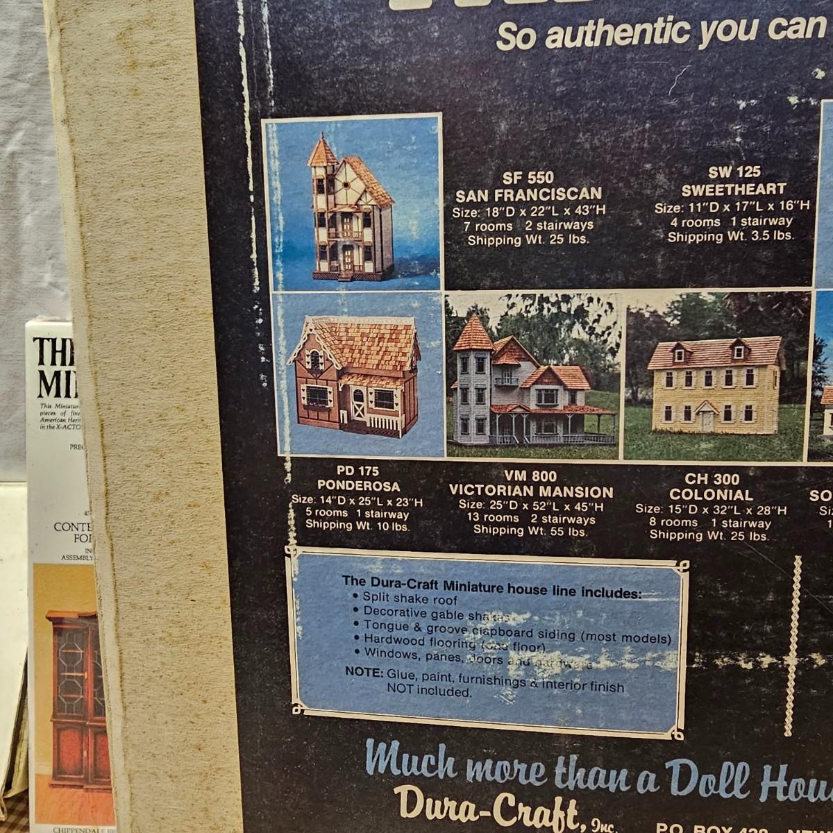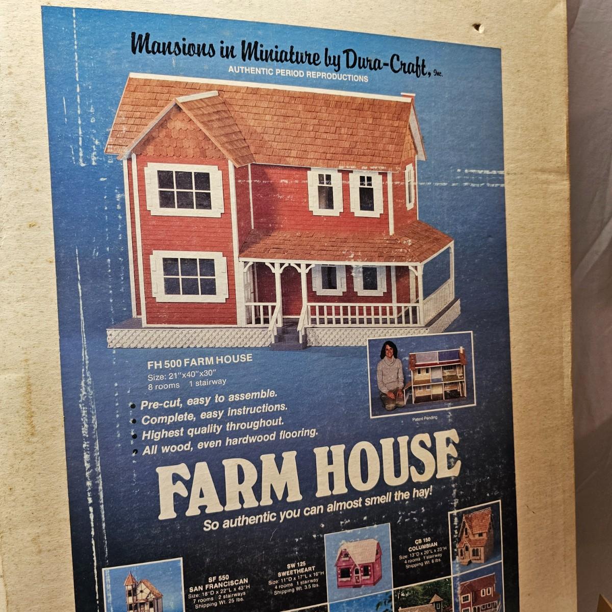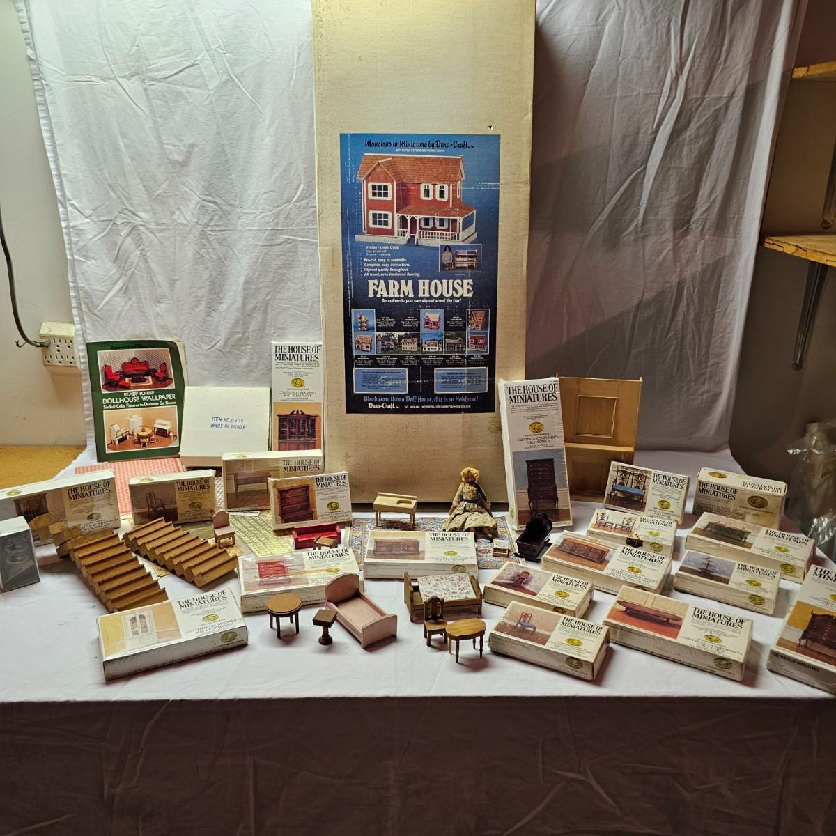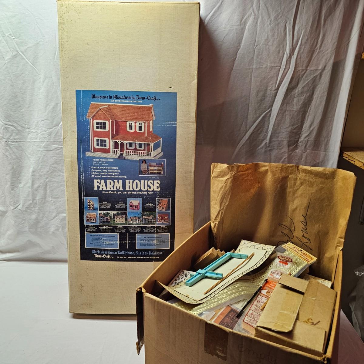 Boxed farm house kit by Dura Craft. Box still has staples in it, has never been opened. House measures 21" x 40" x 30"H. Last also includes several items of pre-made furniture and 18 boxed The House of Miniatures furniture kits to build. Additional supplies also included. The age of the liquids are unknown and we cannot verify contents. See photos for details. Local pickup only.