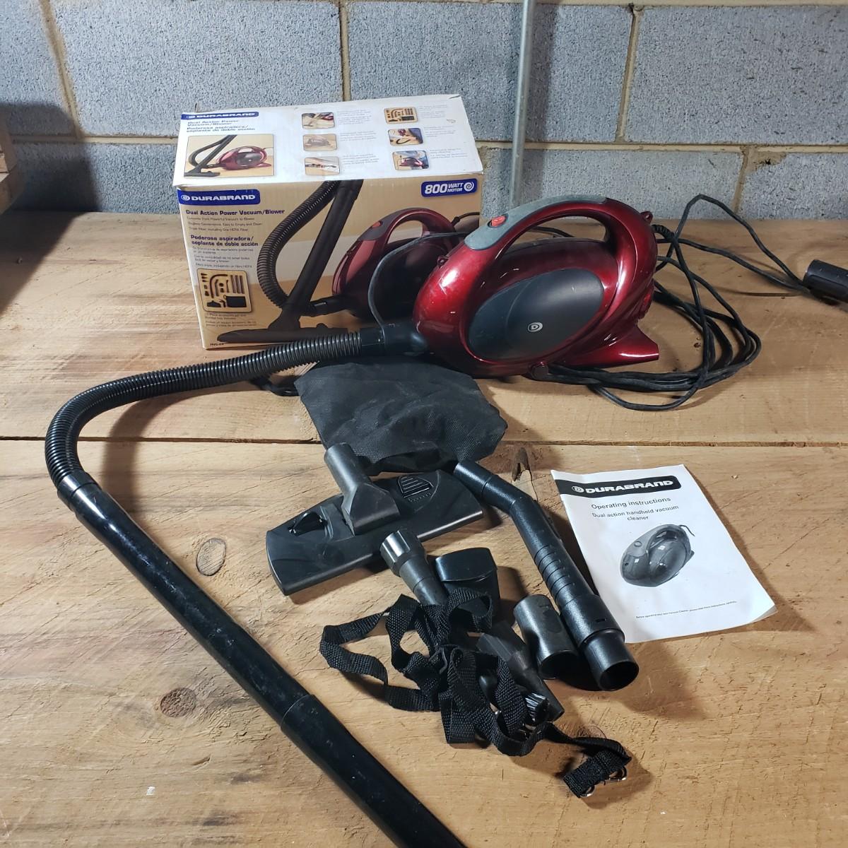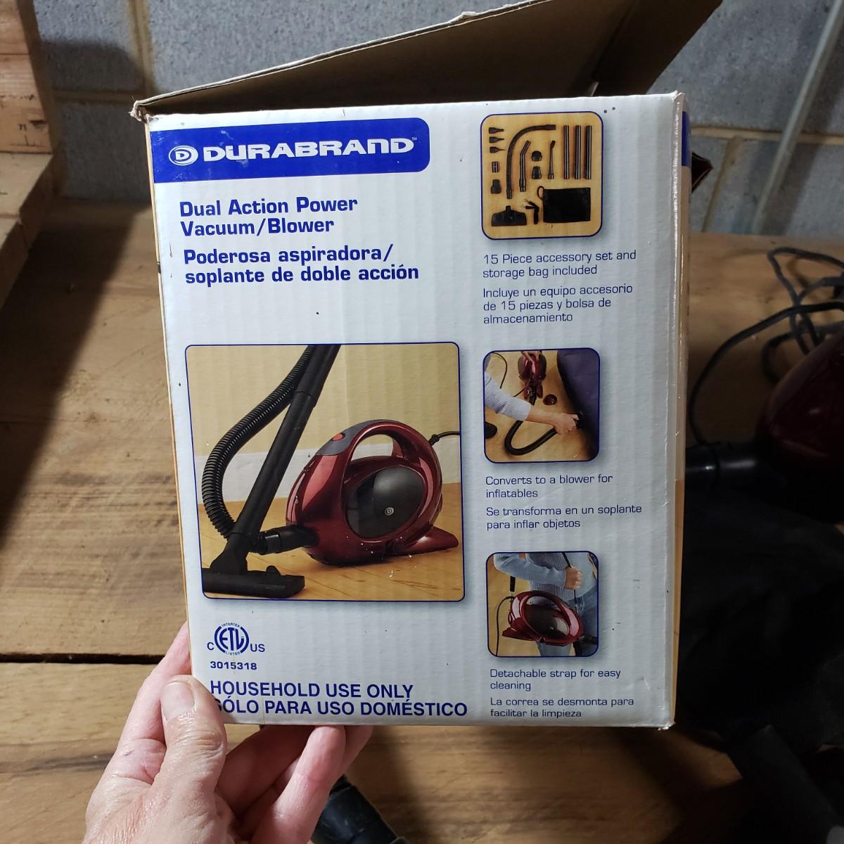 This three piece lot features Durabrand, Shark and Black and Decker vacuums. The small red Durabrand comes in original box with accessories and manual. See pictures for details. The Shark Rocket is a corded vacuum with two times the accessories and parts! The vacuums have been used in a dog friendly house. The Black and Decker Advanced Dustbuster comes with a charger. All vacuums powered on when plugged in. Local Pick Up only.