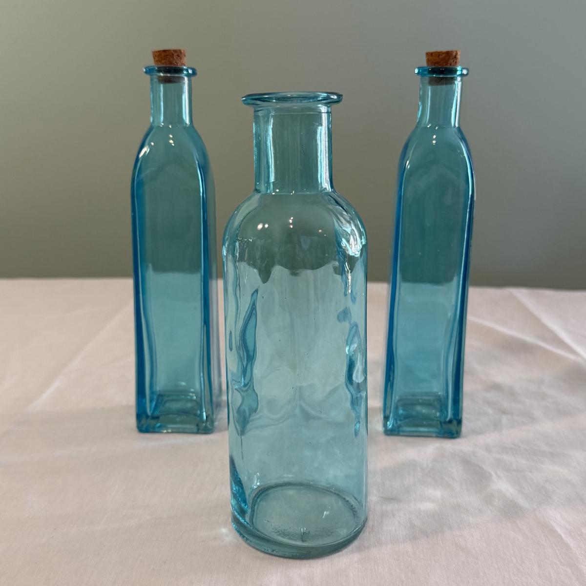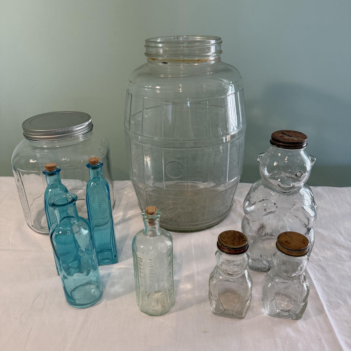 This collection of jars and bottles includes nine total items. One is an 8”D x 13.25”H Duraglas brand barrel style pickle jar. It has some rust and no lid included. There are three bear jars, one of which has a Snow Crest lid with a slot to use as a bank. One item is a light green hued Atwood’s Jaundice Bitters bottle with a cork lid. There are three blue bottles, two with corks, and one big square-shape jar with a lid.