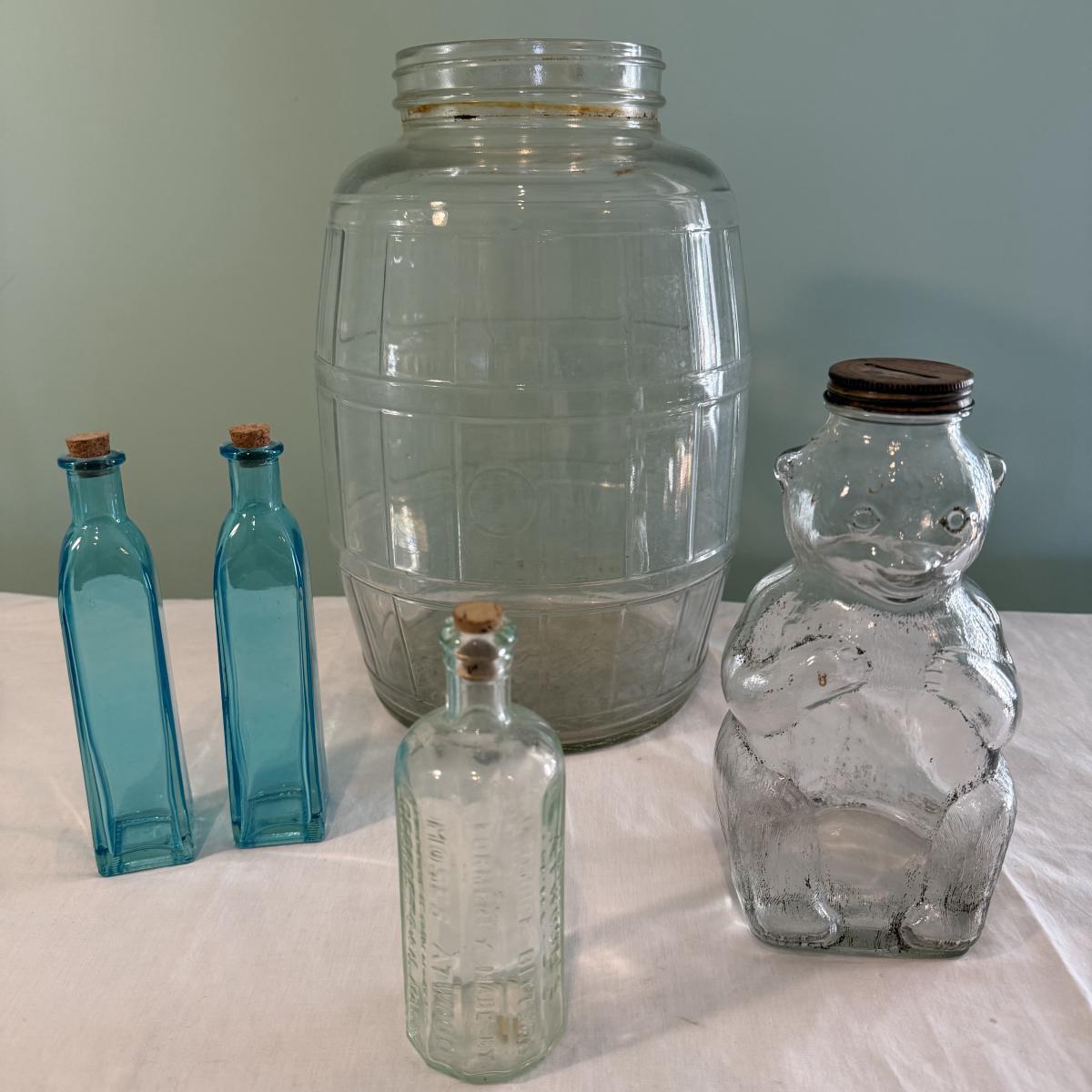 Duraglas Pickle Jar, Snow Crest Bear Bank, & More Glass Bottles (EC-HS)