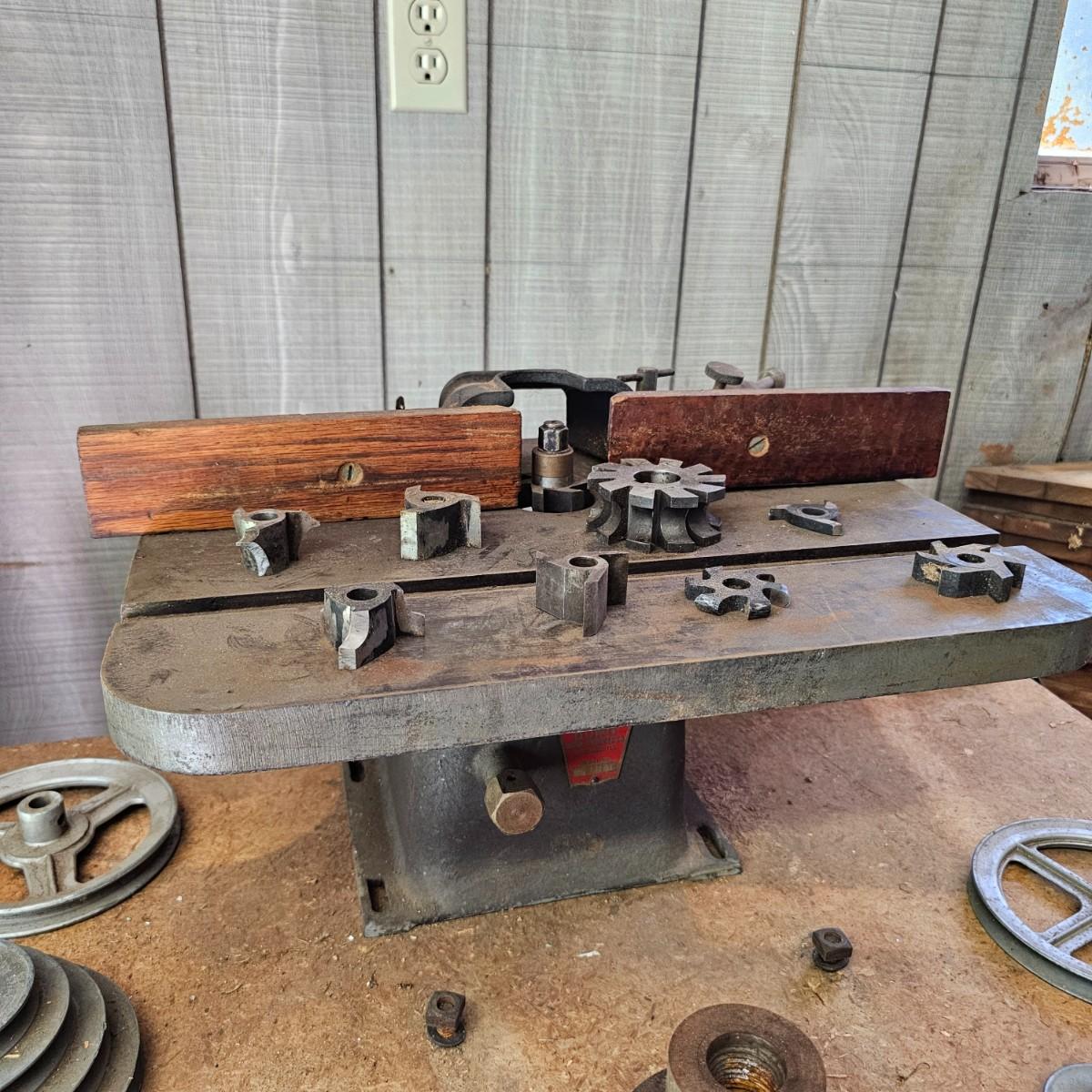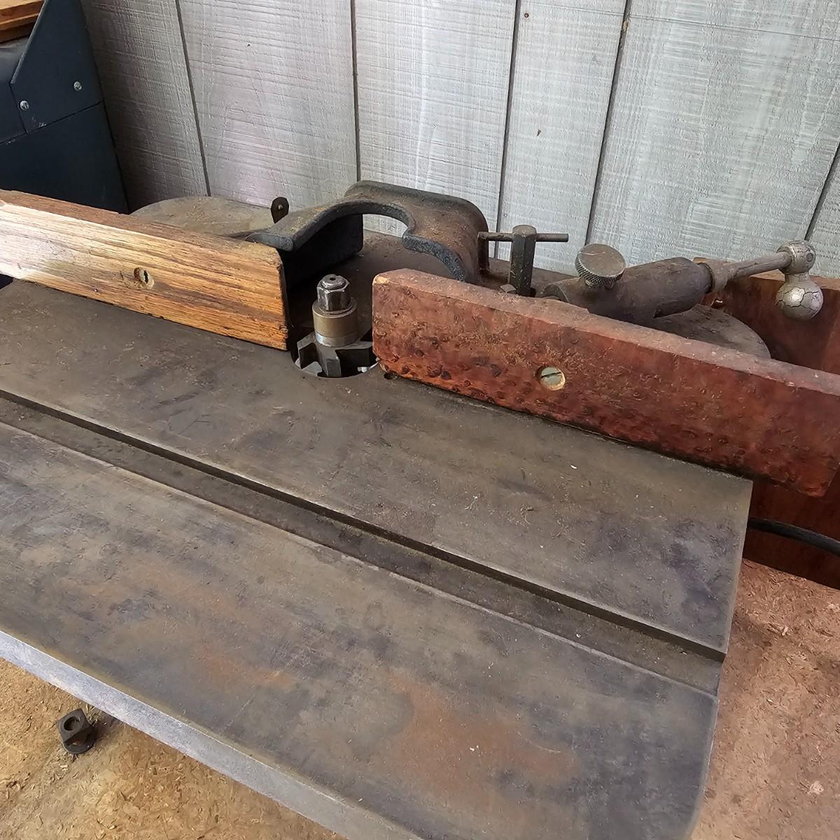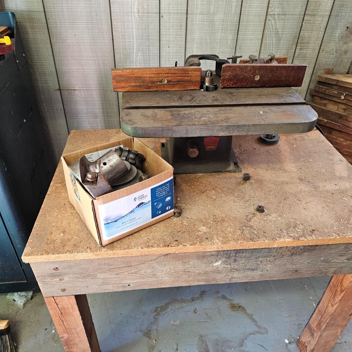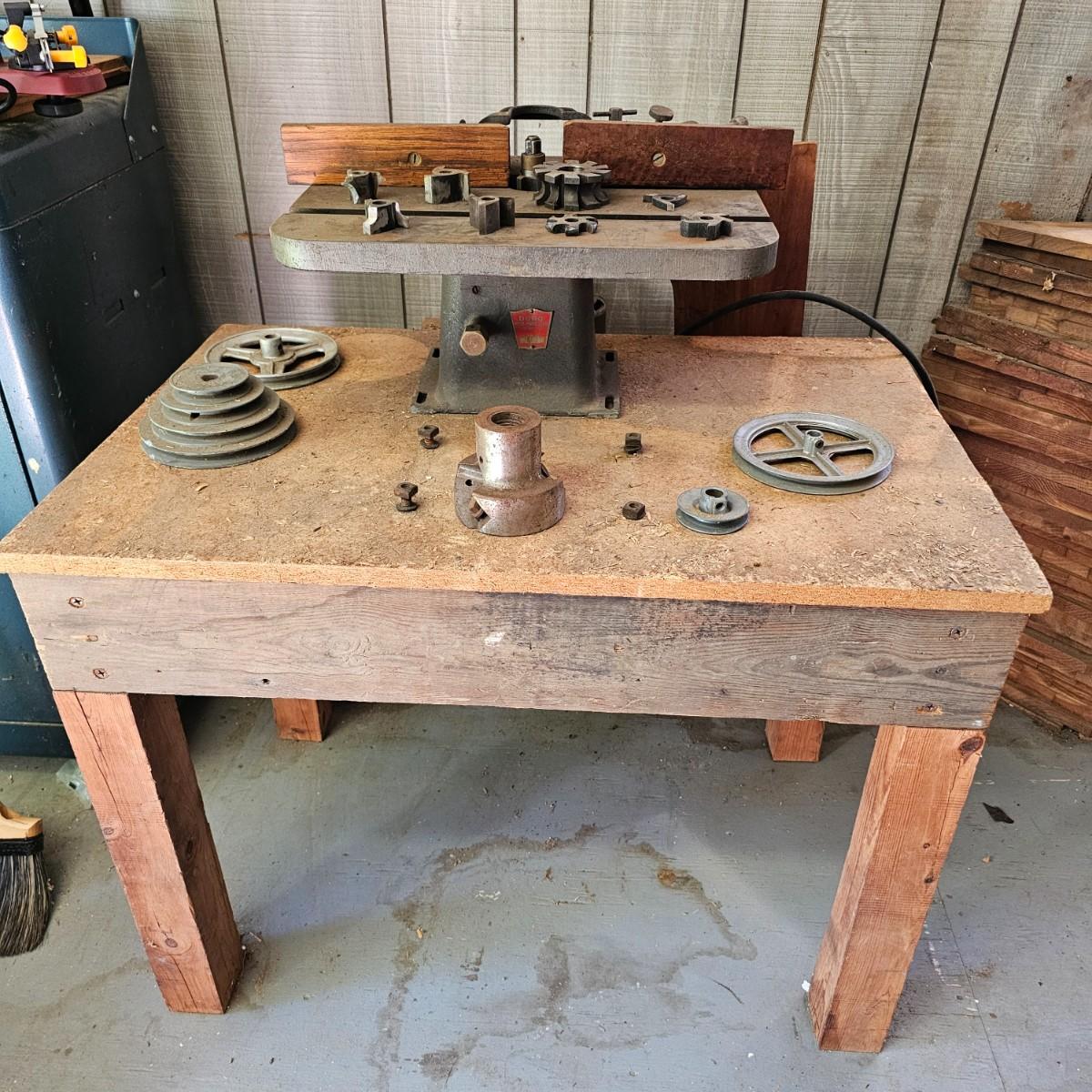 Tabletop router base by Duro Metal Products. Unit has 18" wide table top with slot for guide piece, comes with an assortment of different size and style cutters including one designed to round over large pieces for timber furniture. (Does not attach to this machine). Machine is not currently bolted to table but has attachment bolts in place. Table must be taken with machine. Motor on back has adjustment for belt tension, but no belt included. Motor powered on when plugged in. Overall measures 34" x 31" x 37" H. Includes three 6" pulley spindles, two singles and a four step piece. See photos for details.
