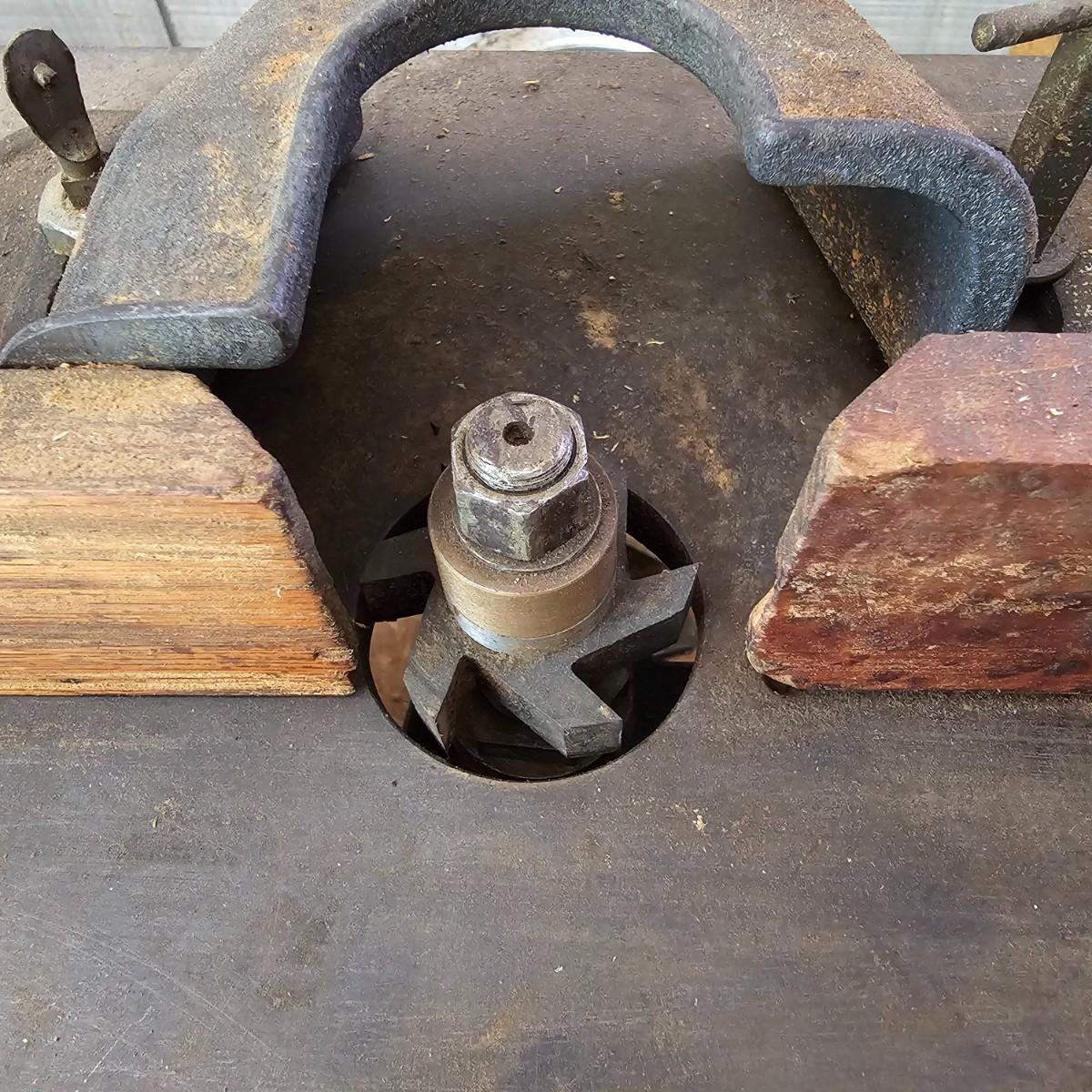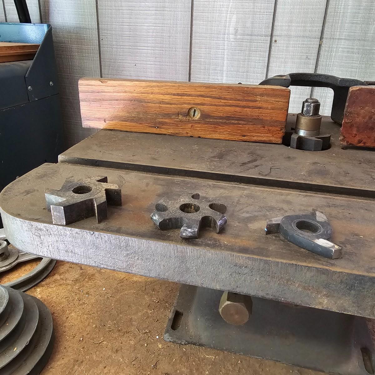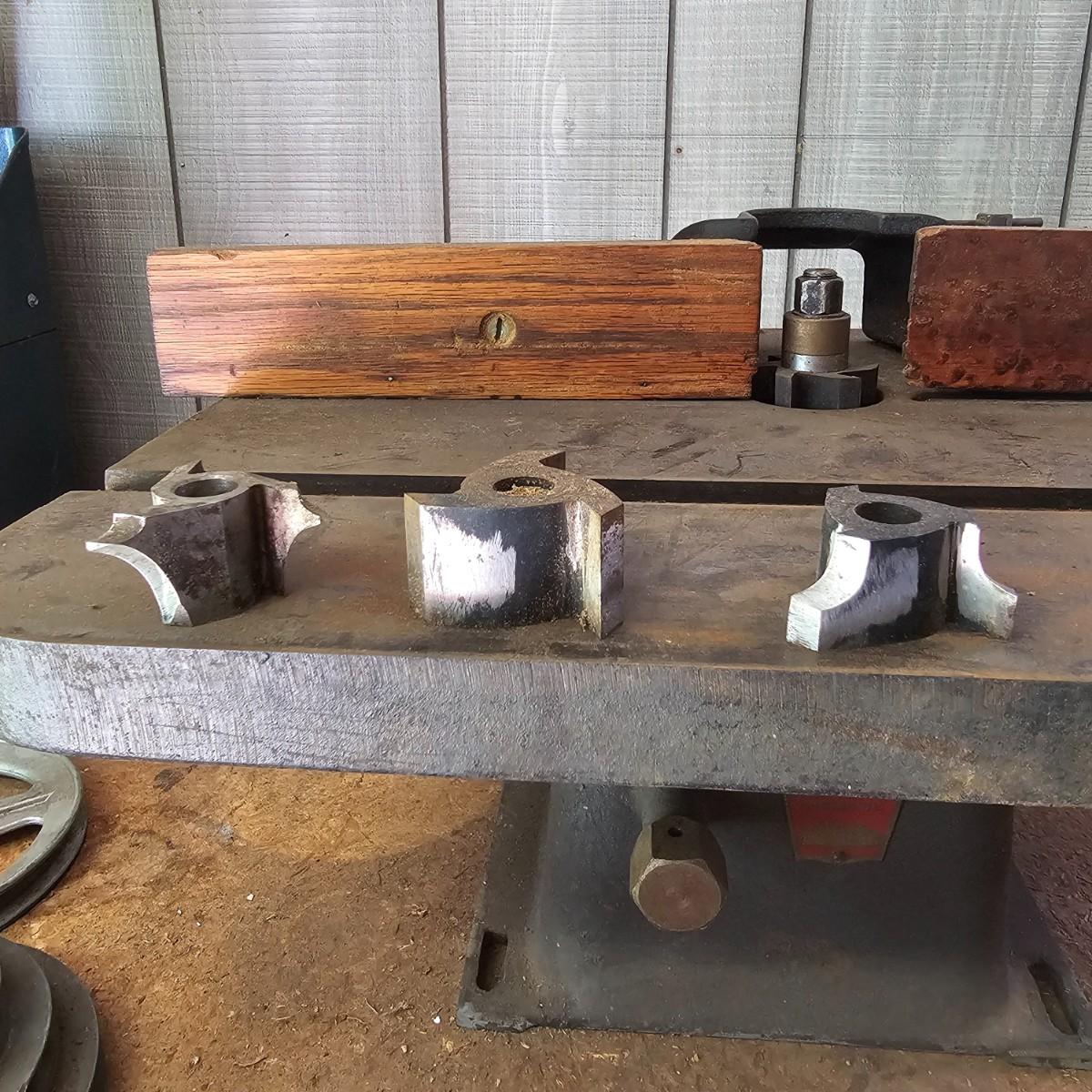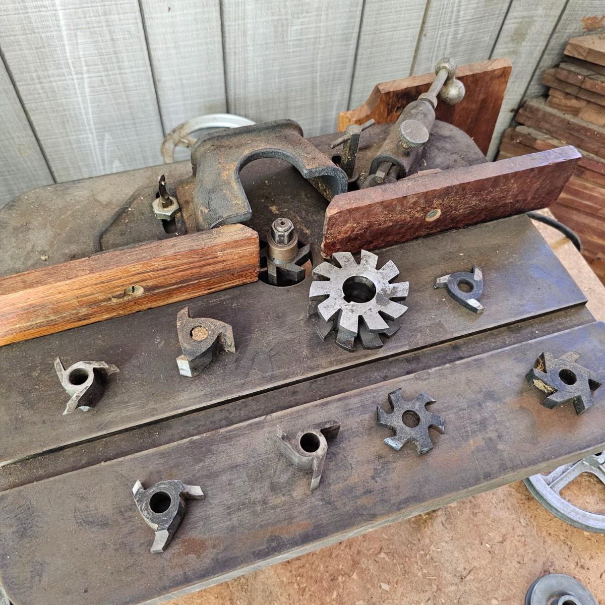 Tabletop router base by Duro Metal Products. Unit has 18" wide table top with slot for guide piece, comes with an assortment of different size and style cutters including one designed to round over large pieces for timber furniture. (Does not attach to this machine). Machine is not currently bolted to table but has attachment bolts in place. Table must be taken with machine. Motor on back has adjustment for belt tension, but no belt included. Motor powered on when plugged in. Overall measures 34" x 31" x 37" H. Includes three 6" pulley spindles, two singles and a four step piece. See photos for details.