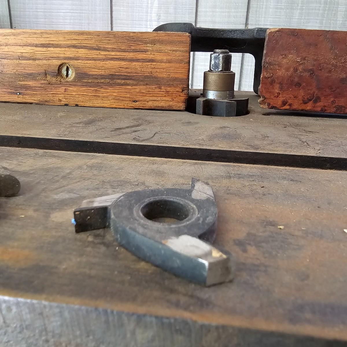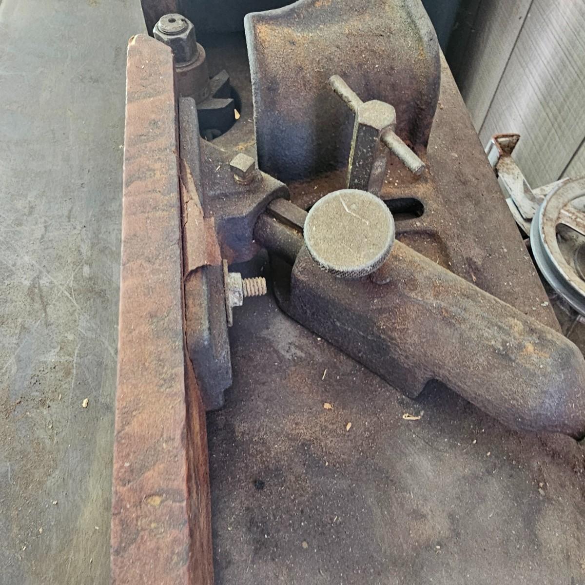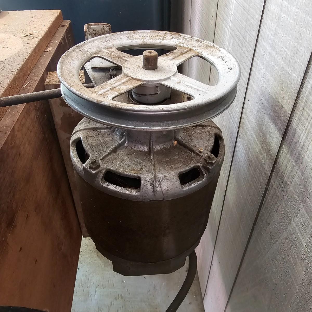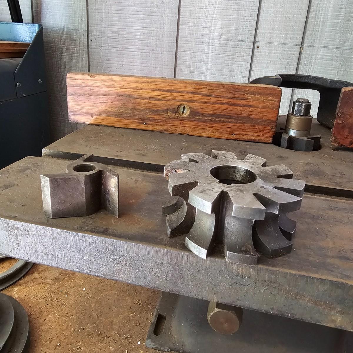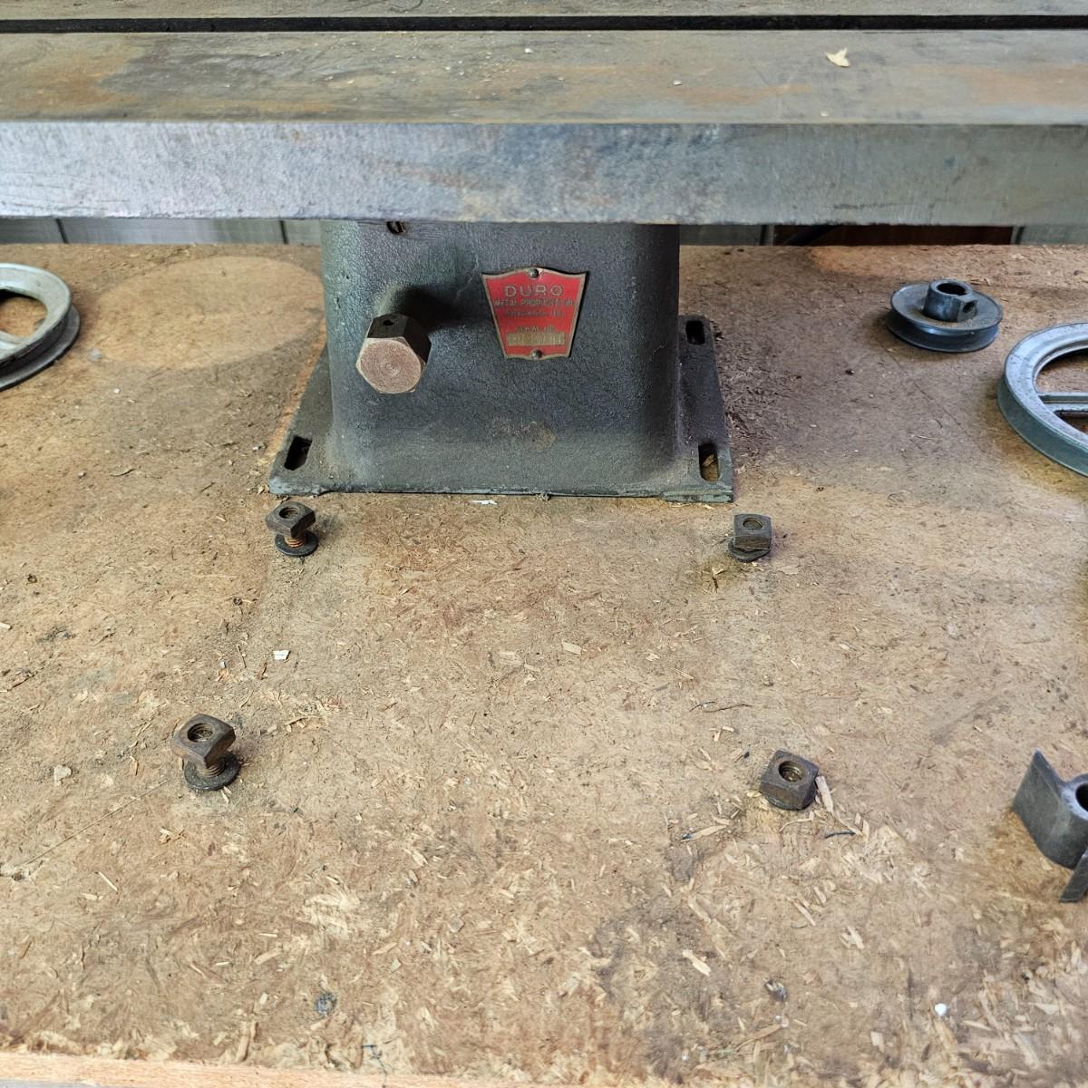 Tabletop router base by Duro Metal Products. Unit has 18" wide table top with slot for guide piece, comes with an assortment of different size and style cutters including one designed to round over large pieces for timber furniture. (Does not attach to this machine). Machine is not currently bolted to table but has attachment bolts in place. Table must be taken with machine. Motor on back has adjustment for belt tension, but no belt included. Motor powered on when plugged in. Overall measures 34" x 31" x 37" H. Includes three 6" pulley spindles, two singles and a four step piece. See photos for details.