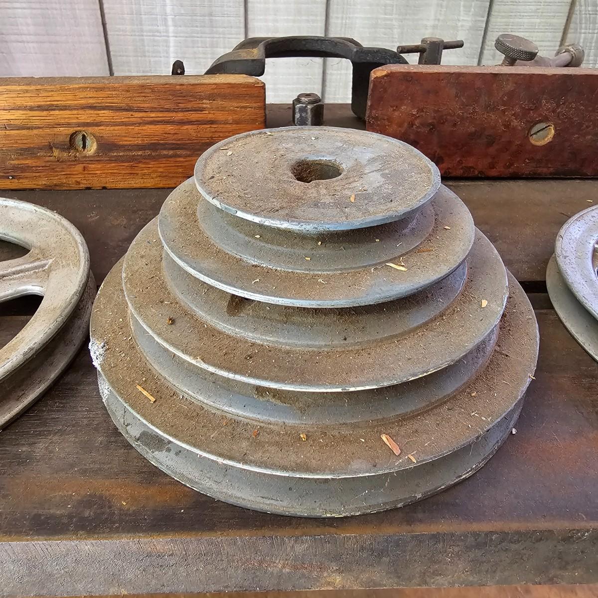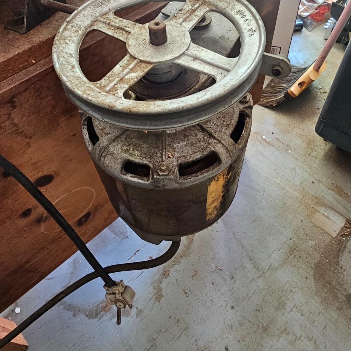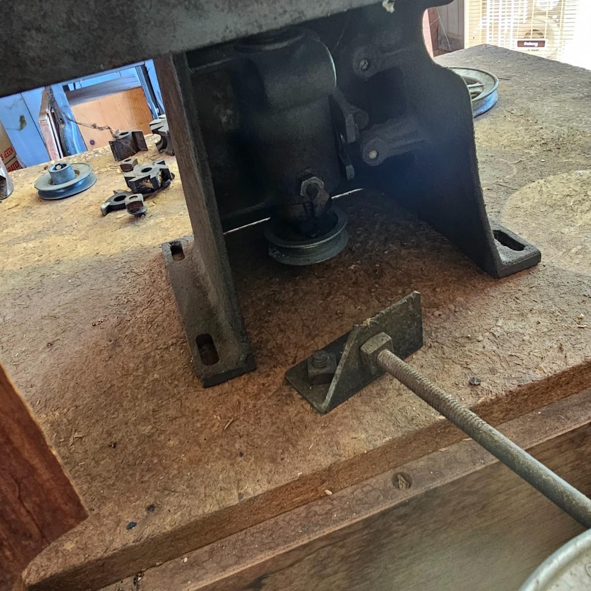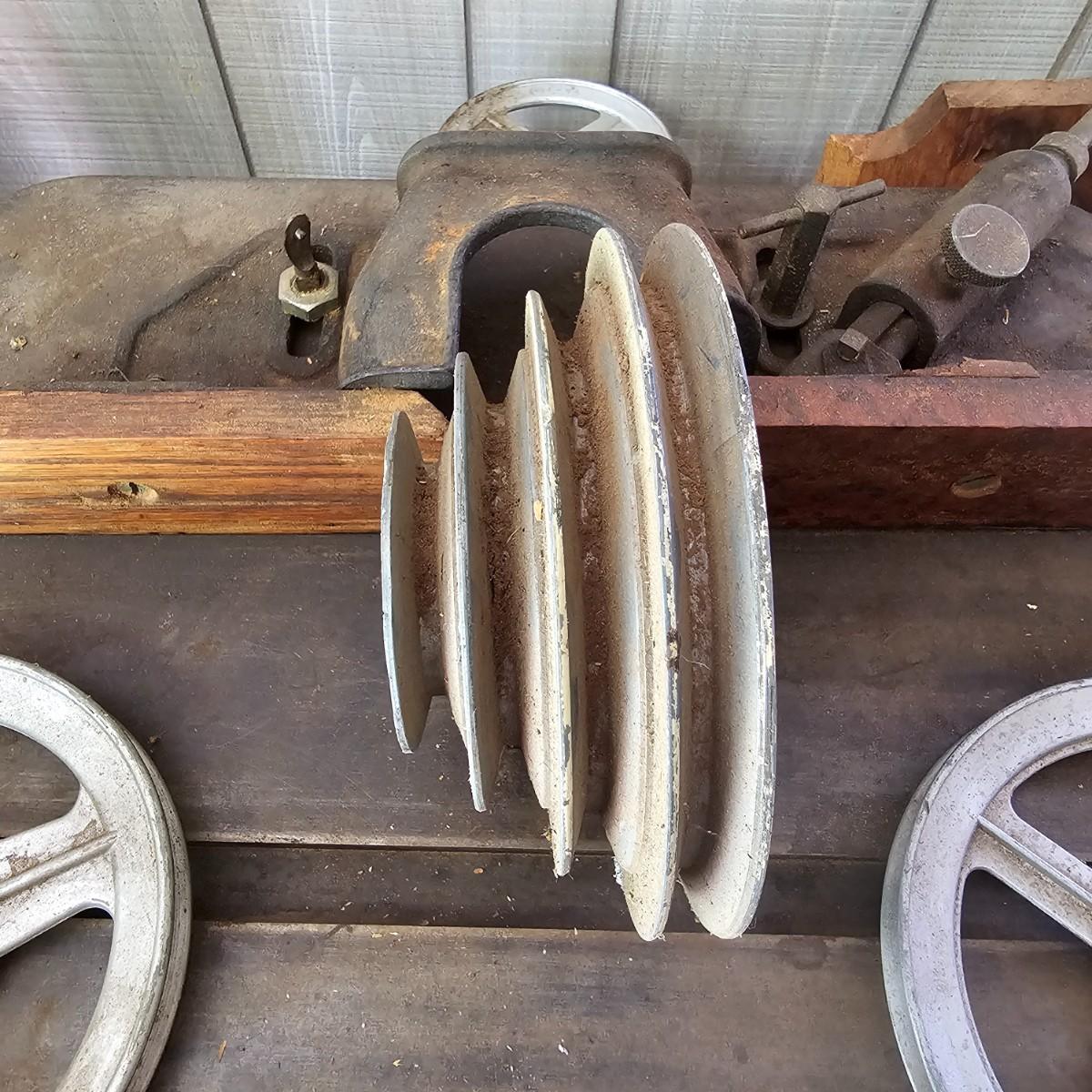 Tabletop router base by Duro Metal Products. Unit has 18" wide table top with slot for guide piece, comes with an assortment of different size and style cutters including one designed to round over large pieces for timber furniture. (Does not attach to this machine). Machine is not currently bolted to table but has attachment bolts in place. Table must be taken with machine. Motor on back has adjustment for belt tension, but no belt included. Motor powered on when plugged in. Overall measures 34" x 31" x 37" H. Includes three 6" pulley spindles, two singles and a four step piece. See photos for details.