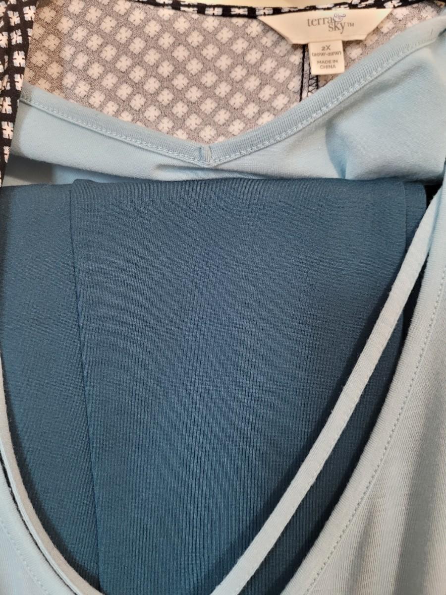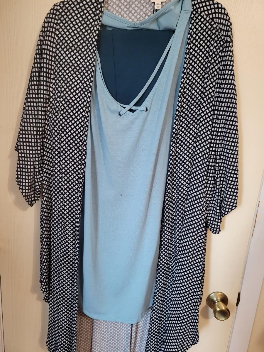 Duster jacket, sleeveless top and pants. Pants are 1X Duster is 2X top is 1x and has spots. Teal palette