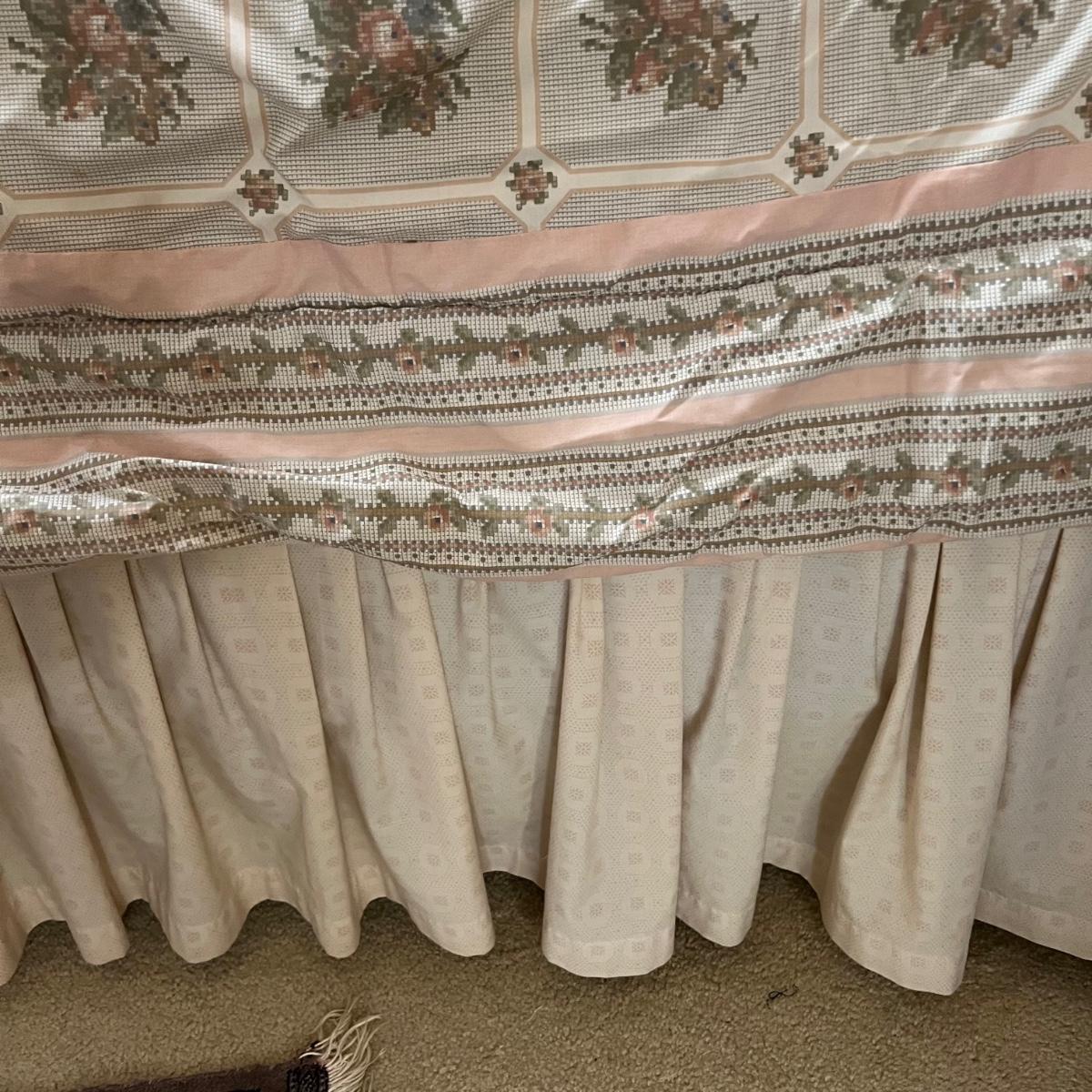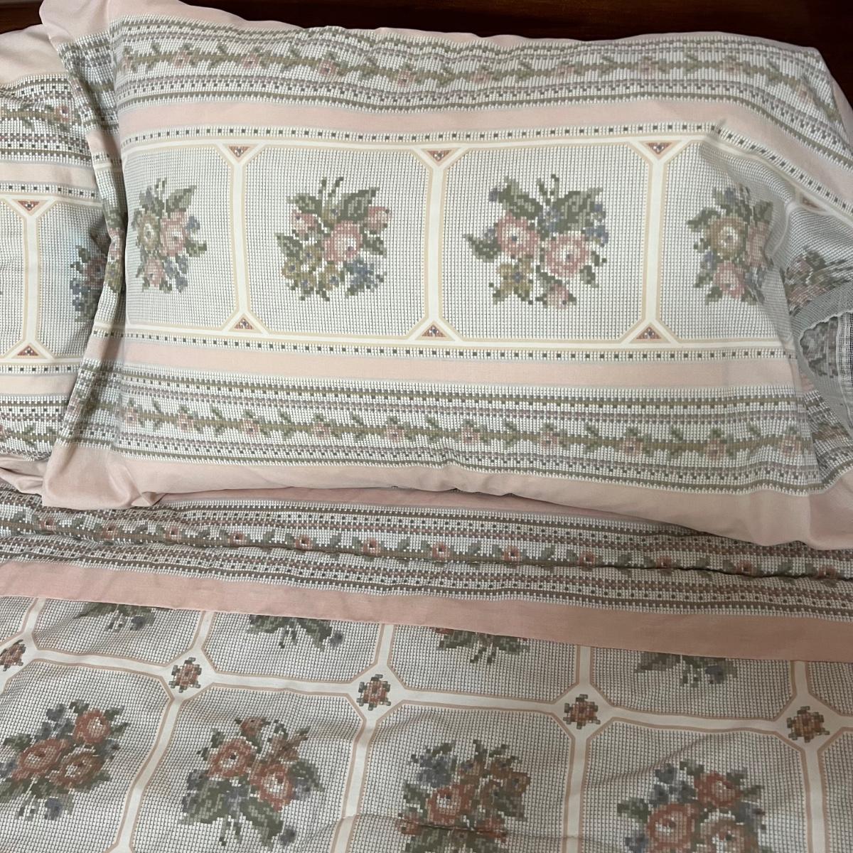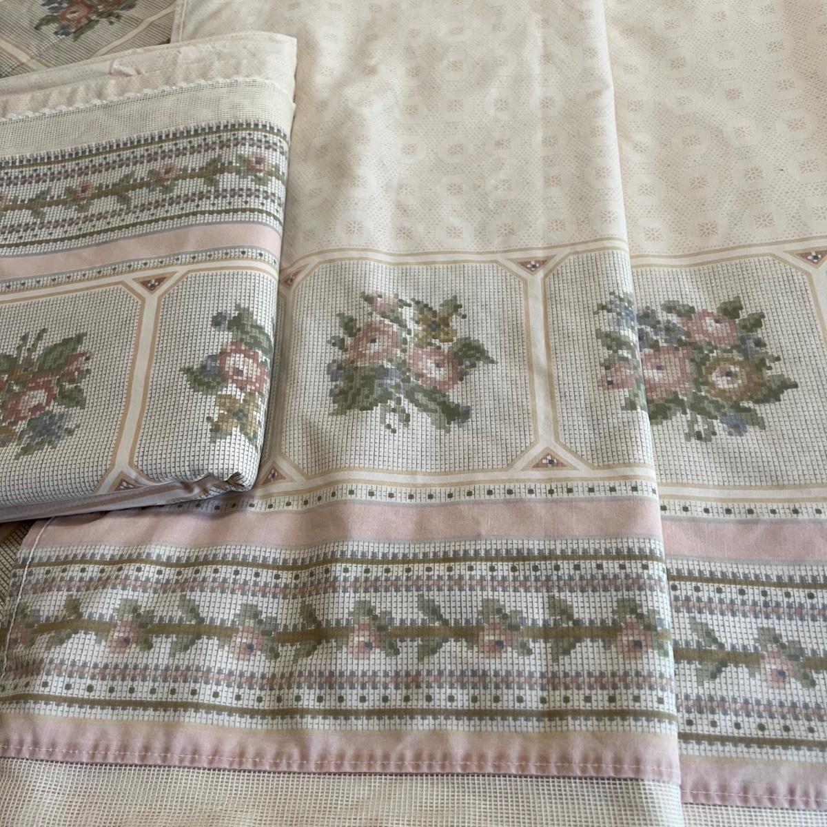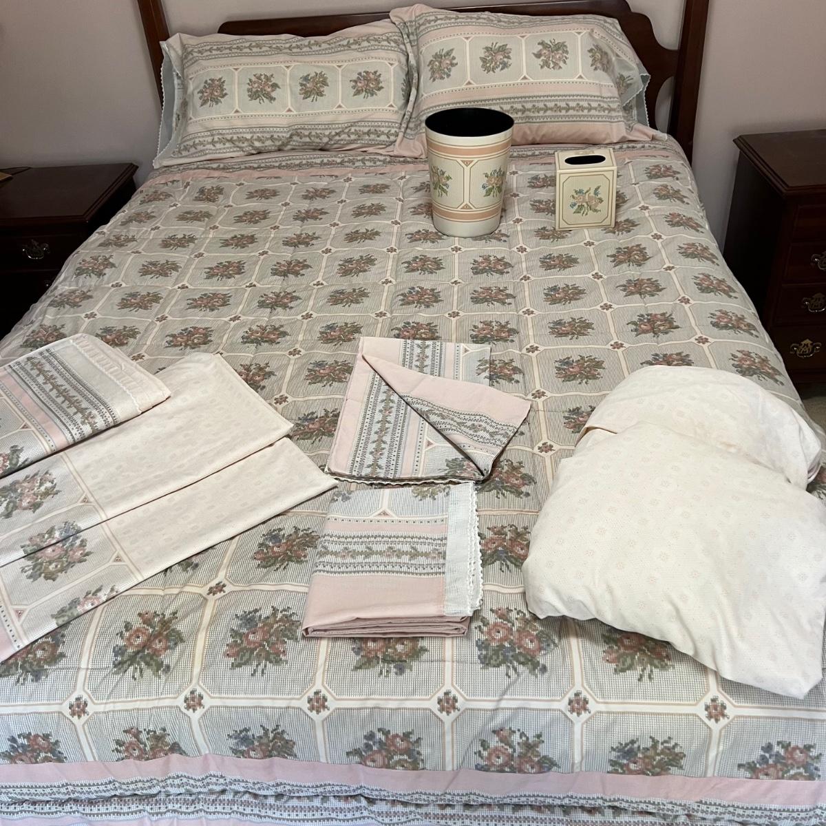 Lovely lace, pink and sage cross stitch-like printed design. Set includes two flat sheets, two fitted sheets, and four standard pillowcases. Additionally set includes box tIssue box cover, waist Can, bed skirt and two curtain panels with valances. Each curtain panel is 84”H x 64”W and each valance is 88“x 17.5“. Items appear to be in good condition with the exception of a small cleanable stain on the trashcan and a sticker marking on the top of the tissue holder. Inside of trash can could use a good cleaning and a small stain on comforter appears to be likely cleanable as well. Please note, bedframe and pillows in photo are not included. Local pickup only.