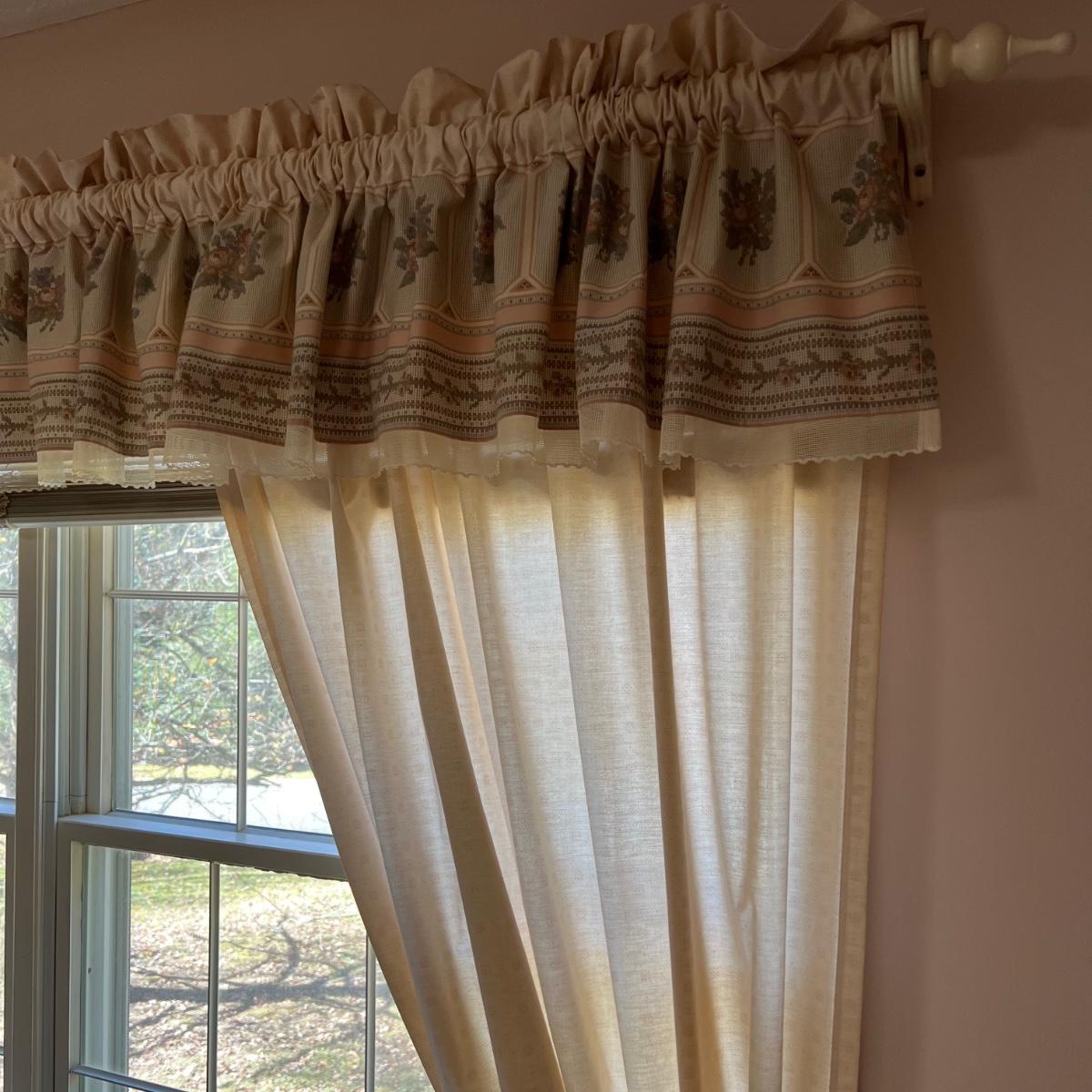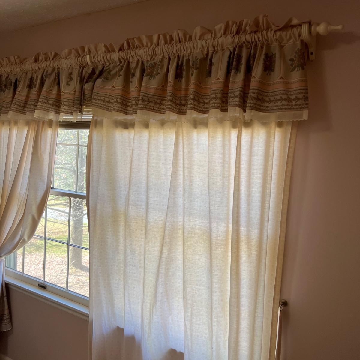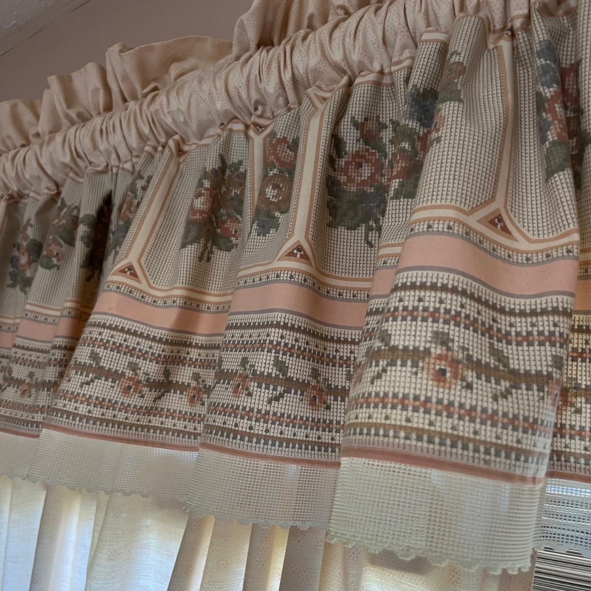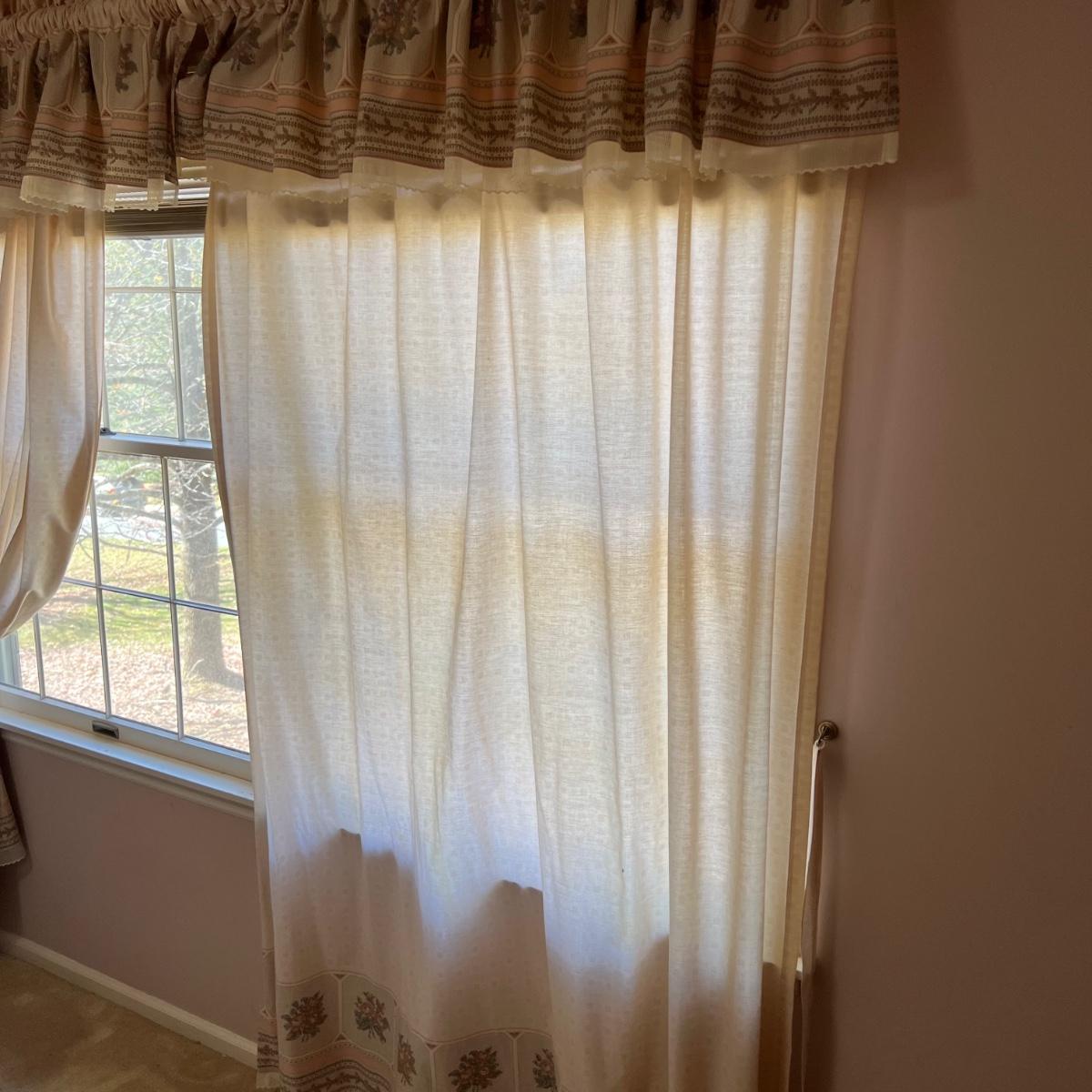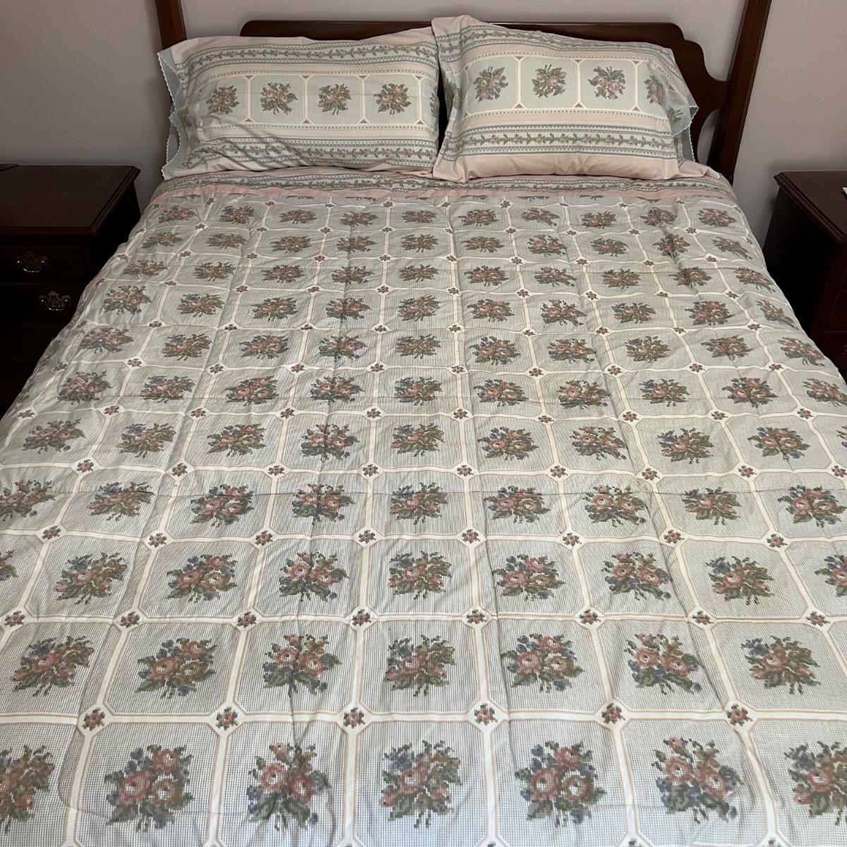 Lovely lace, pink and sage cross stitch-like printed design. Set includes two flat sheets, two fitted sheets, and four standard pillowcases. Additionally set includes box tIssue box cover, waist Can, bed skirt and two curtain panels with valances. Each curtain panel is 84”H x 64”W and each valance is 88“x 17.5“. Items appear to be in good condition with the exception of a small cleanable stain on the trashcan and a sticker marking on the top of the tissue holder. Inside of trash can could use a good cleaning and a small stain on comforter appears to be likely cleanable as well. Please note, bedframe and pillows in photo are not included. Local pickup only.