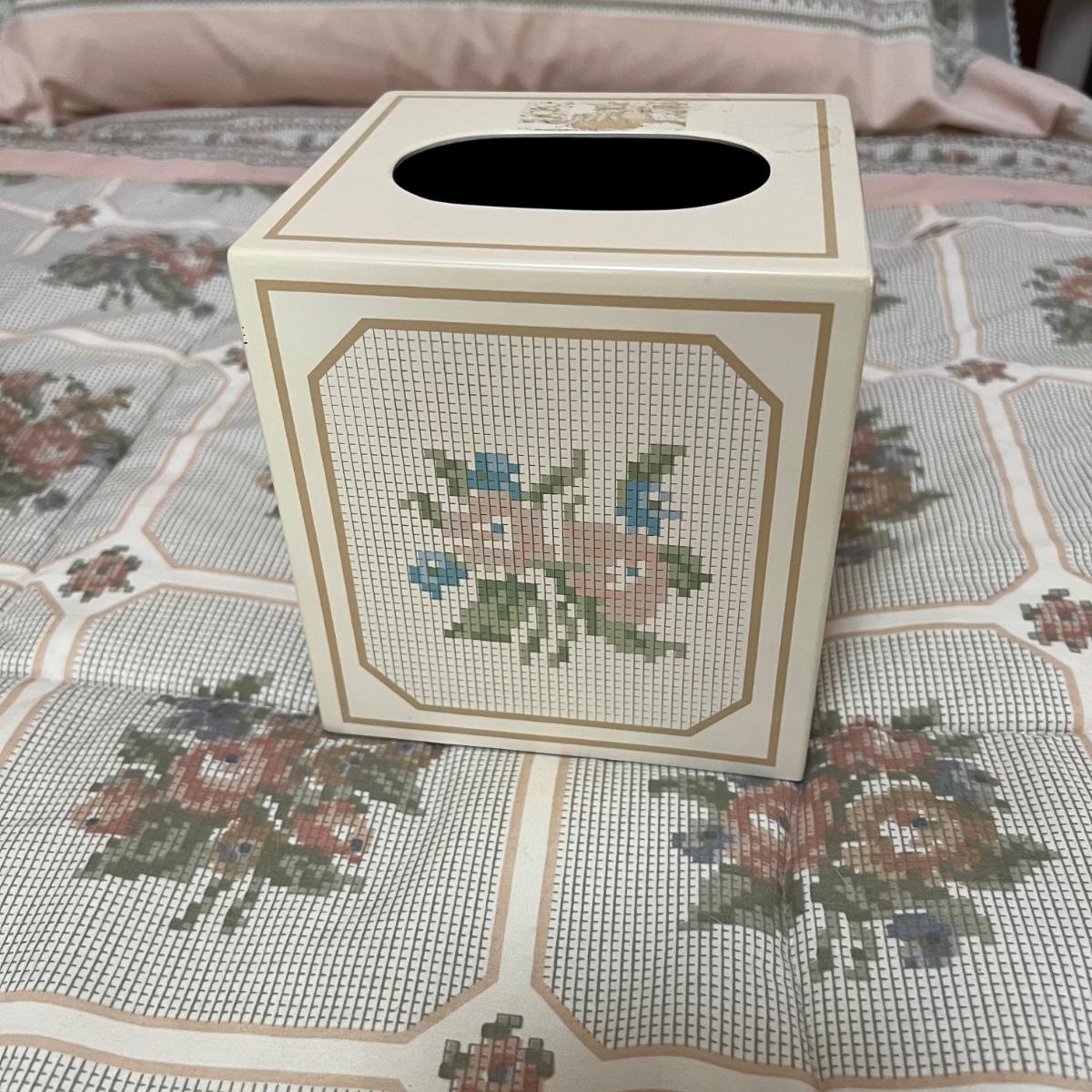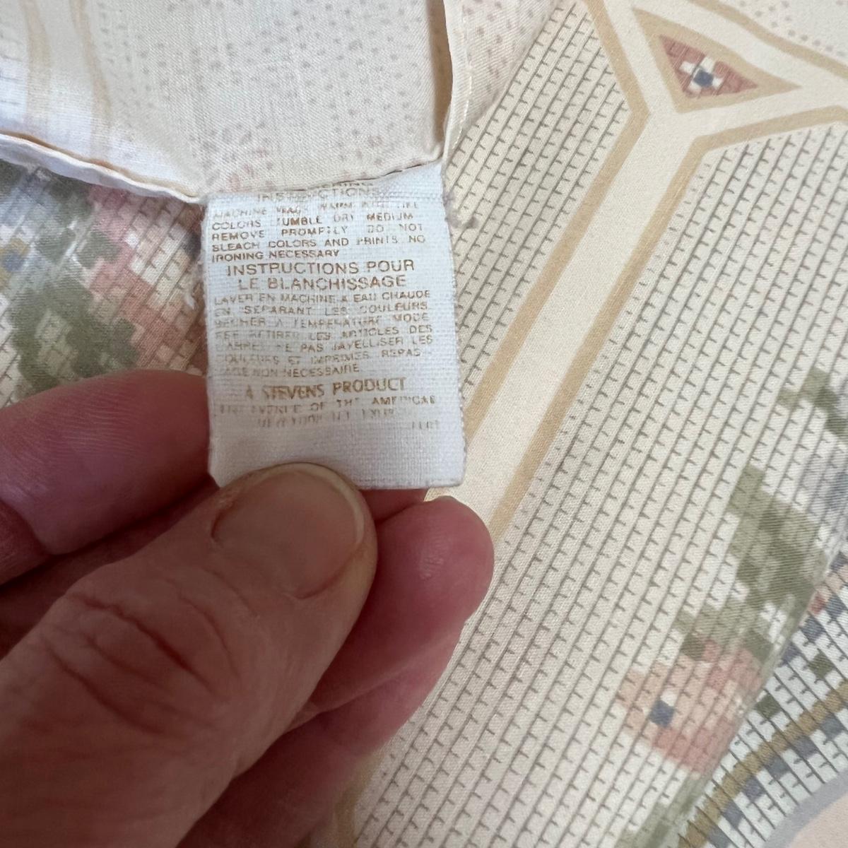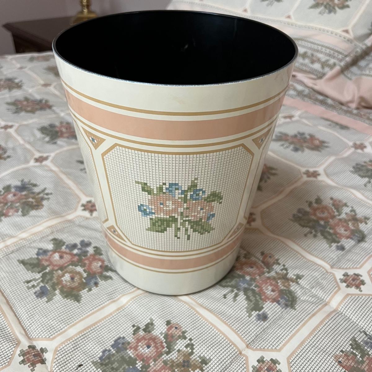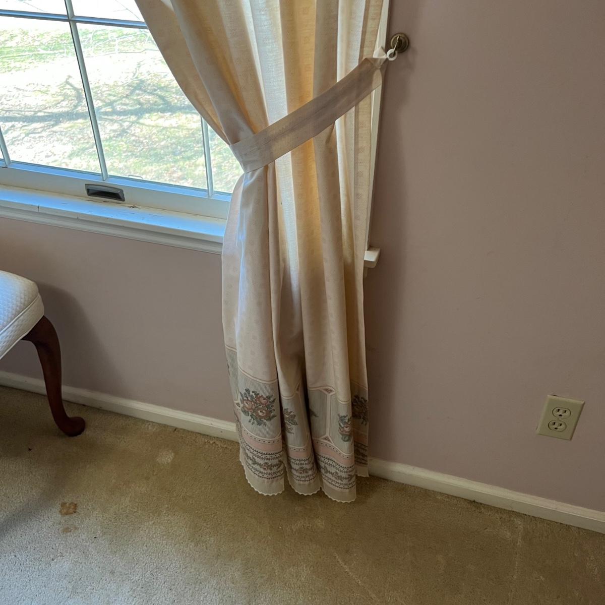Lovely lace, pink and sage cross stitch-like printed design. Set includes two flat sheets, two fitted sheets, and four standard pillowcases. Additionally set includes box tIssue box cover, waist Can, bed skirt and two curtain panels with valances. Each curtain panel is 84”H x 64”W and each valance is 88“x 17.5“. Items appear to be in good condition with the exception of a small cleanable stain on the trashcan and a sticker marking on the top of the tissue holder. Inside of trash can could use a good cleaning and a small stain on comforter appears to be likely cleanable as well. Please note, bedframe and pillows in photo are not included. Local pickup only.