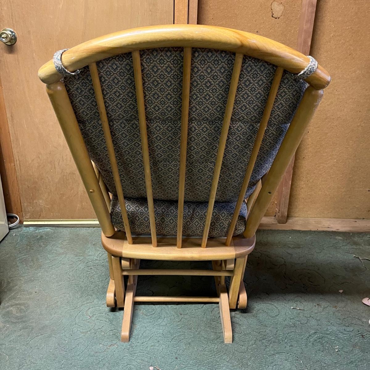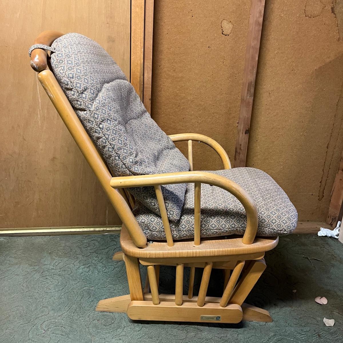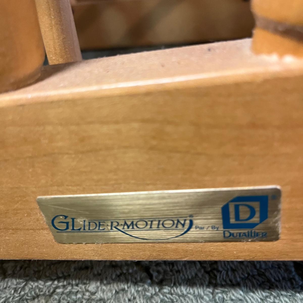 Lot includes a Dutailier glider rocker with padded cushions. Rocker measures 24” x 35” x 38” with a 20” seat height.