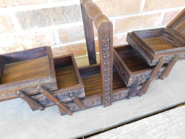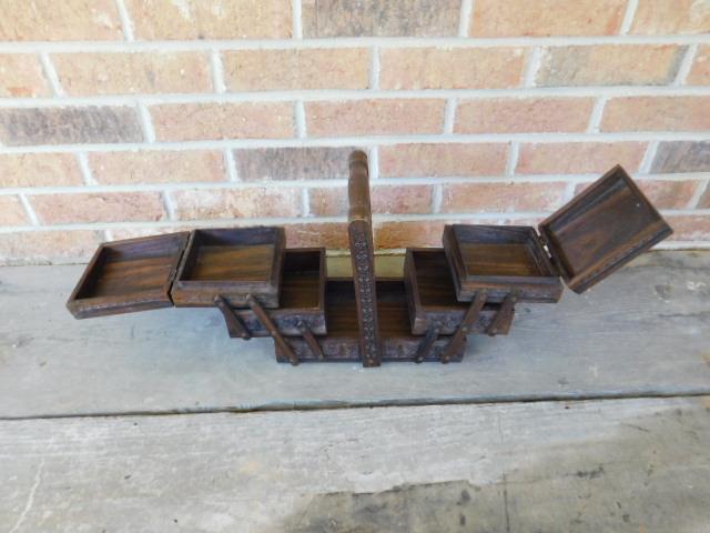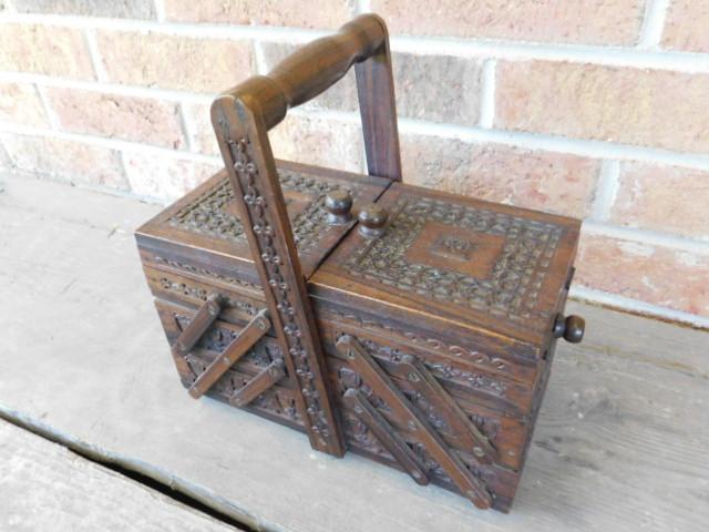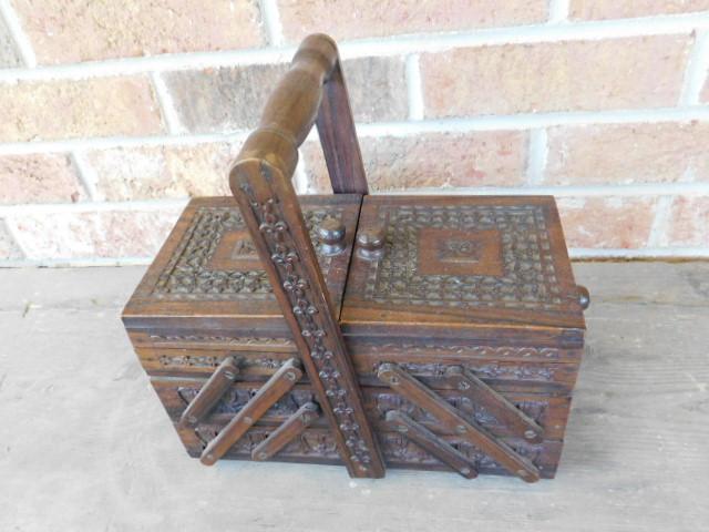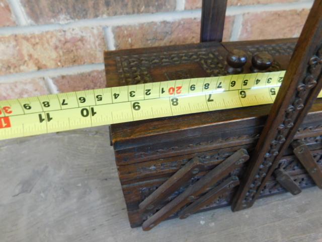 Dutch Hand Carved Accordian Sewing Box 9.5" may have some wear or scratches