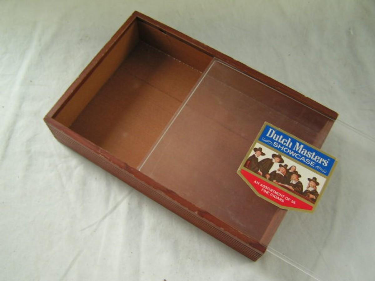 Dutch Masters Showcase, cigar box. Solid wood construction w/ sliding clear plexi lid. About 11-1/4"x7-1/2"xx2-1/4". Very nice clean condition. VG to EX.