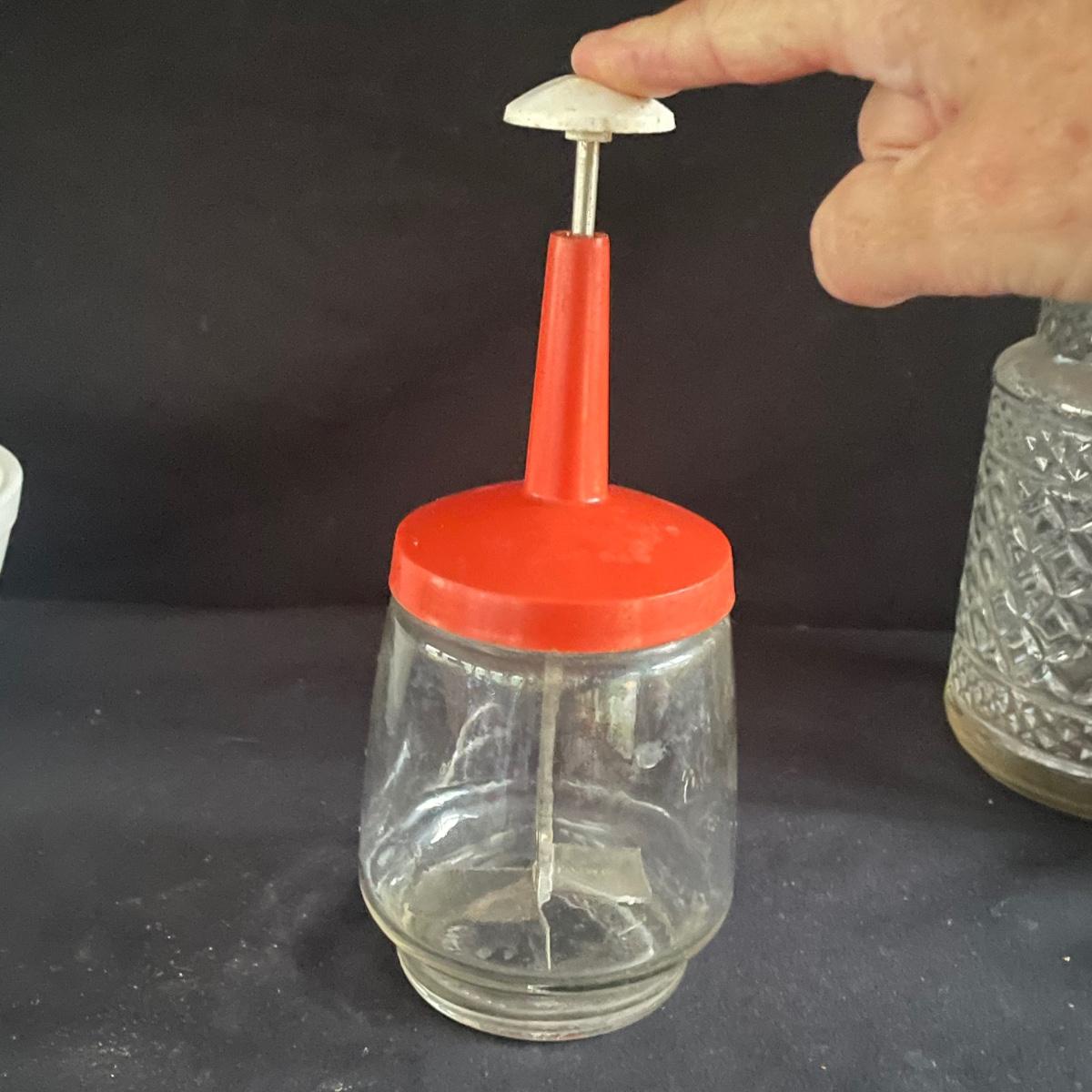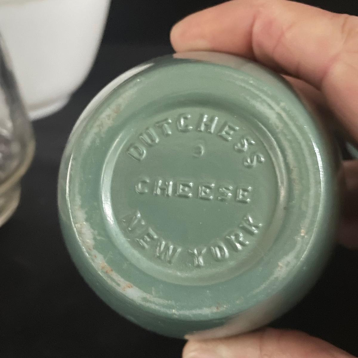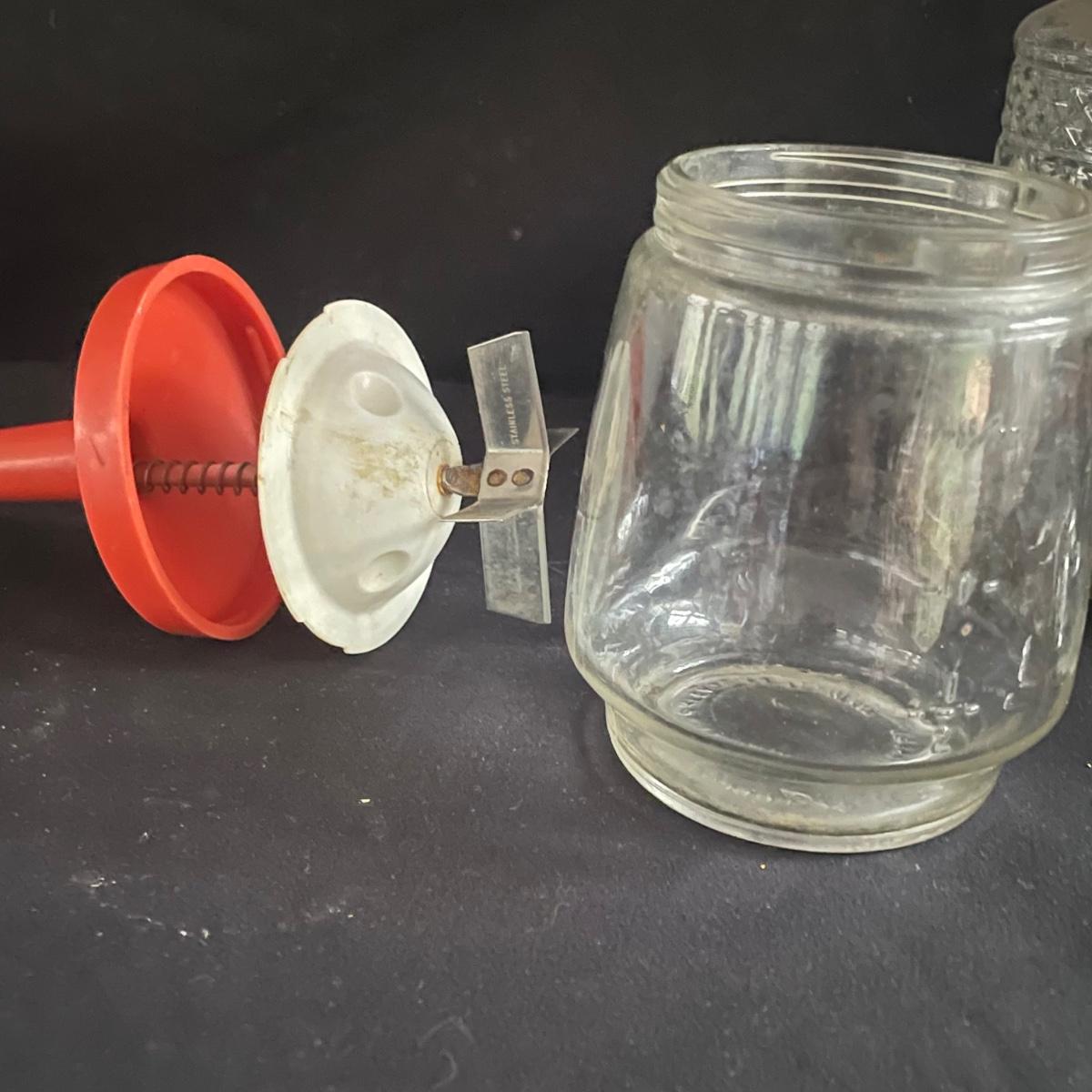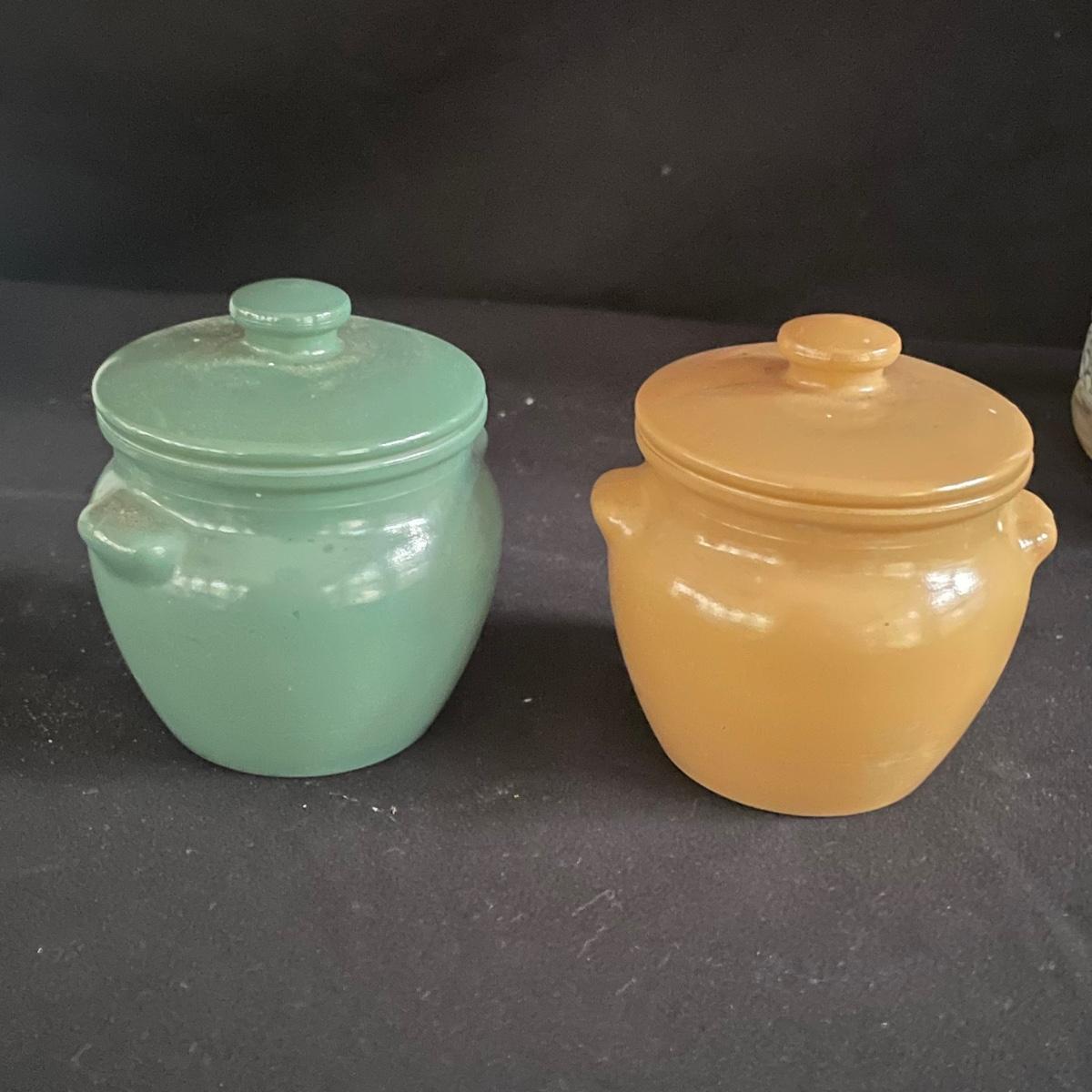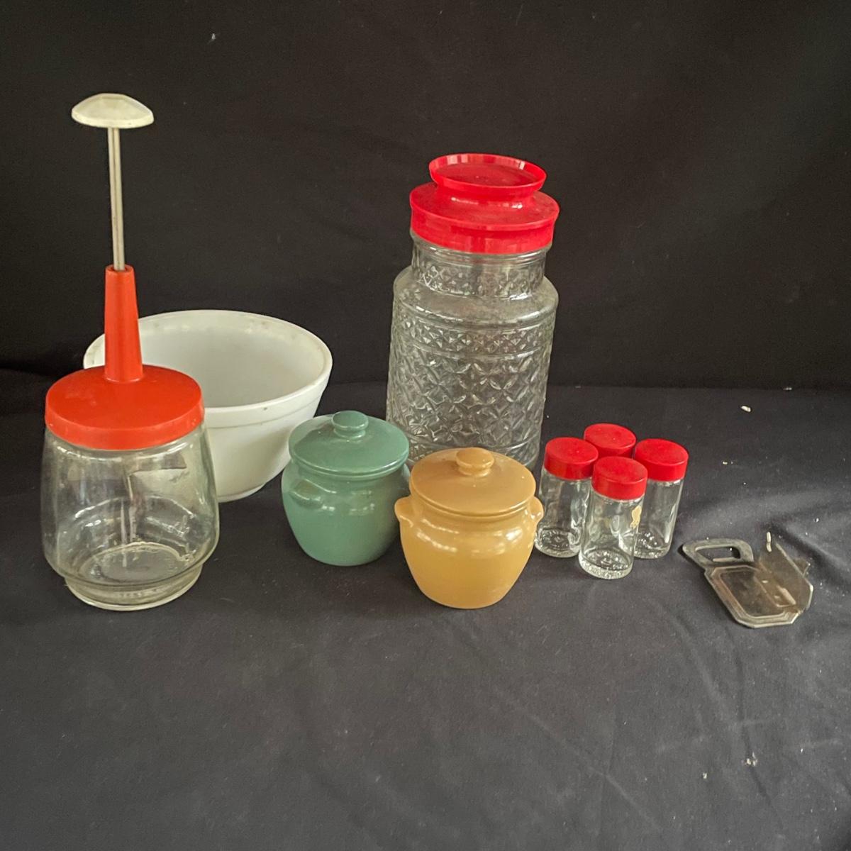 Ten items in this lot that includes two small cheese pots from Dutchess of NY (note one pot has a chip on the rim). Lot also includes a handheld mixer, large glass jar, four small containers, a Pyrex bowl and a can opener.