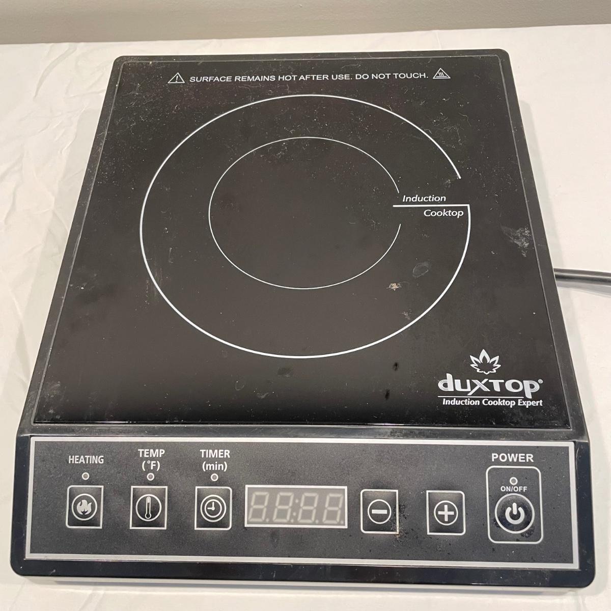 Duxtop Induction Cooktop Expert induction cooker. Appliance powered on when plugged in. Measures 12" x 13" x 3"H. A quick internet search shows the EO error message will occur if an induction pan is not placed on the cooktop. See images. Local pick up only.