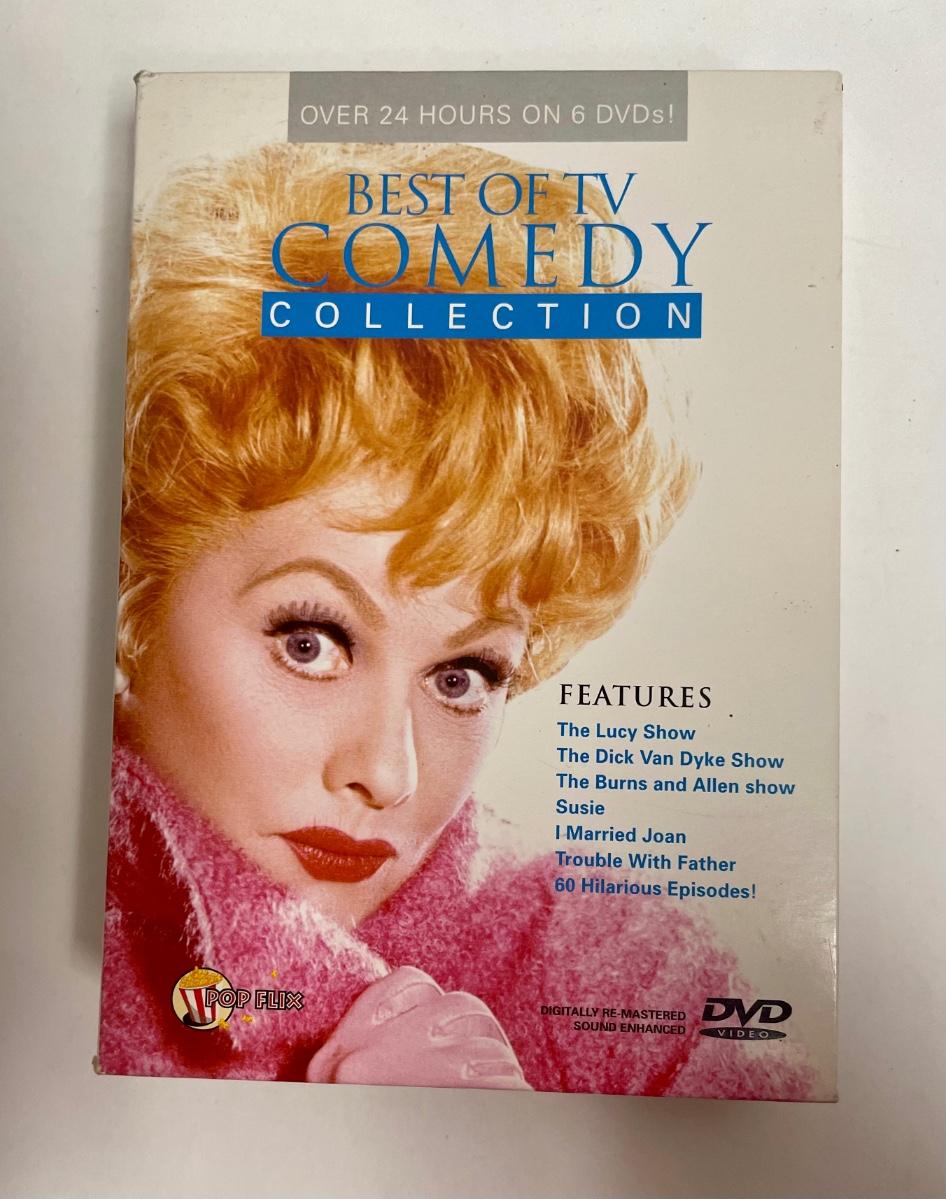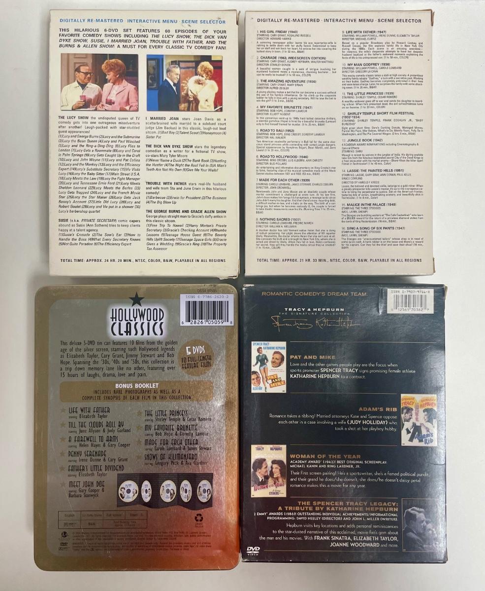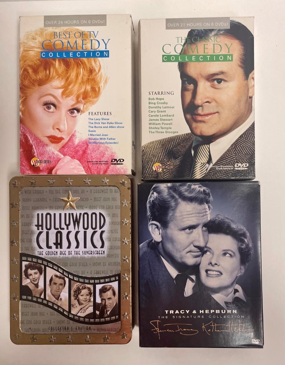 Boxed sets include the Lucy Show, Burns and Allen, Bob Hope Road Movies, classics like The Jungle Book, and several movies starring Katherine Hepburn and Spencer Tracey. Good condition.