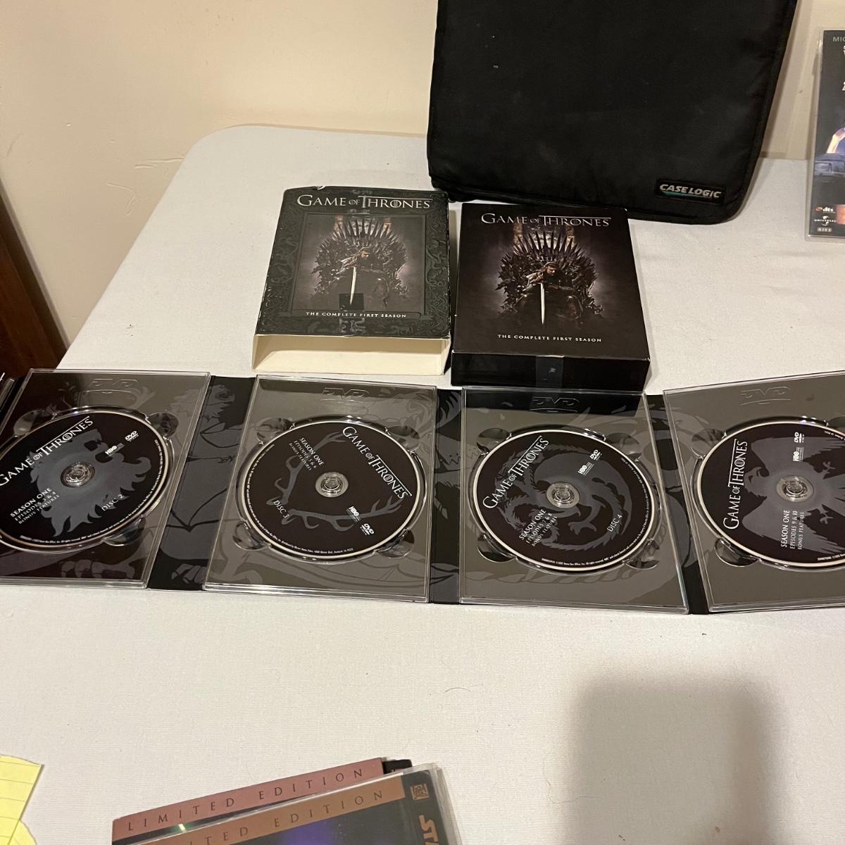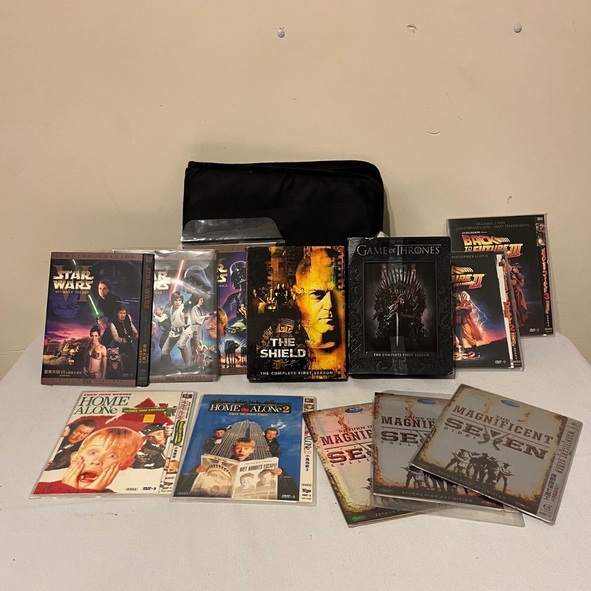 Lot contains a large selection of DVDs including: Game of Thrones season 1, Back to the Future 2 and 3, Star Wars The Empire Strikes Back, Return of the Jedi, & A New Hope, Home Alone, and many more. The DVDs in individual plastic appear to be in good shape, while some of the other DVDs have some scratches.