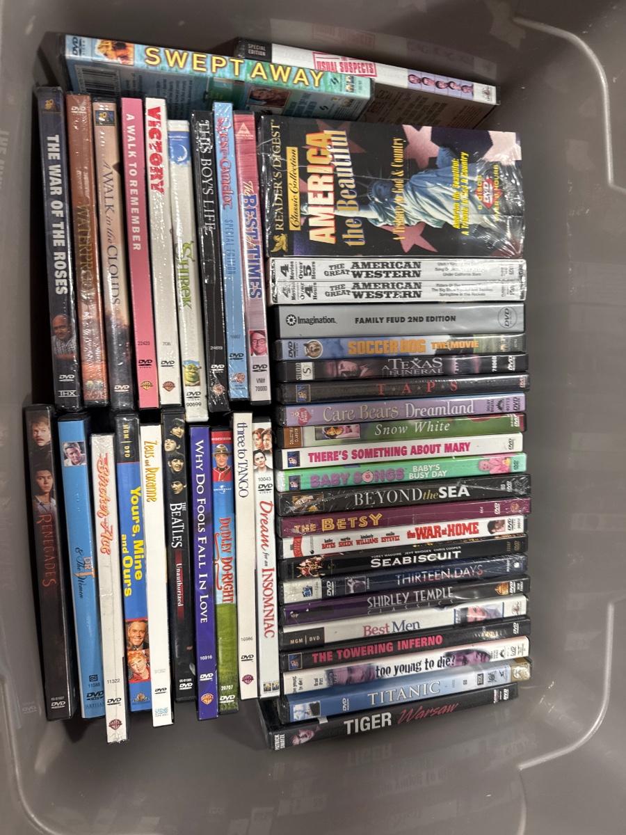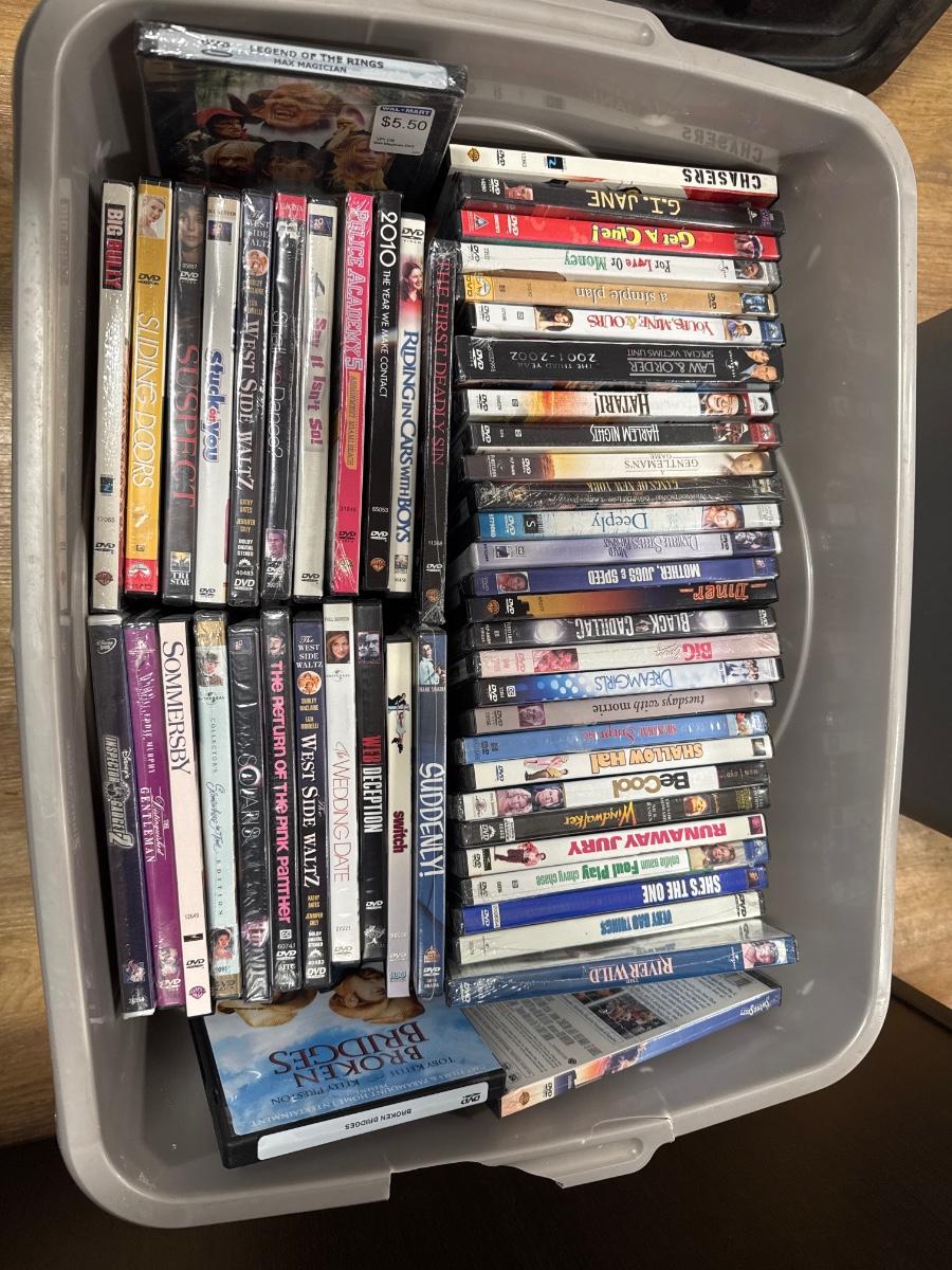 Over 80 movies and most are new in package. Includes tote without a lid.