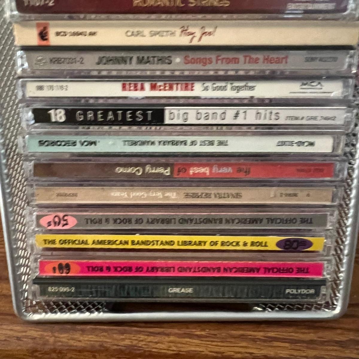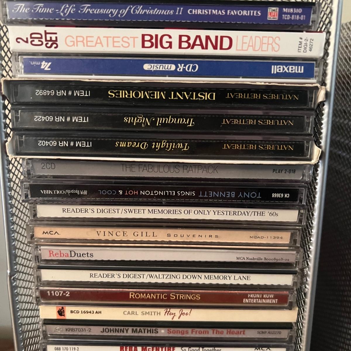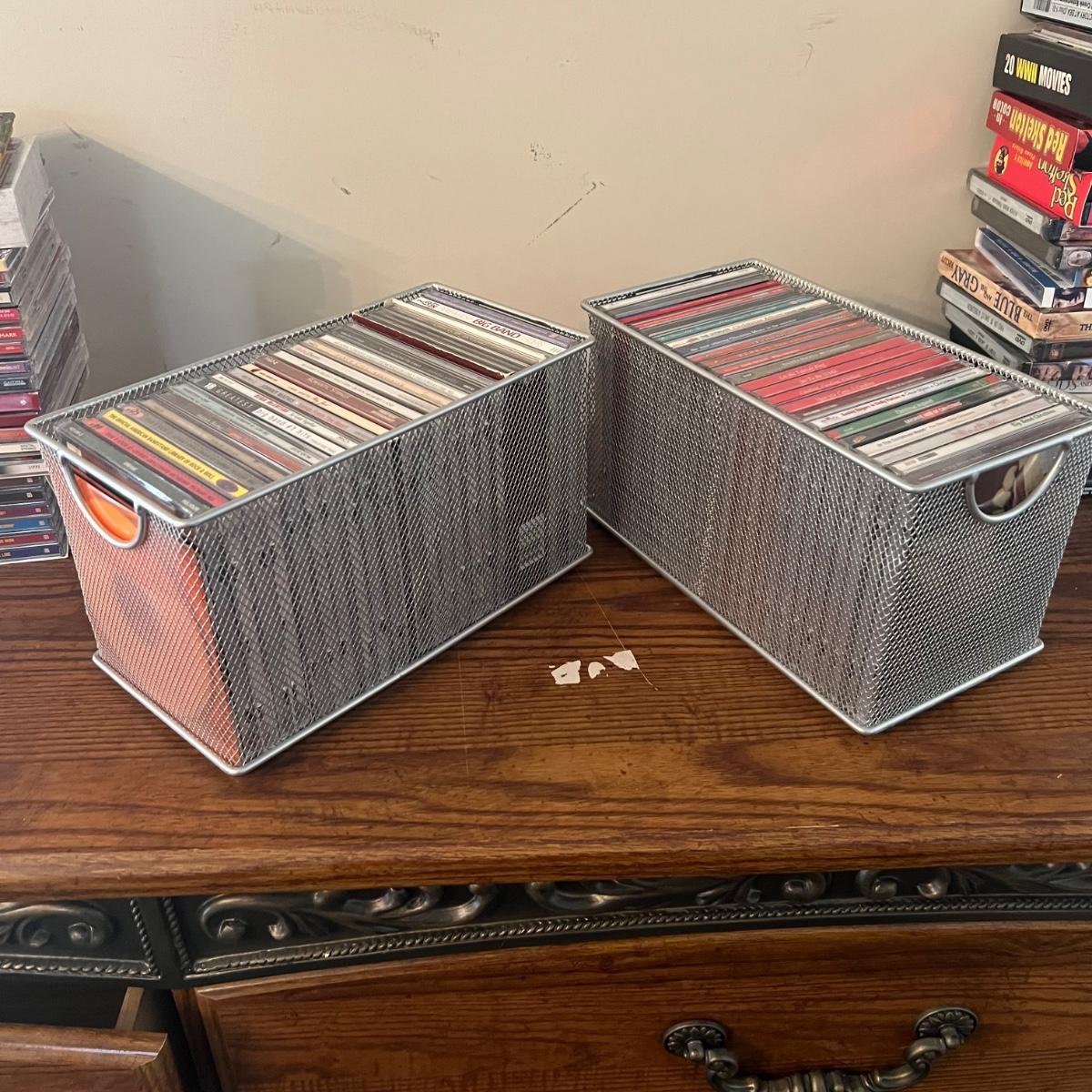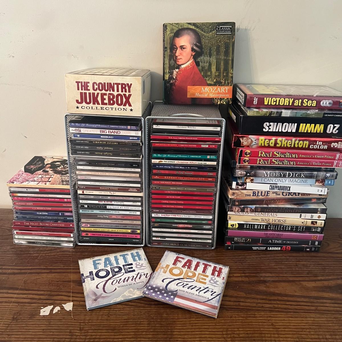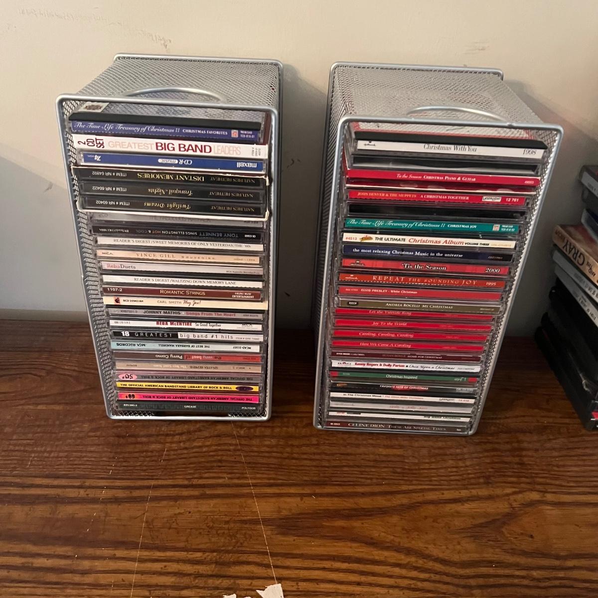 45 plus DVD’s & 50 plus CD’s are accompanied by 2 metal holders that hold around 20 each; they measure 5” x 11” x 6”H. Both DVD’s and CD’s include a few box sets, see images. Not all have been checked for condition and contents, but the ones we did check were correct and in good condition. Genres include country, Xmas, Classical and more, see images for titles.