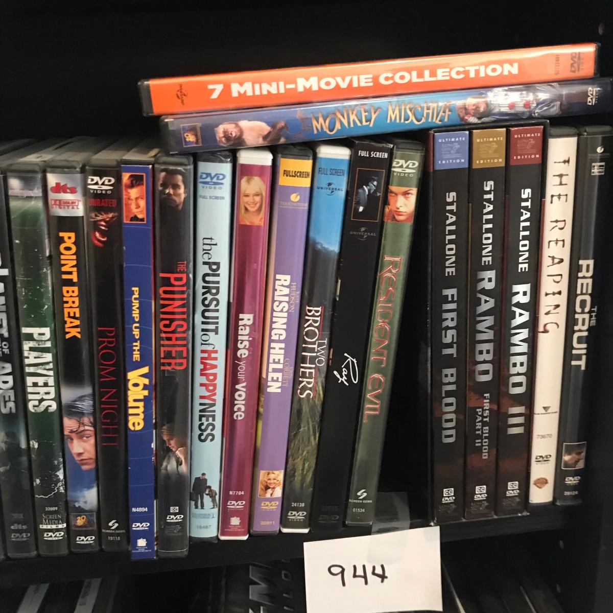 On DVDs: All DVDs are in the cases. Please look at photo's for titles, selections, and quantity. We tried to sort by genre, but were not always successful with time constraints! What you see is what you get. Also, we are sorry...there may be some duplicate movies in the lot. Also, you are only getting the movies above the number, not below!!