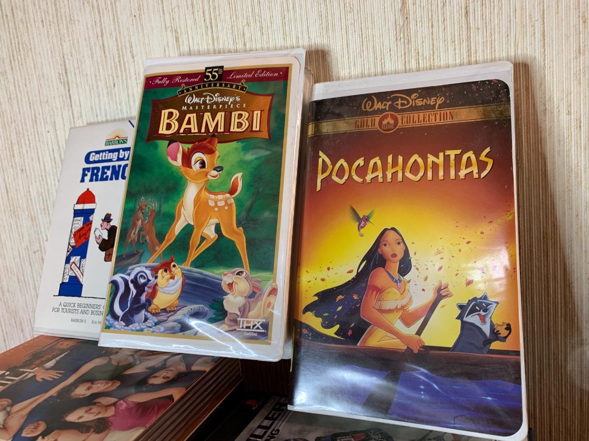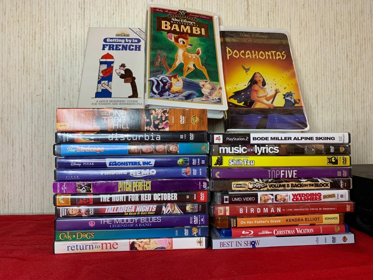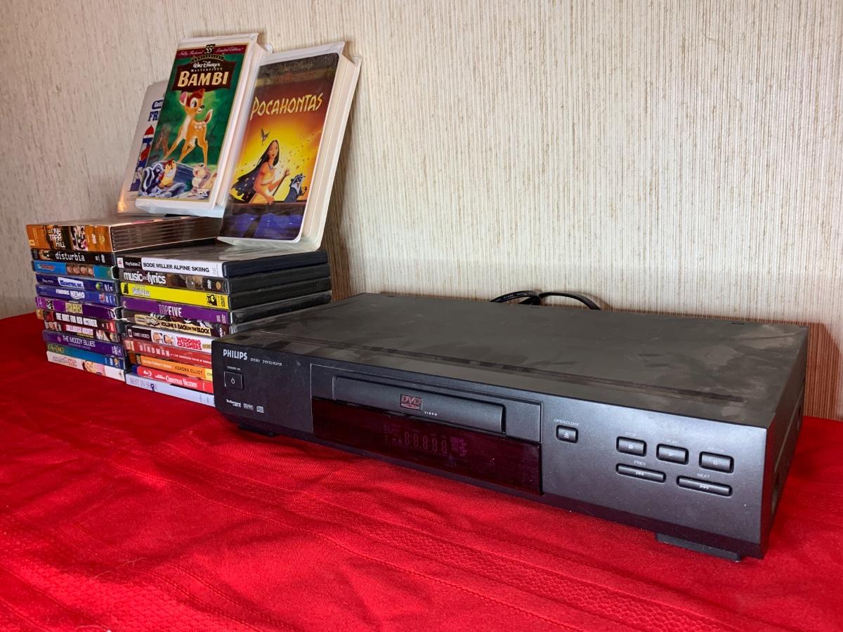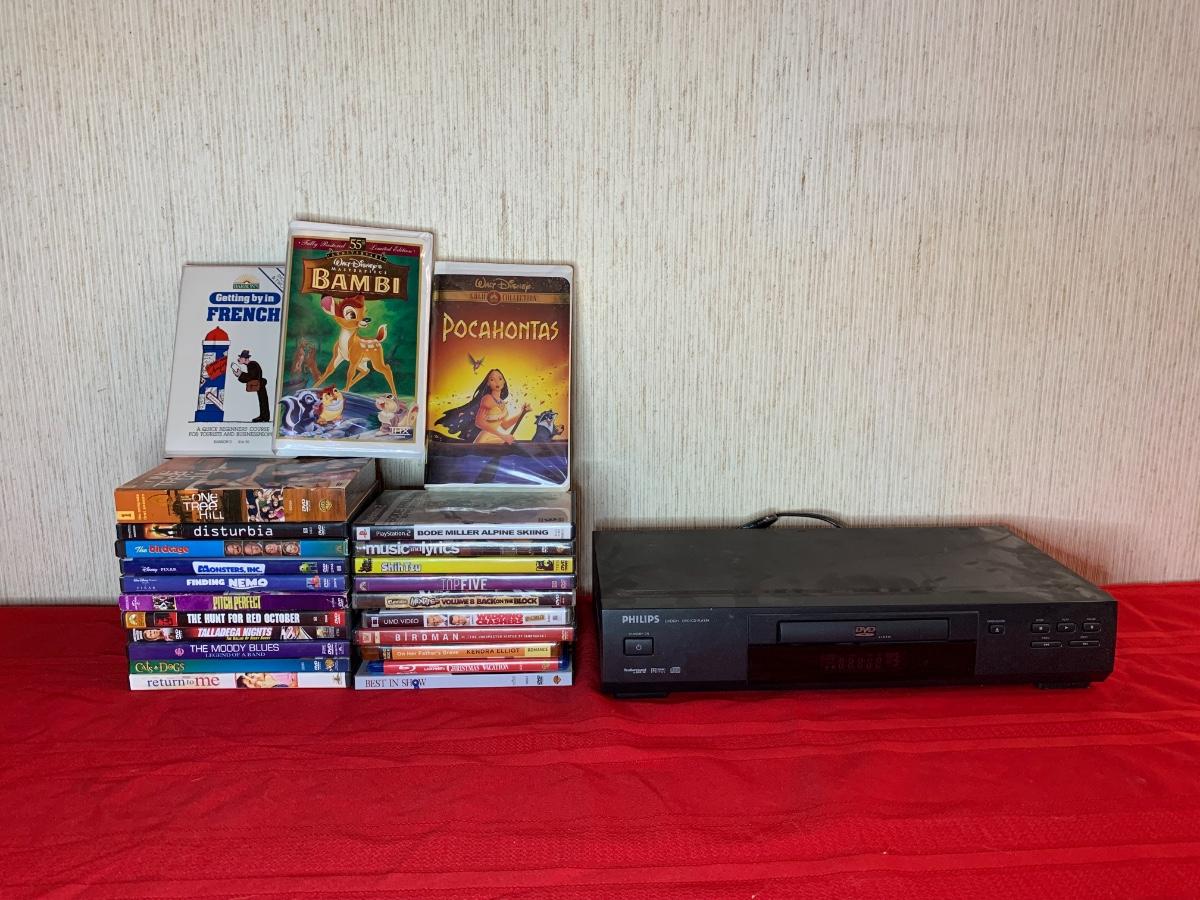 Lot includes an assortment of DVDs and VHS’s and one DVD player *not tested*