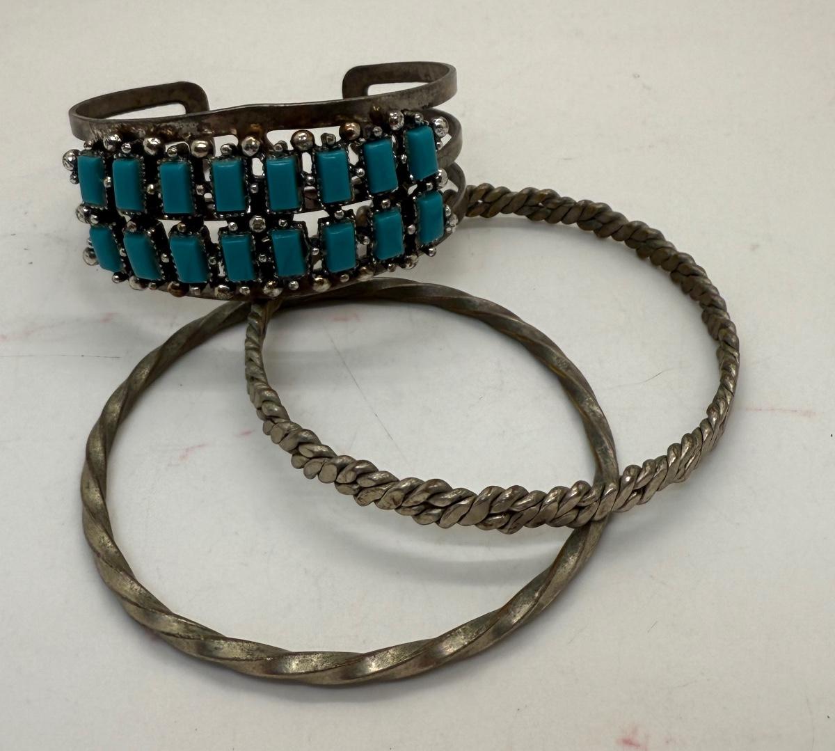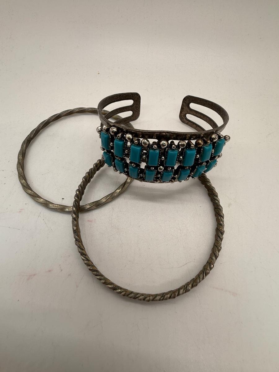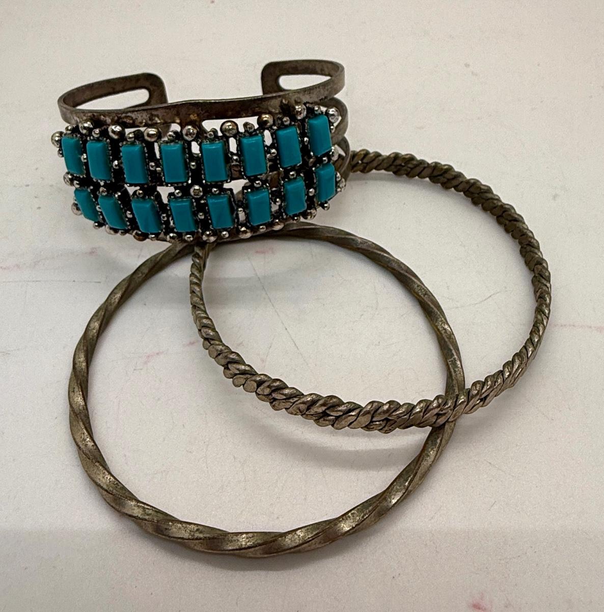 One bracelet has rectangular faux turquoise stones. All in good condition.