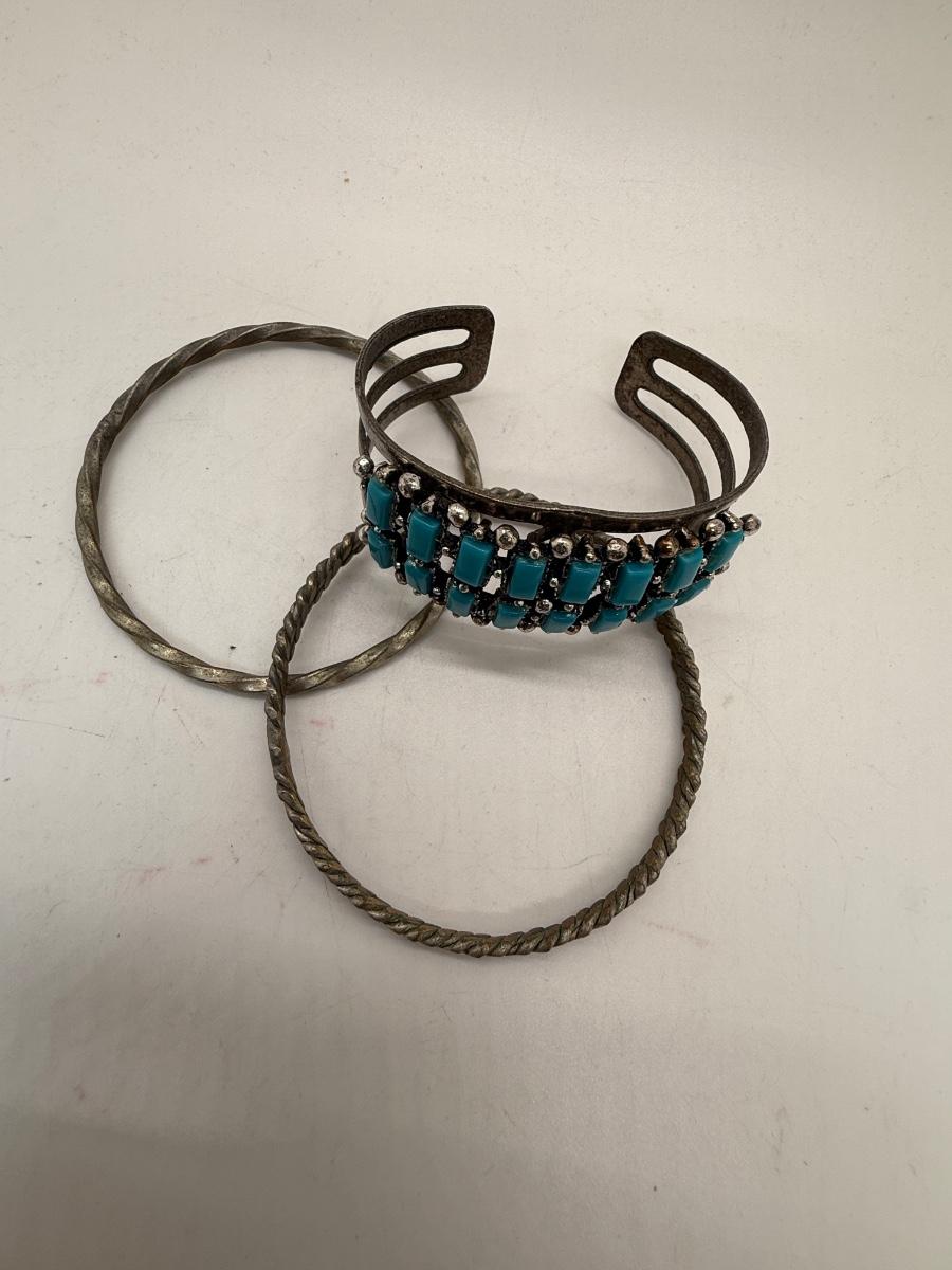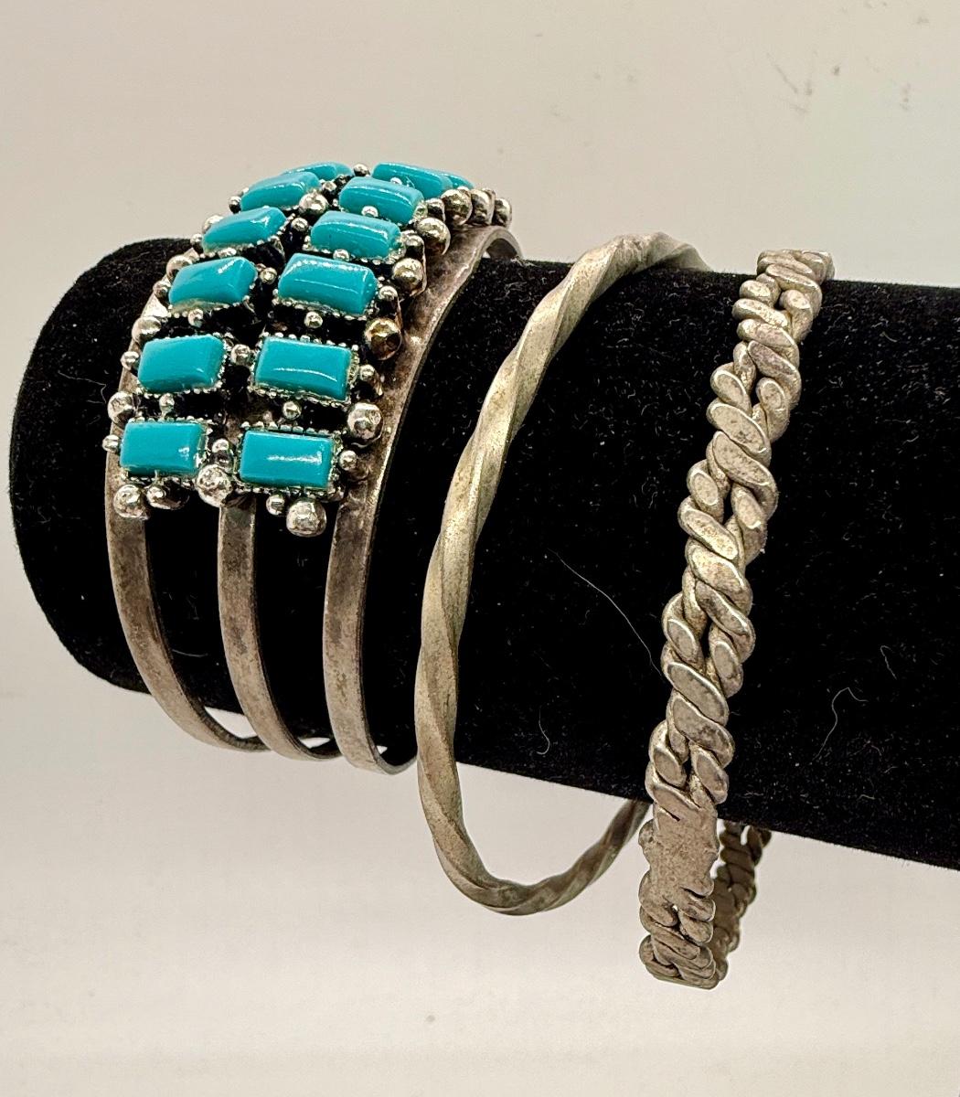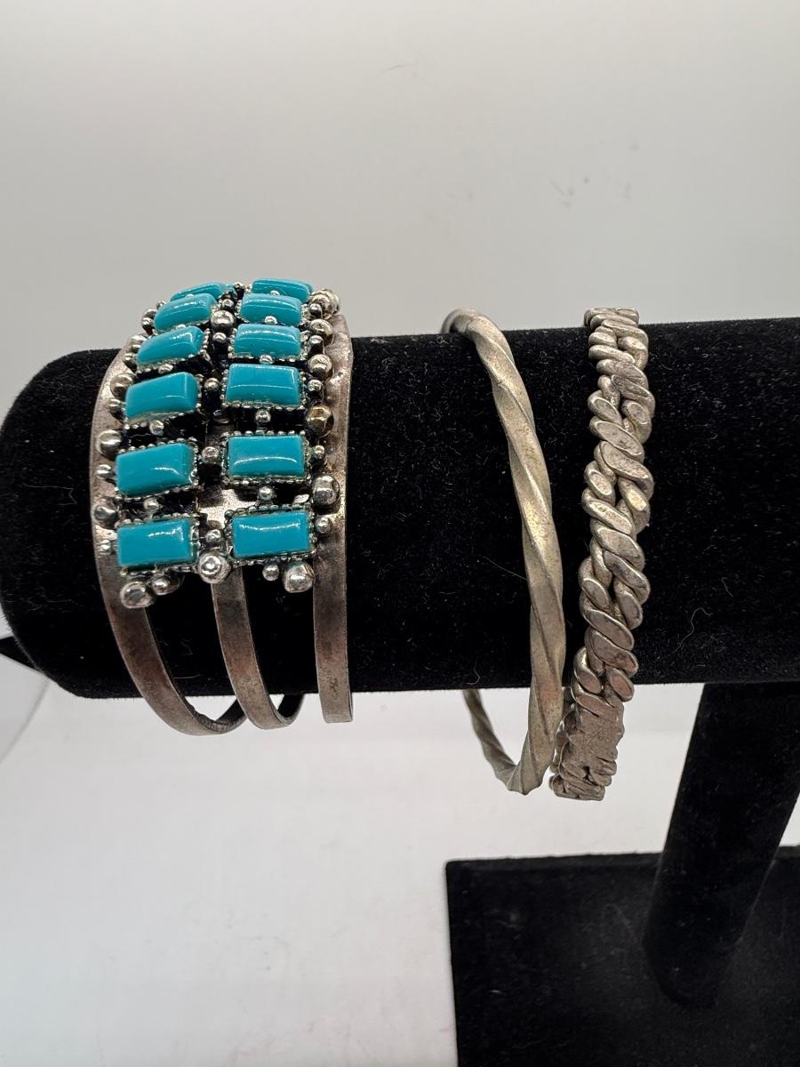One bracelet has rectangular faux turquoise stones. All in good condition.