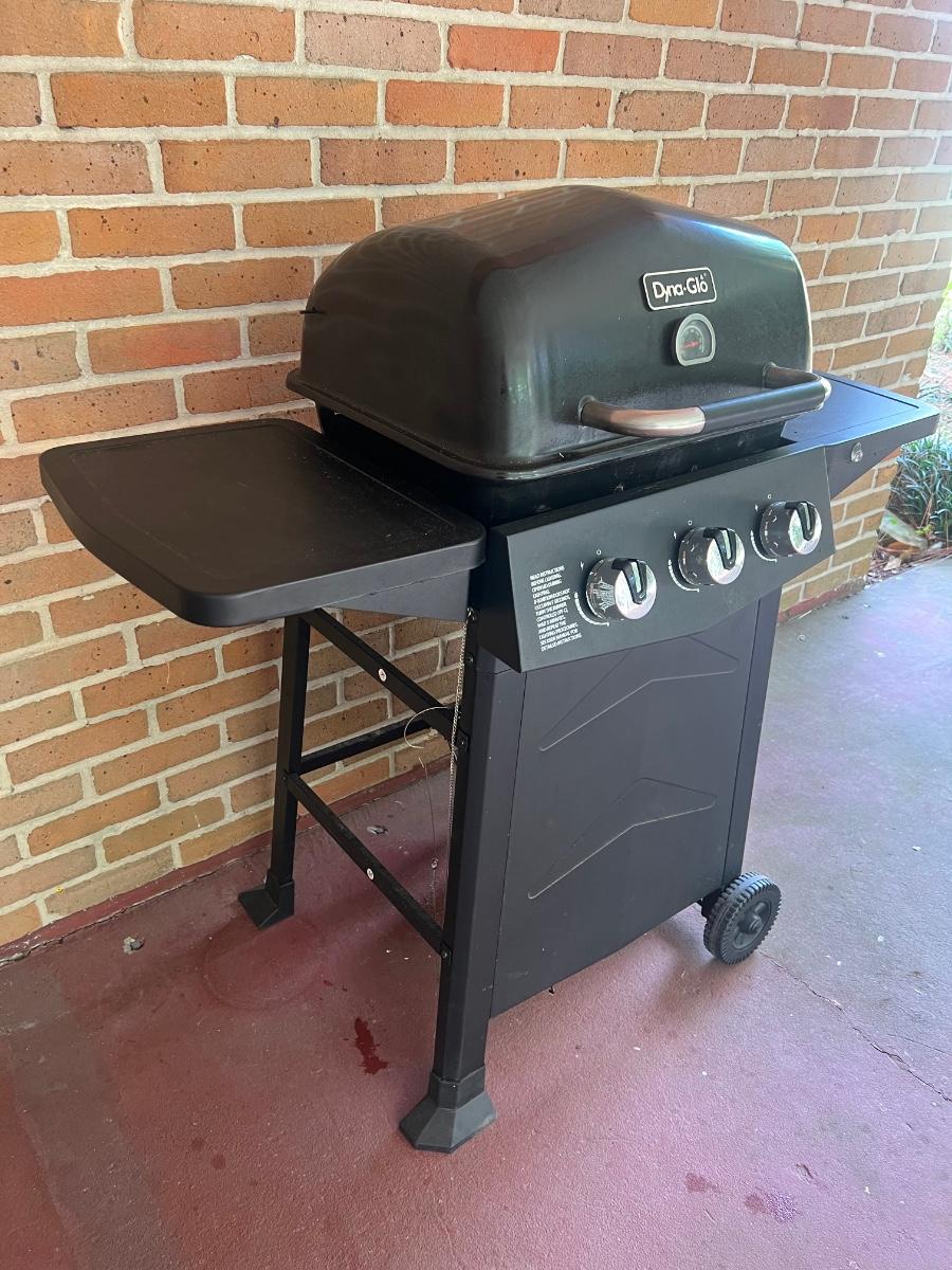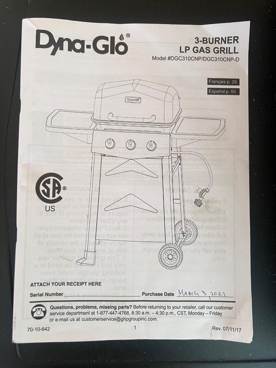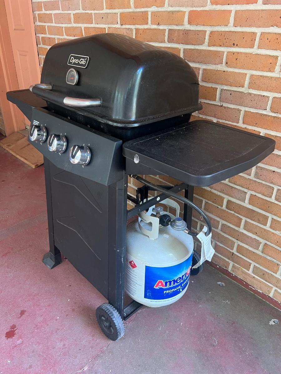 Propane tank feels to be pretty full and comes with the grill. Book says it was purchased on March 3,2021. Great shape and always been under cover. Grill cover comes with it as well. Self Igniters work as they should.