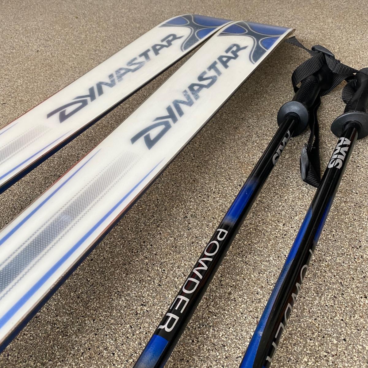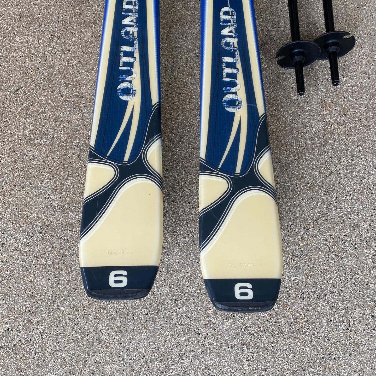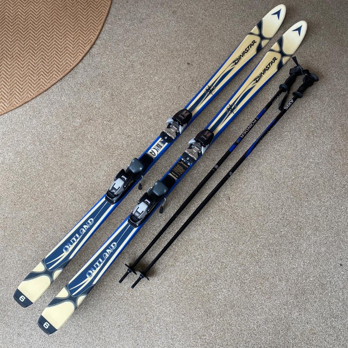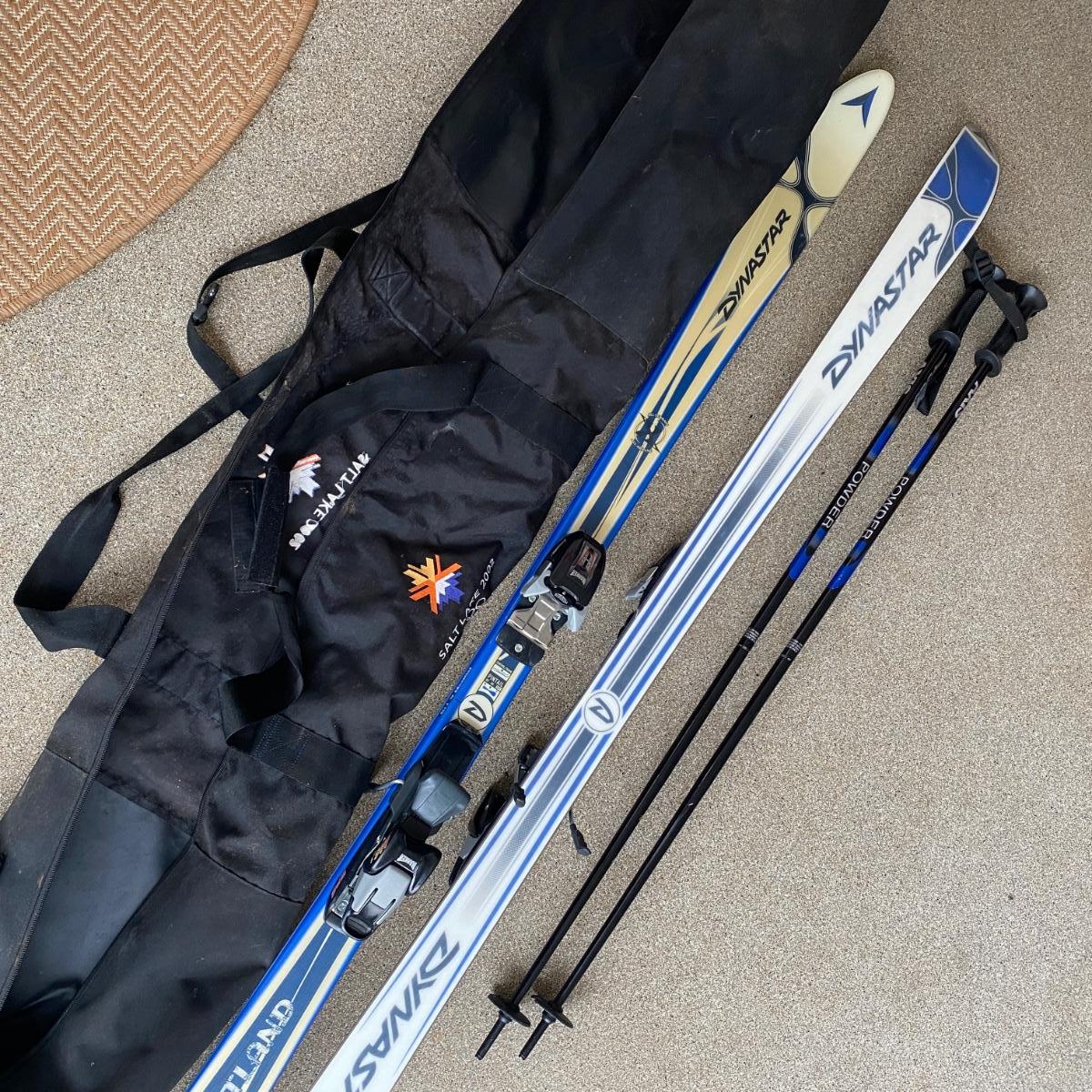 Pair of Dynastar Outland Skis, Axis poles and storage bag. Skis are in excellent condition and appear to be unused. See photos for all markings. Storage Bag has Salt Lake 2002 logo embroidered on it. Measures 67” long by 4” wide. Local pick up.