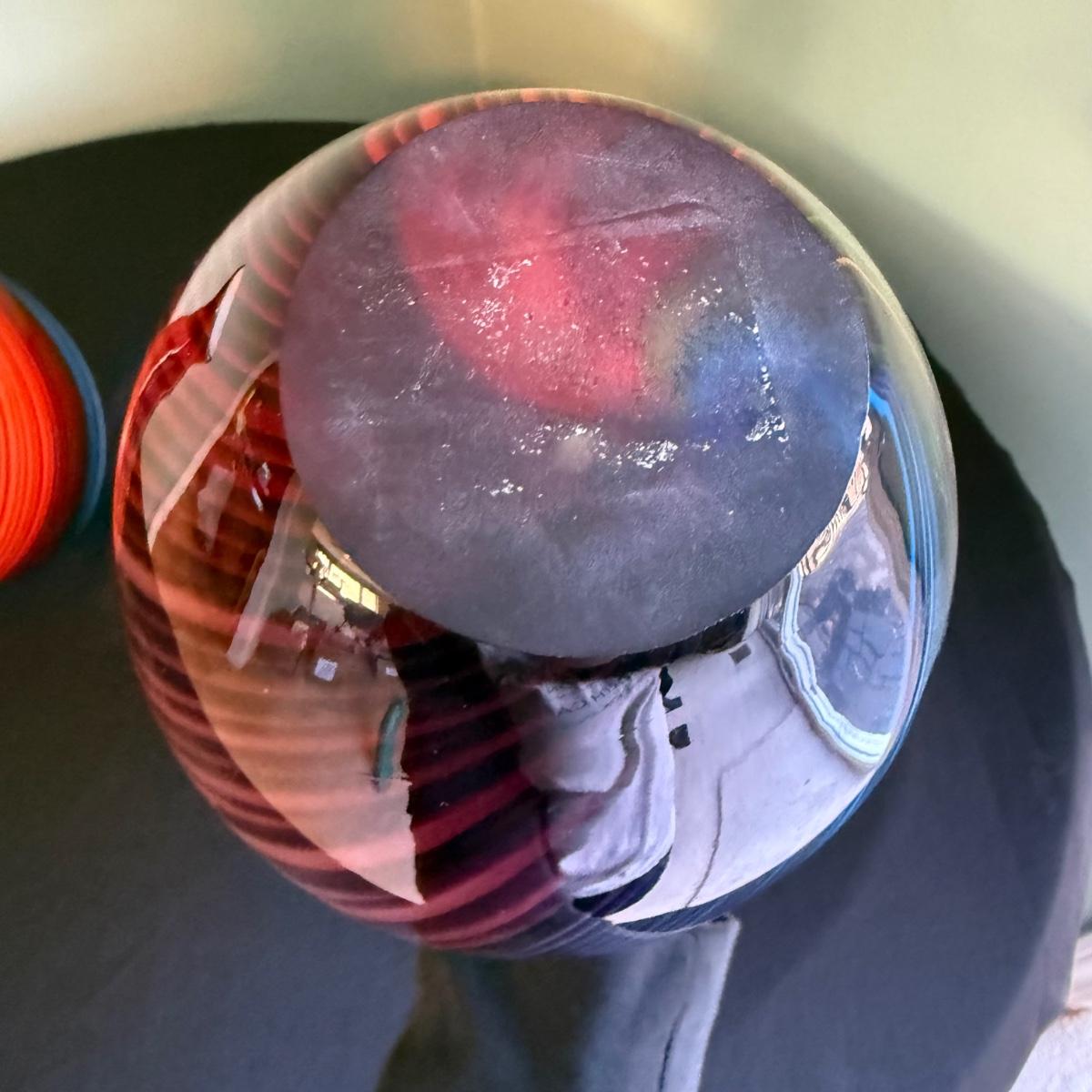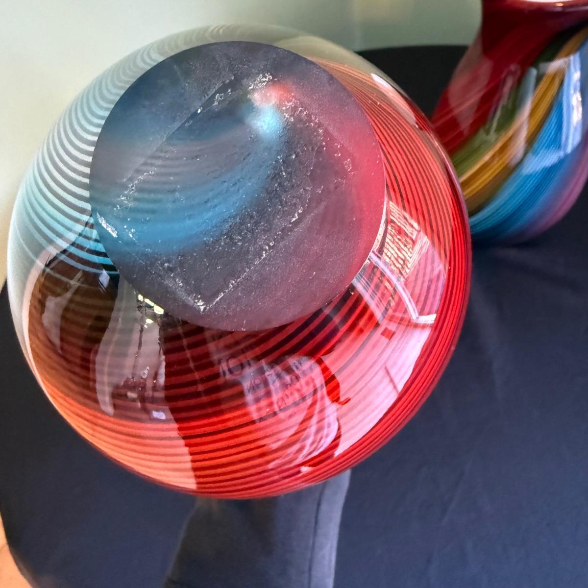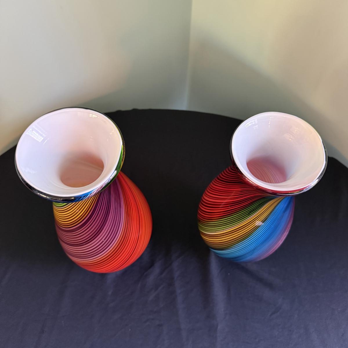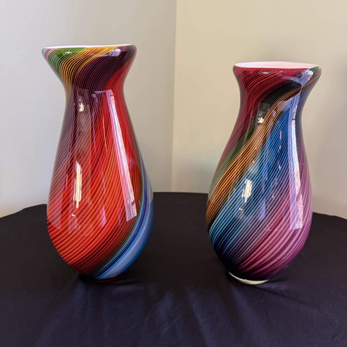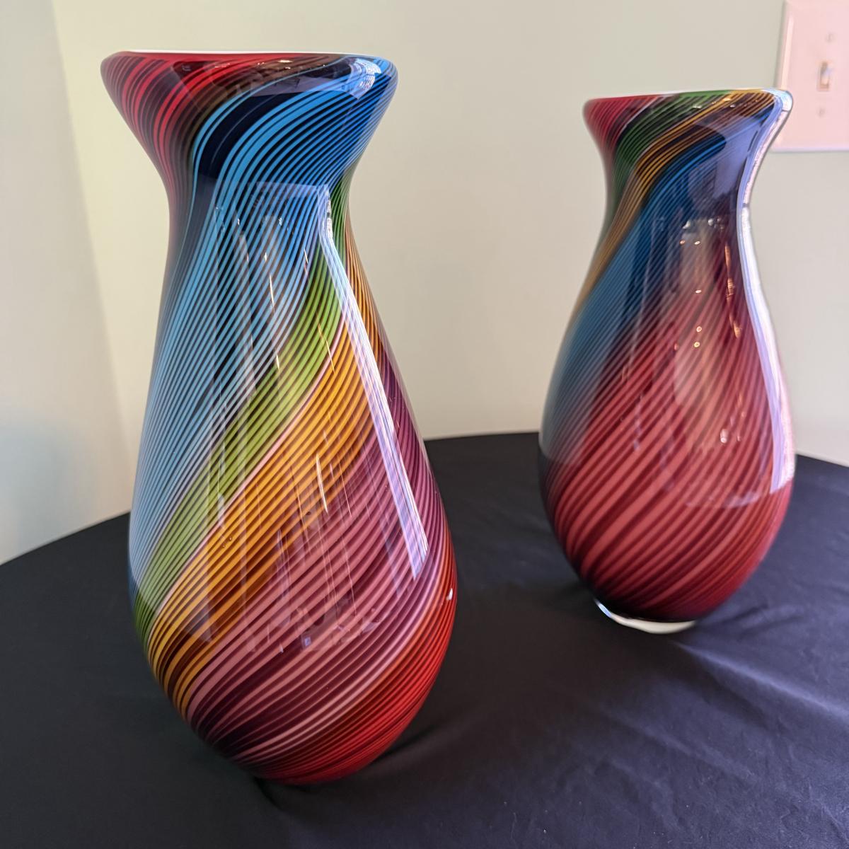 This lot contains two what appears to be Rainbow Twist Toscana vases by Dynasty Gallery. Each vase features a vibrant rainbow design bursting with color and a white interior. They are both close in size with one being slightly bigger measuring 4”D at the mouth x 11.5”H and the smaller measuring 3.5” D at the mouth x 11”H. There are no identifying marks on either of these pieces. Shipping available.