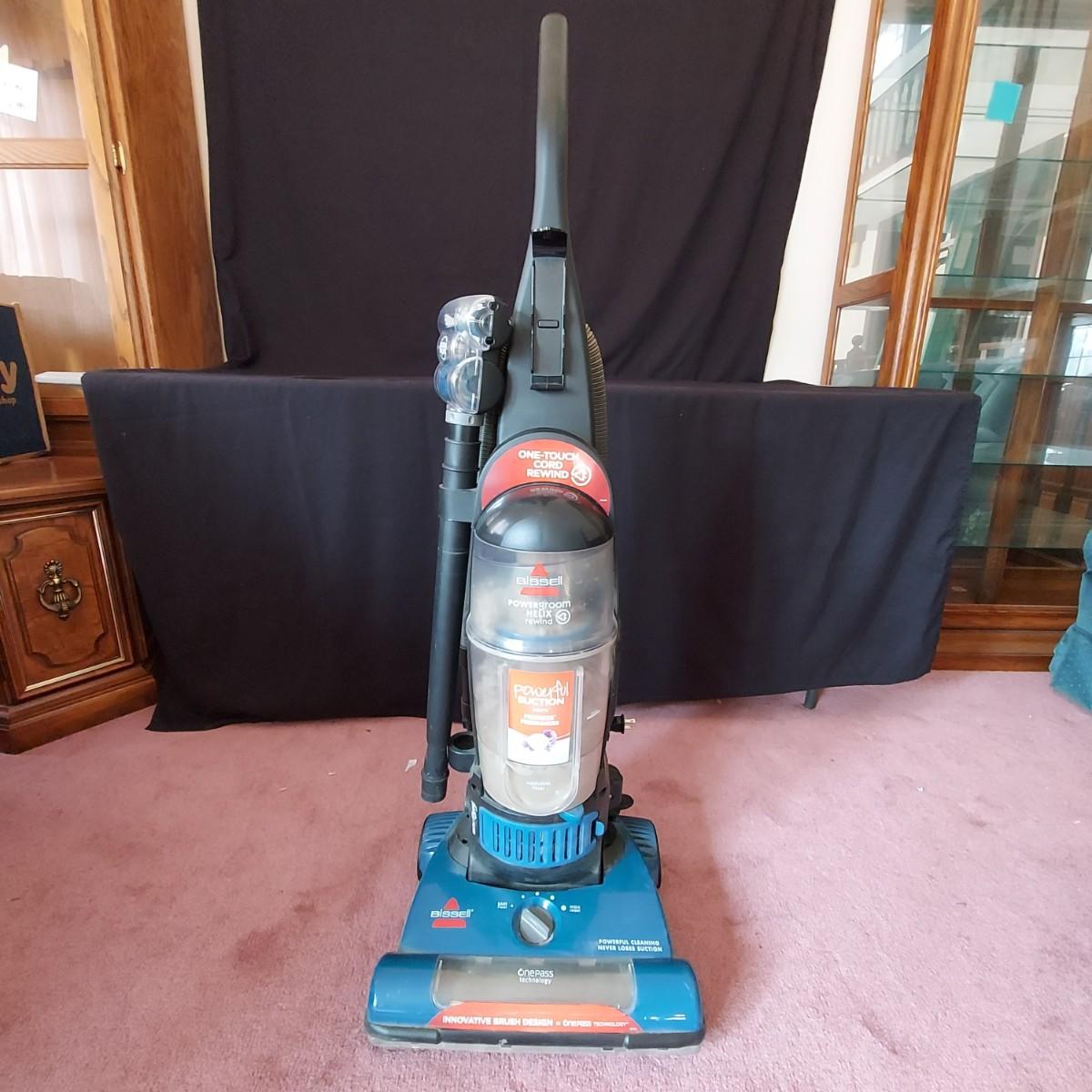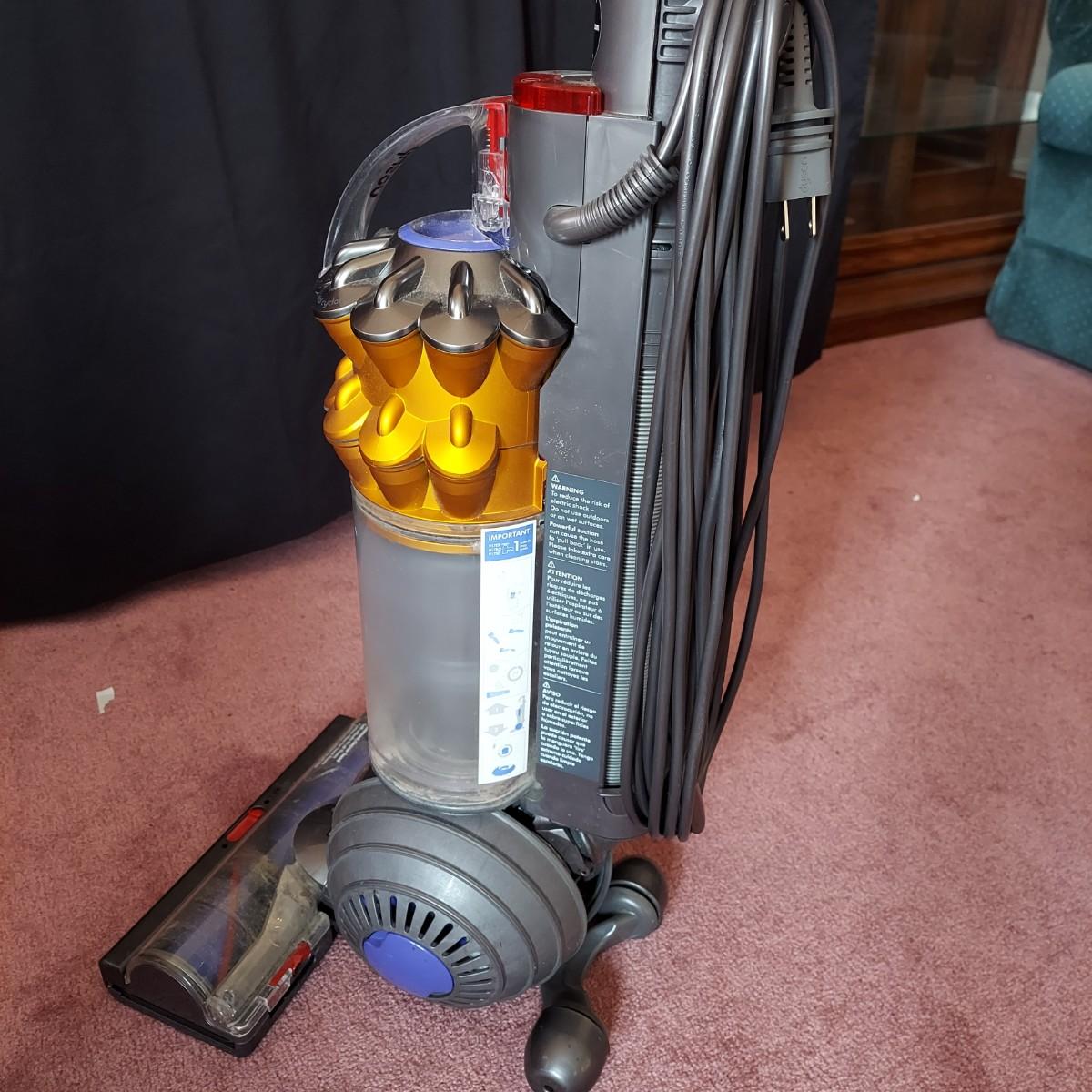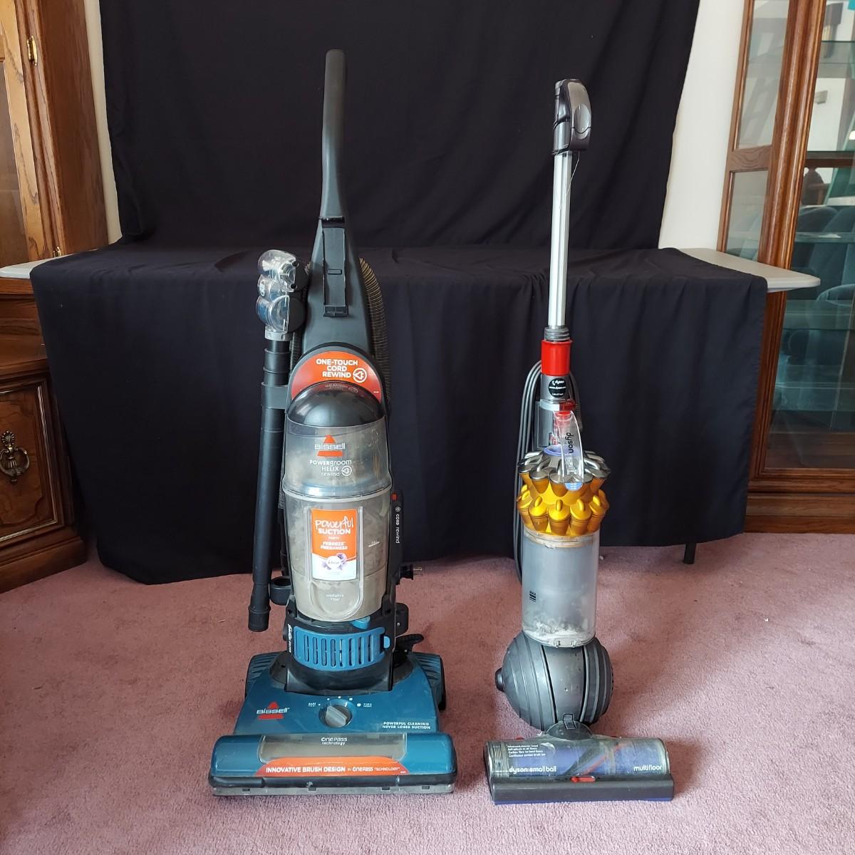 Dyson and Bissell Vacuums. Dyson Small Ball upright corded vacuum. Bissell Powergroom Helix Rewind with retractable cord. Both plugged in and powered on, and the carpwt brushes worked. Local Pickup Only.