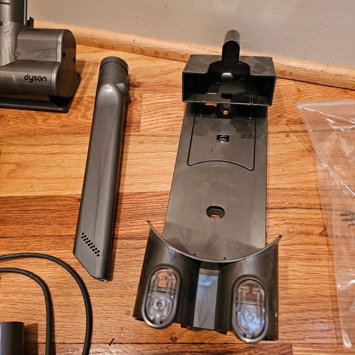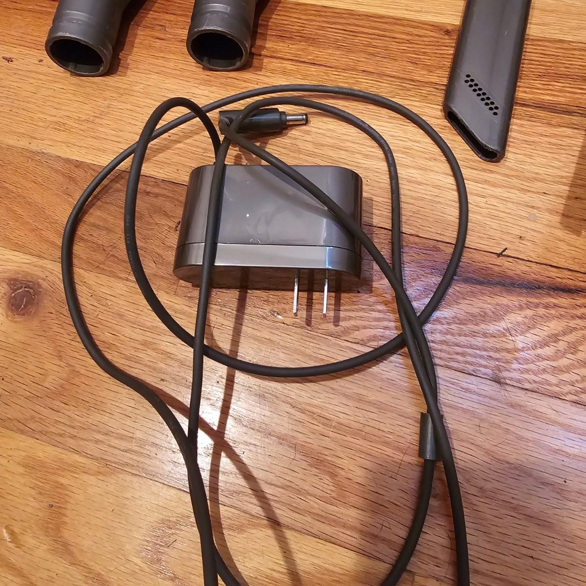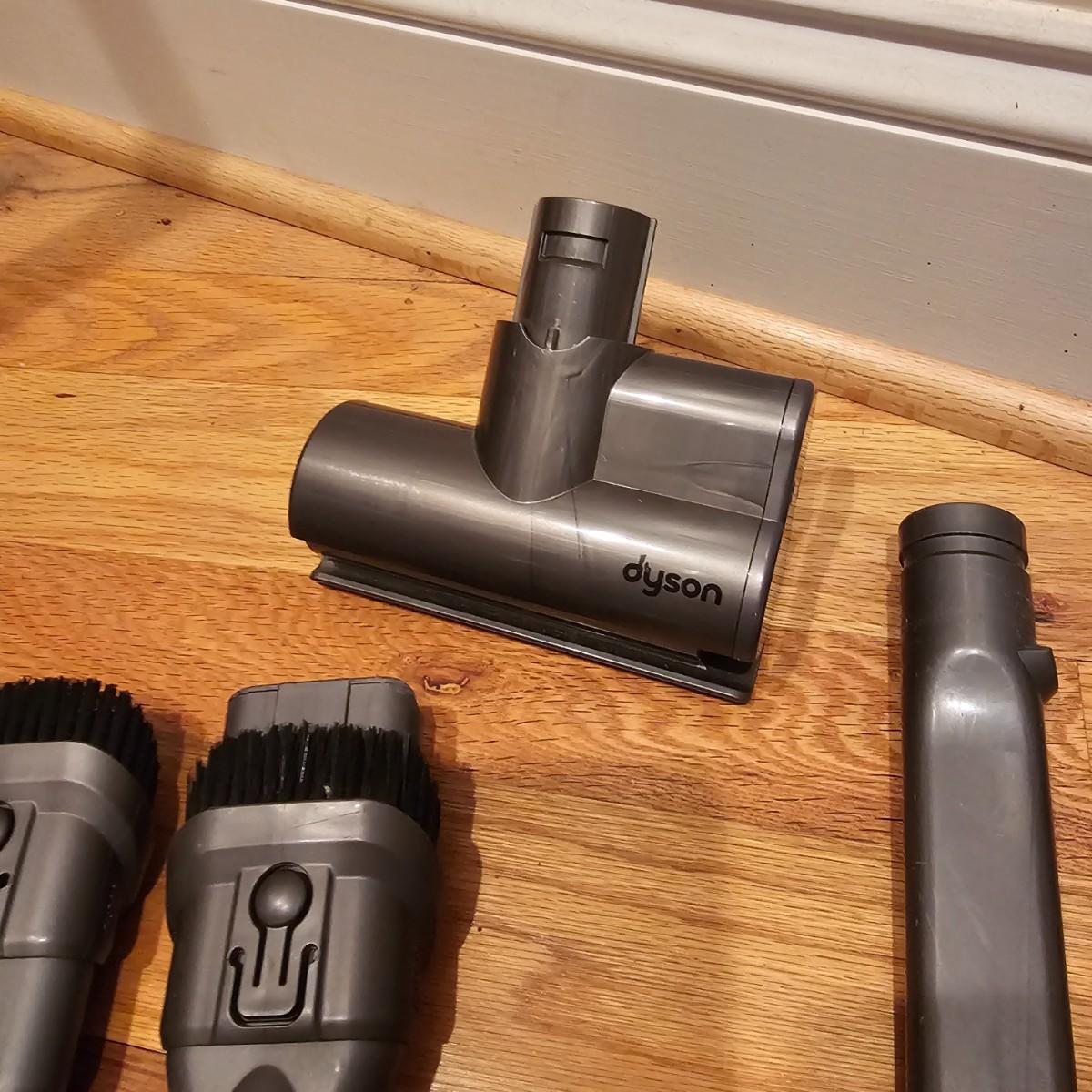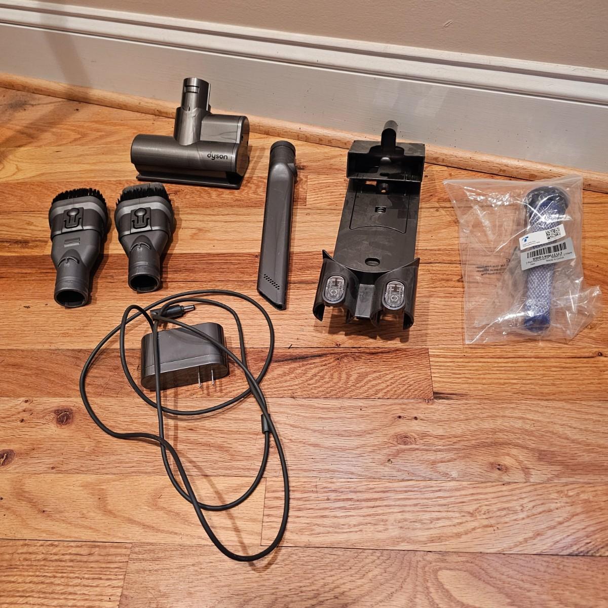 This cordless Dyson vacuum worked when tested and comes with manual, lots of different tools and a hanging bracket.
